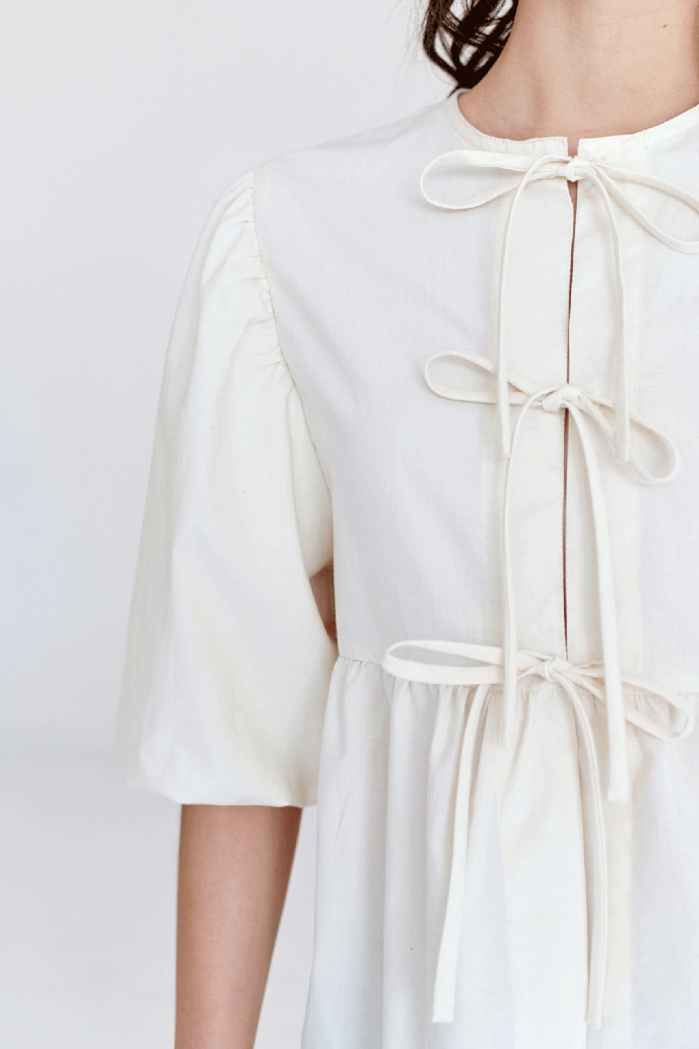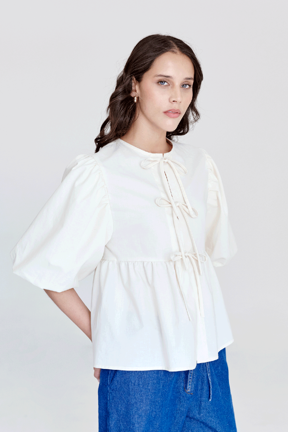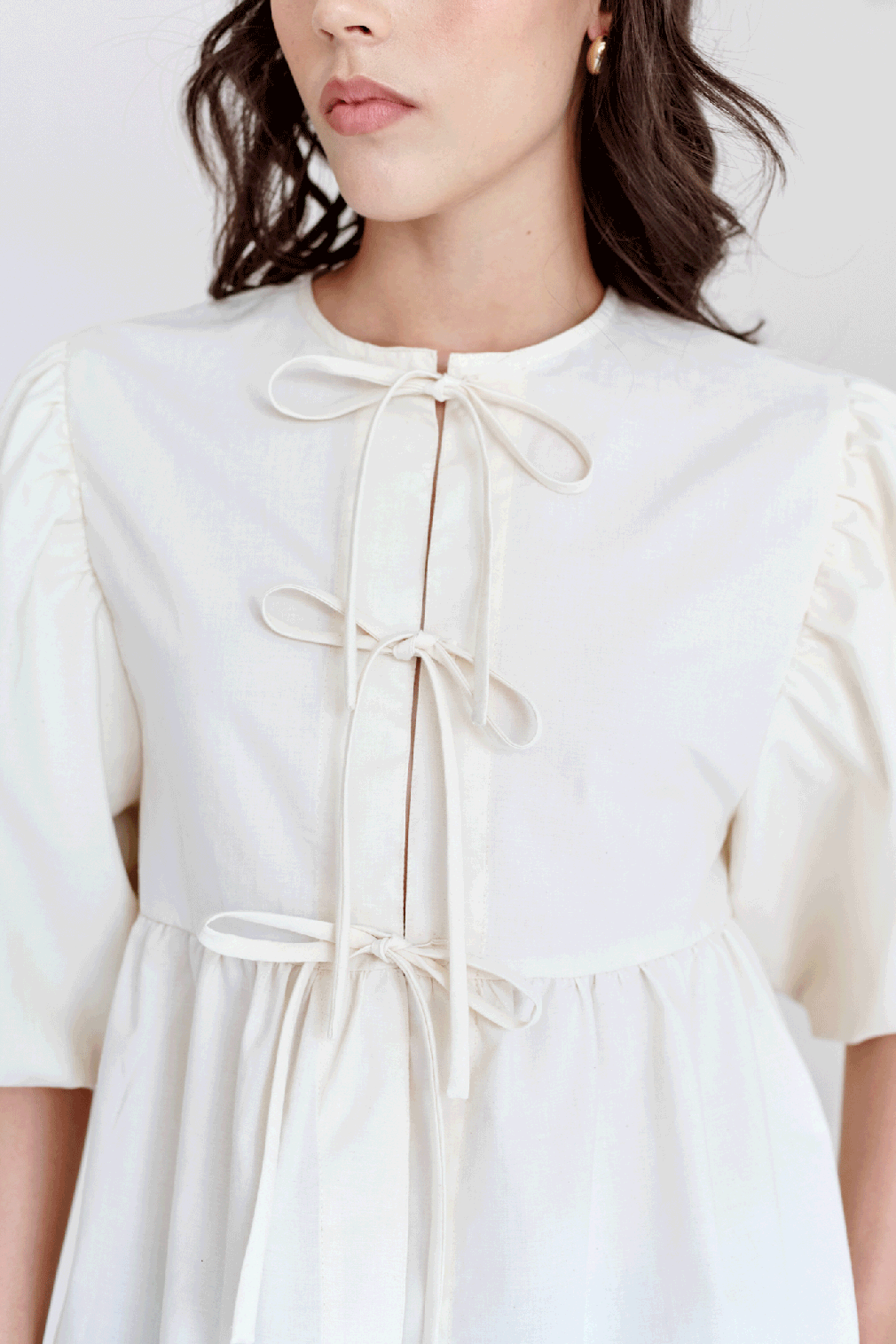 Camisa de manga aglobada y bordado. Lleva lazos en el centro delantero para amarrar.