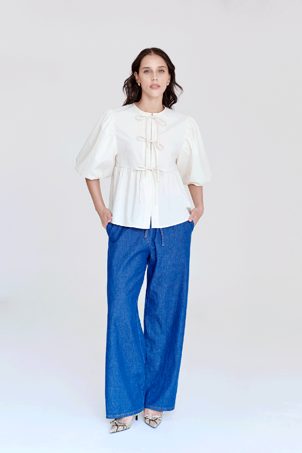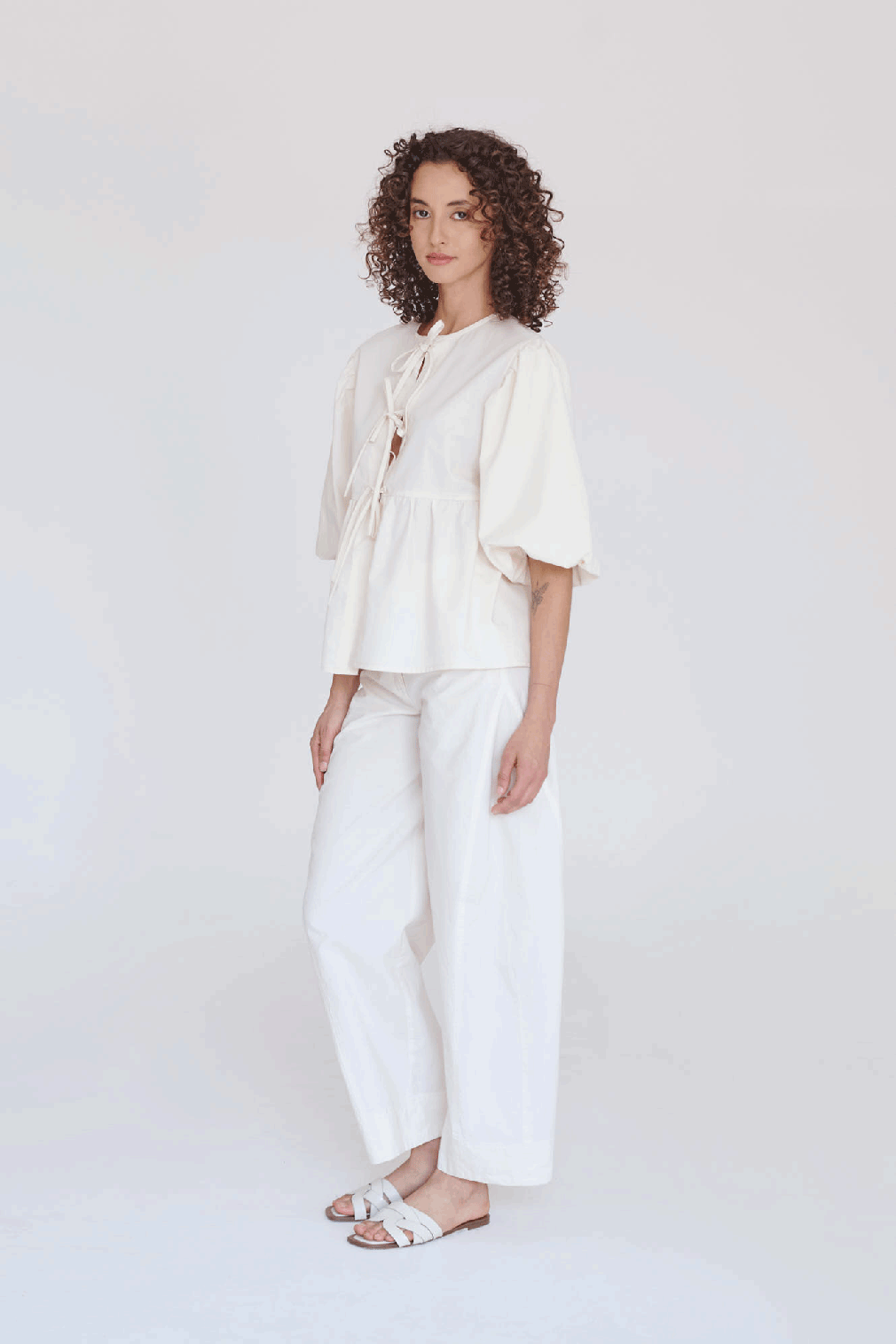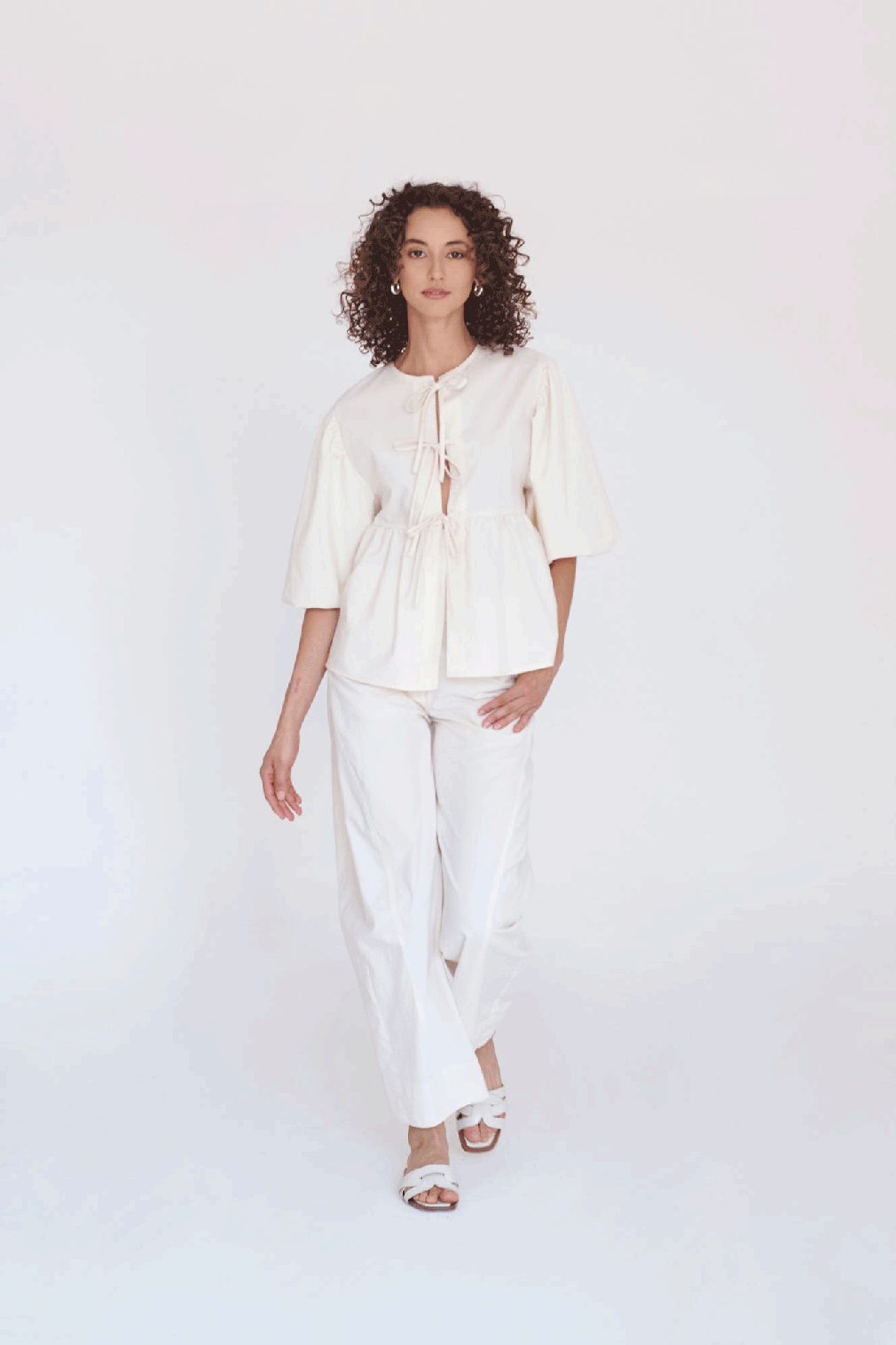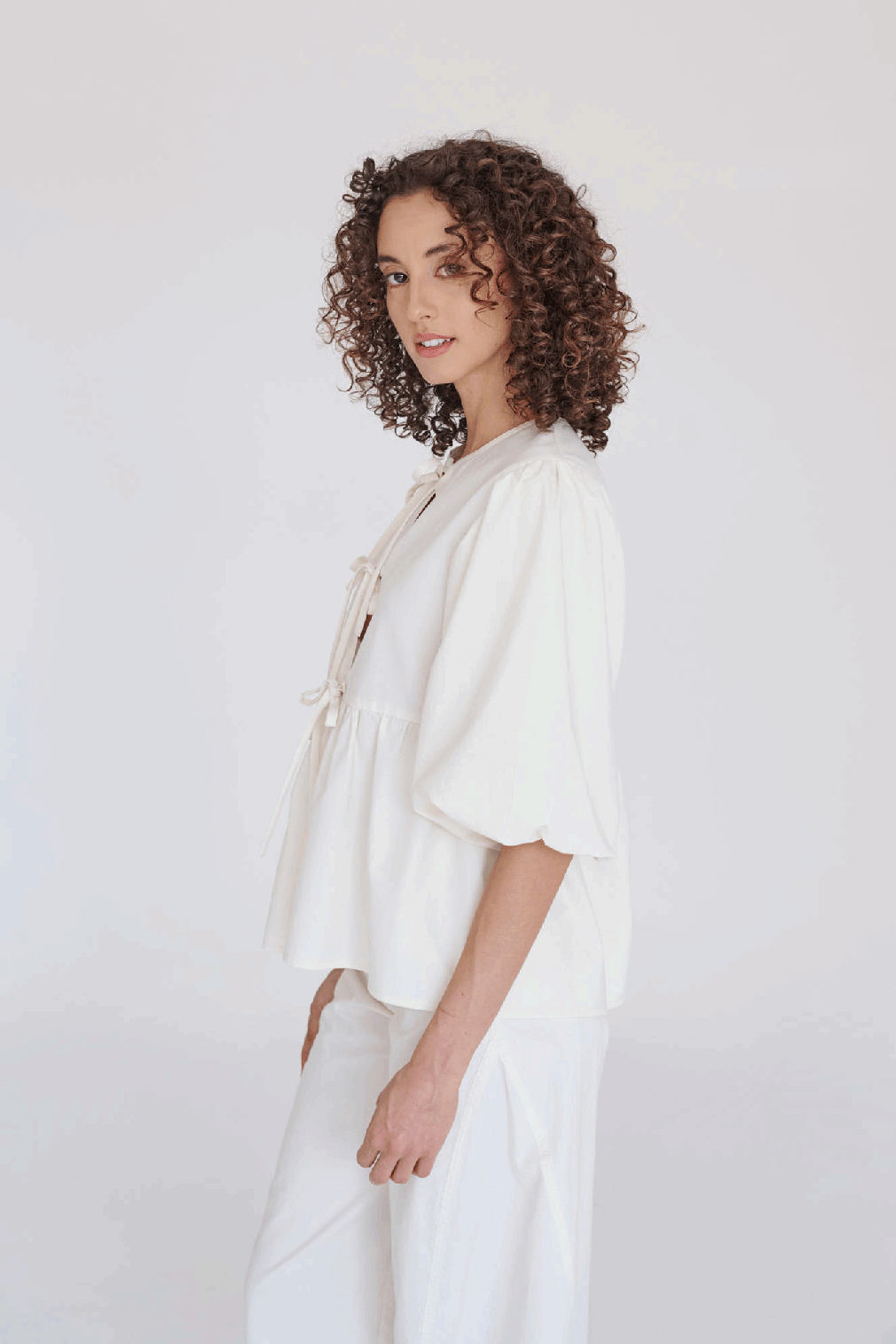 Camisa de manga aglobada y bordado. Lleva lazos en el centro delantero para amarrar.