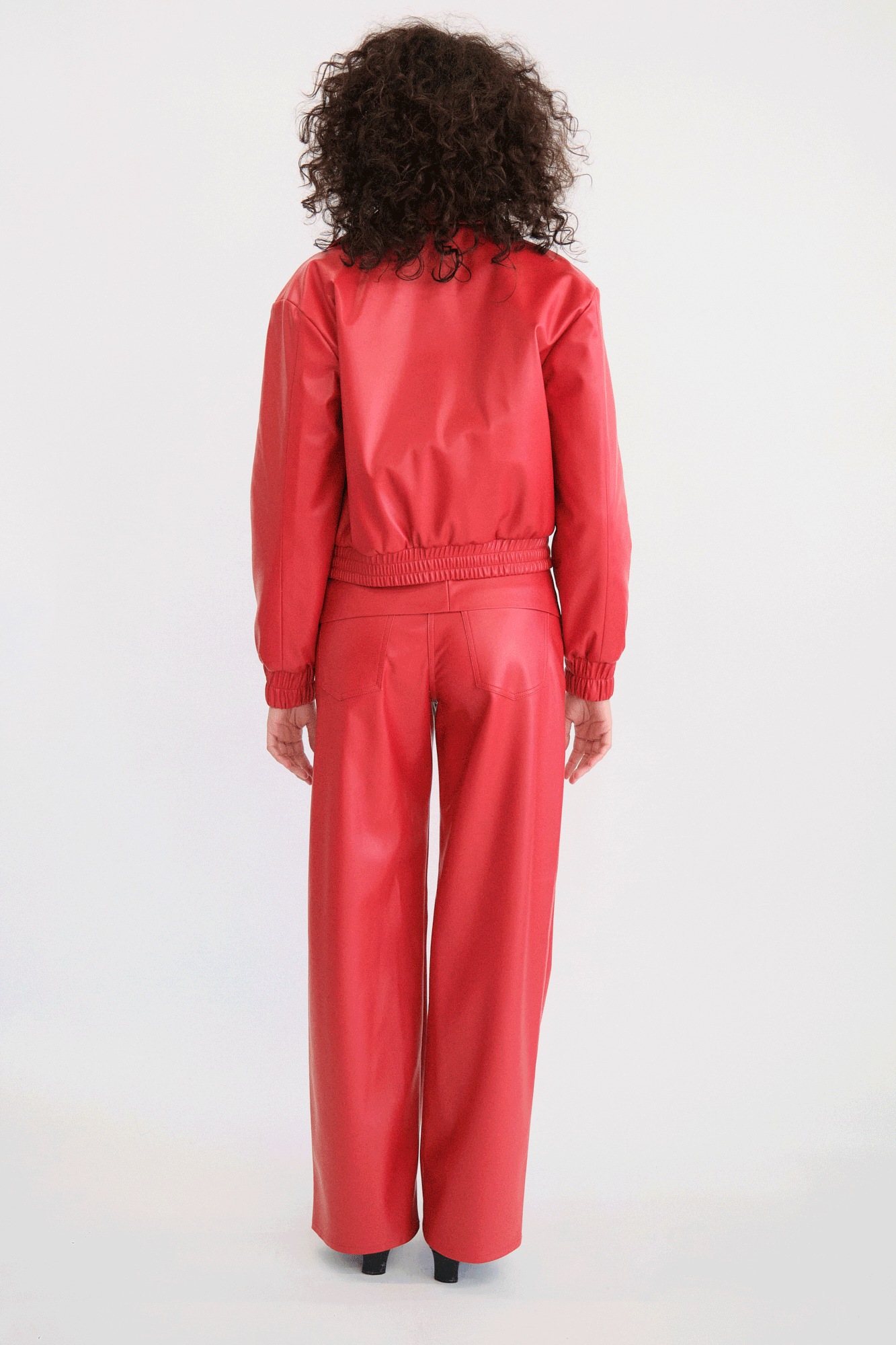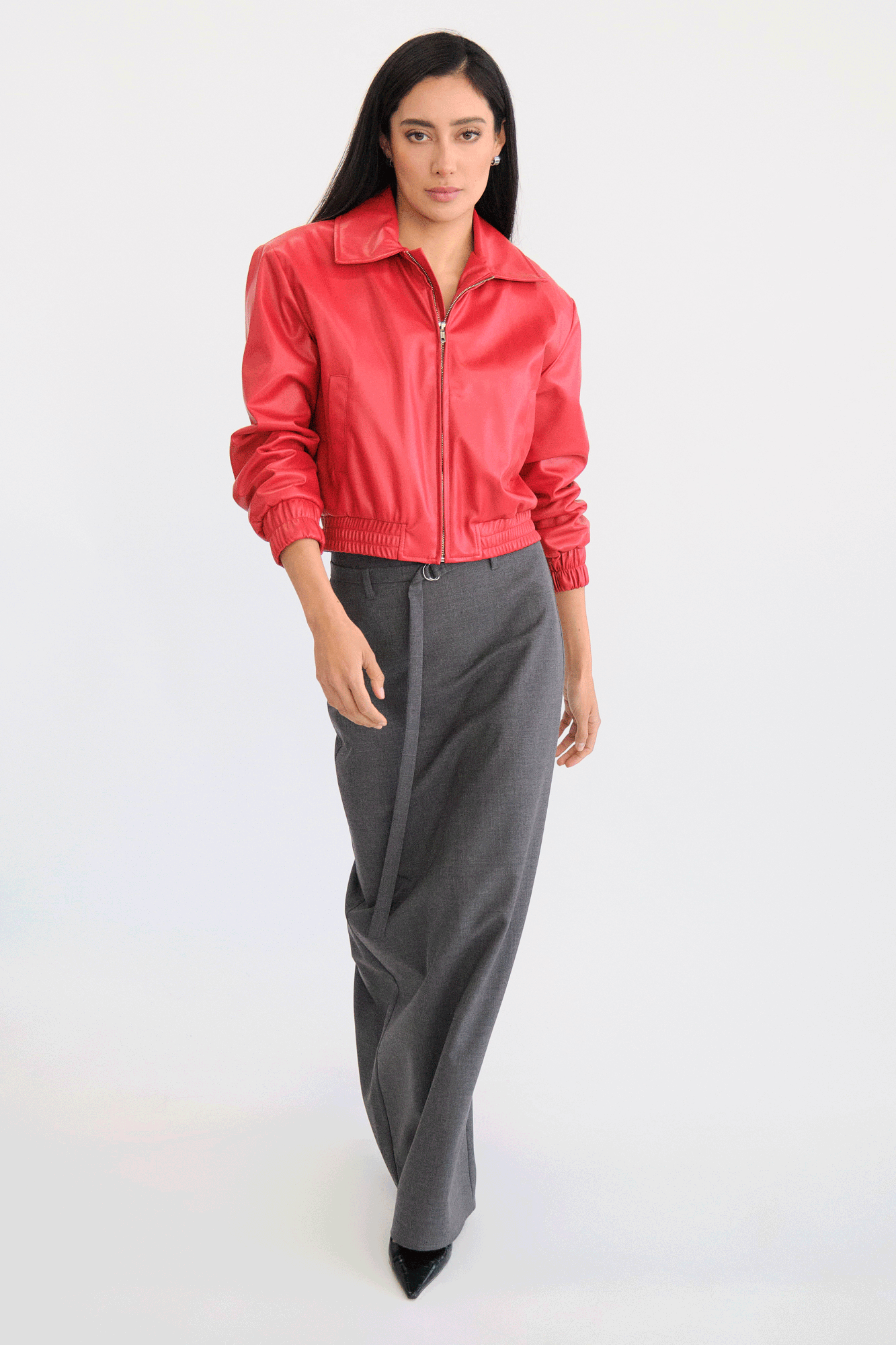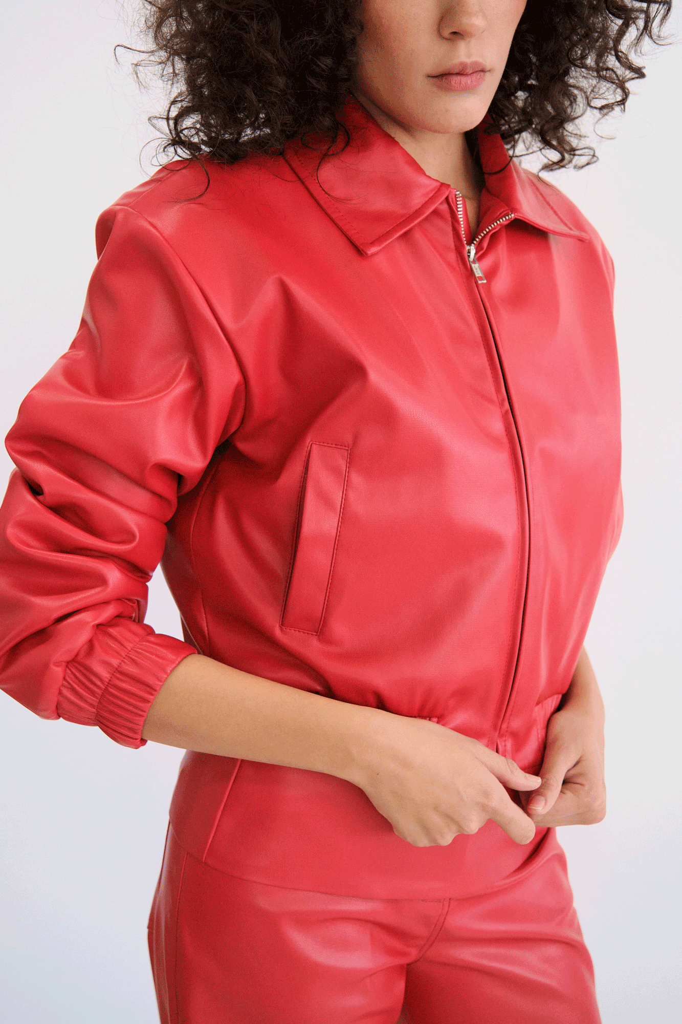 Chamarra bomber de piel vegana con cierre y hombreras.