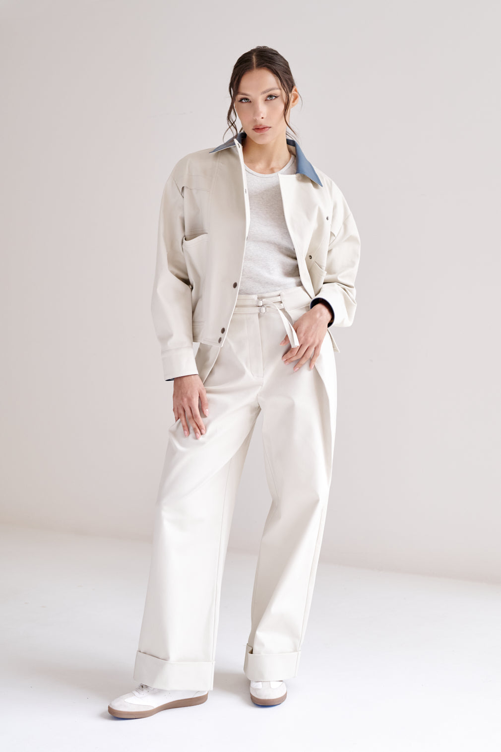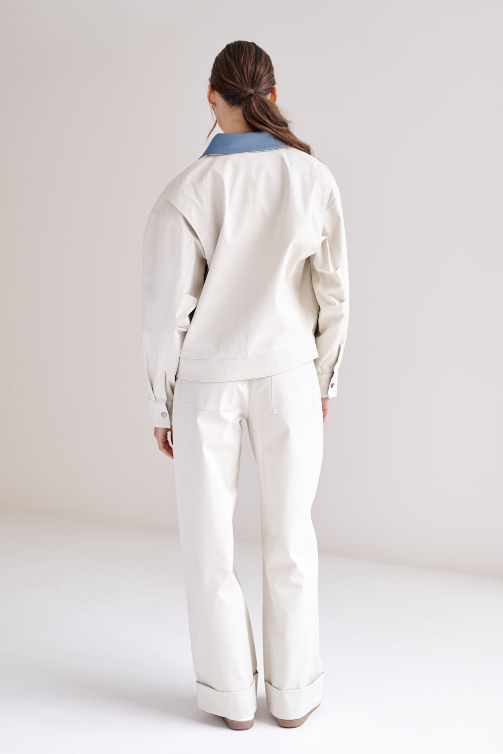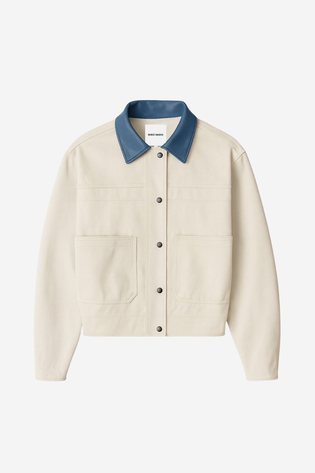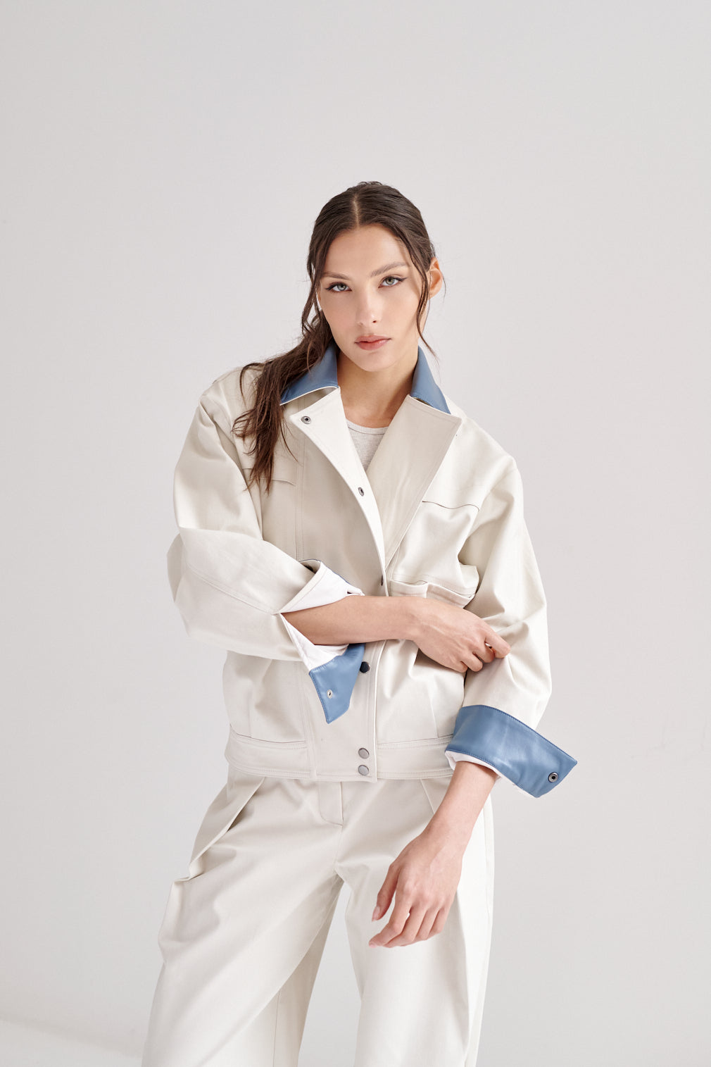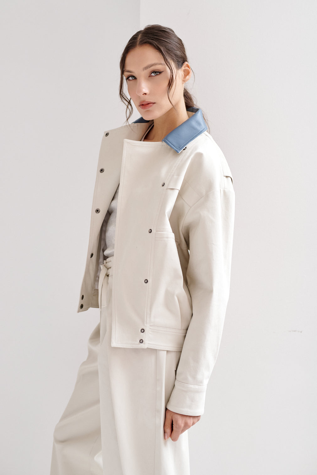 Chamarra estilo bomber oversized. El cuello y los puños están acabados en piel vegana (recubrimiento de poliuretano sobre base 100% poliéster), aportando contraste y durabilidad.