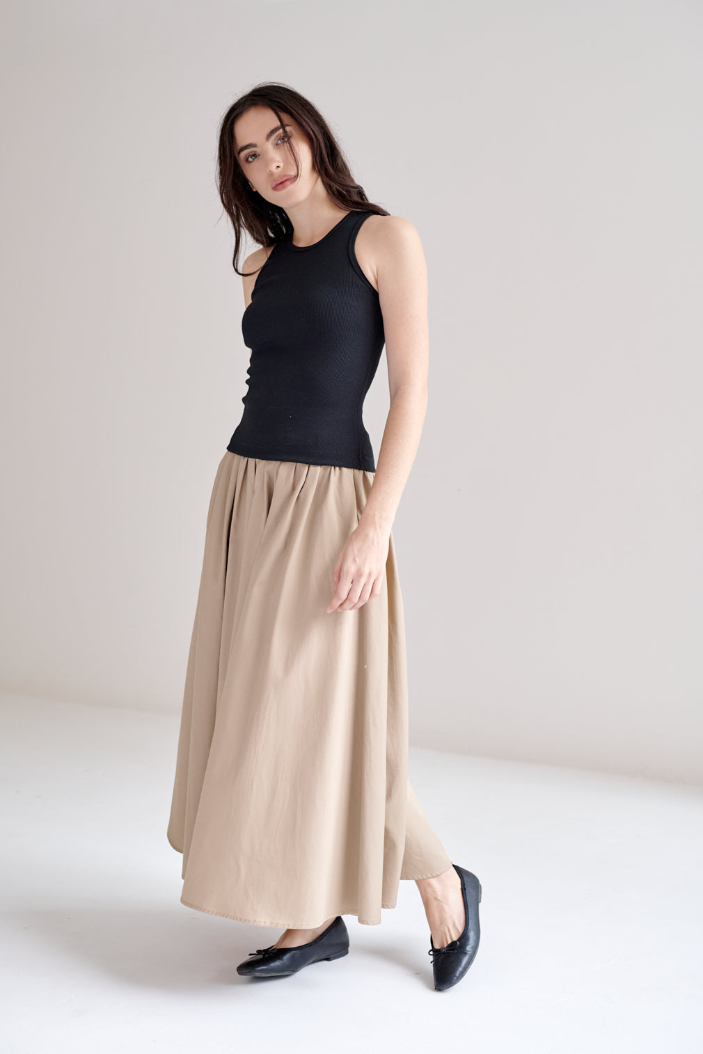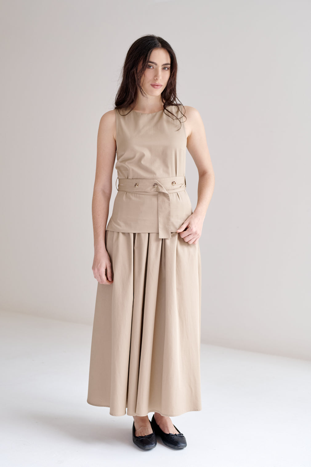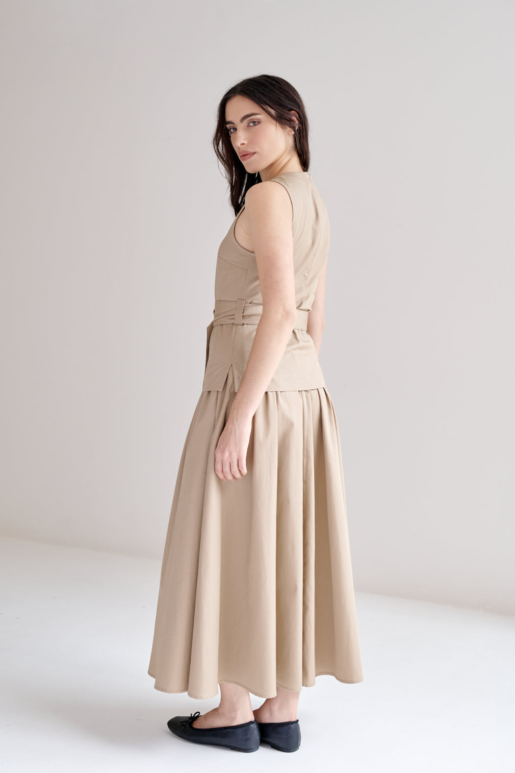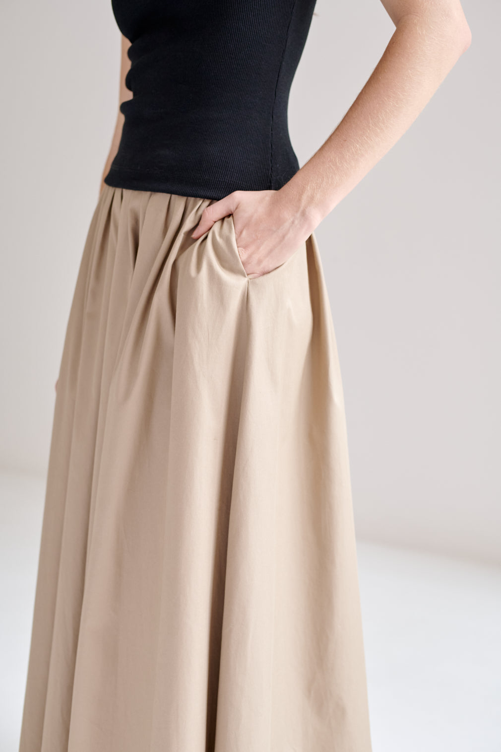 Falda midi tableada confeccionada en tejido de peso medio, con pliegues marcados y planchados que mantienen la estructura y aportan movimiento al caminar. Presenta tiro medio/alto para un ajuste favorecedor en la cintura, bolsillos laterales funcionales discretamente integrados en las costuras para conservar la línea del diseño y pretina reforzada.