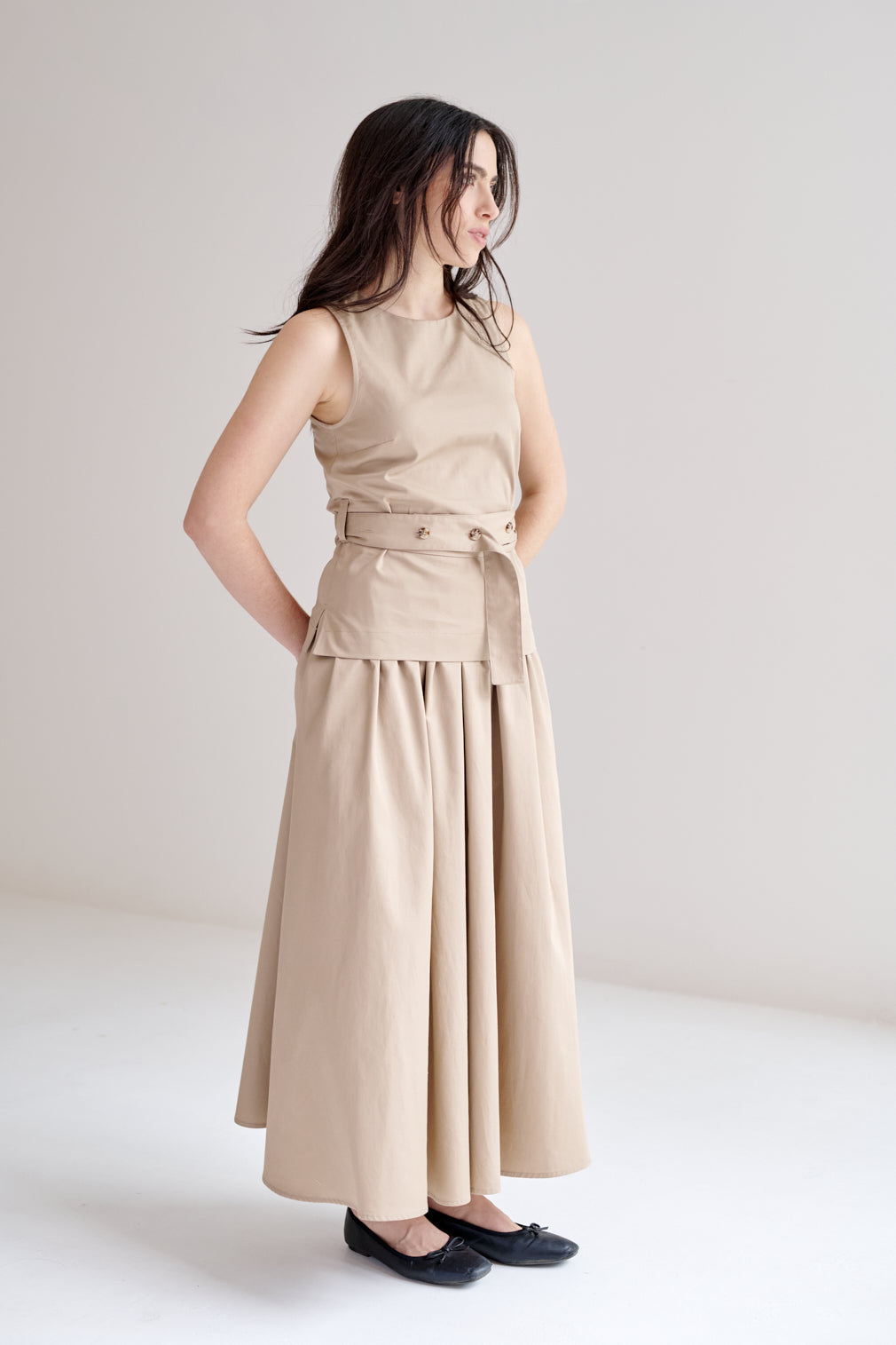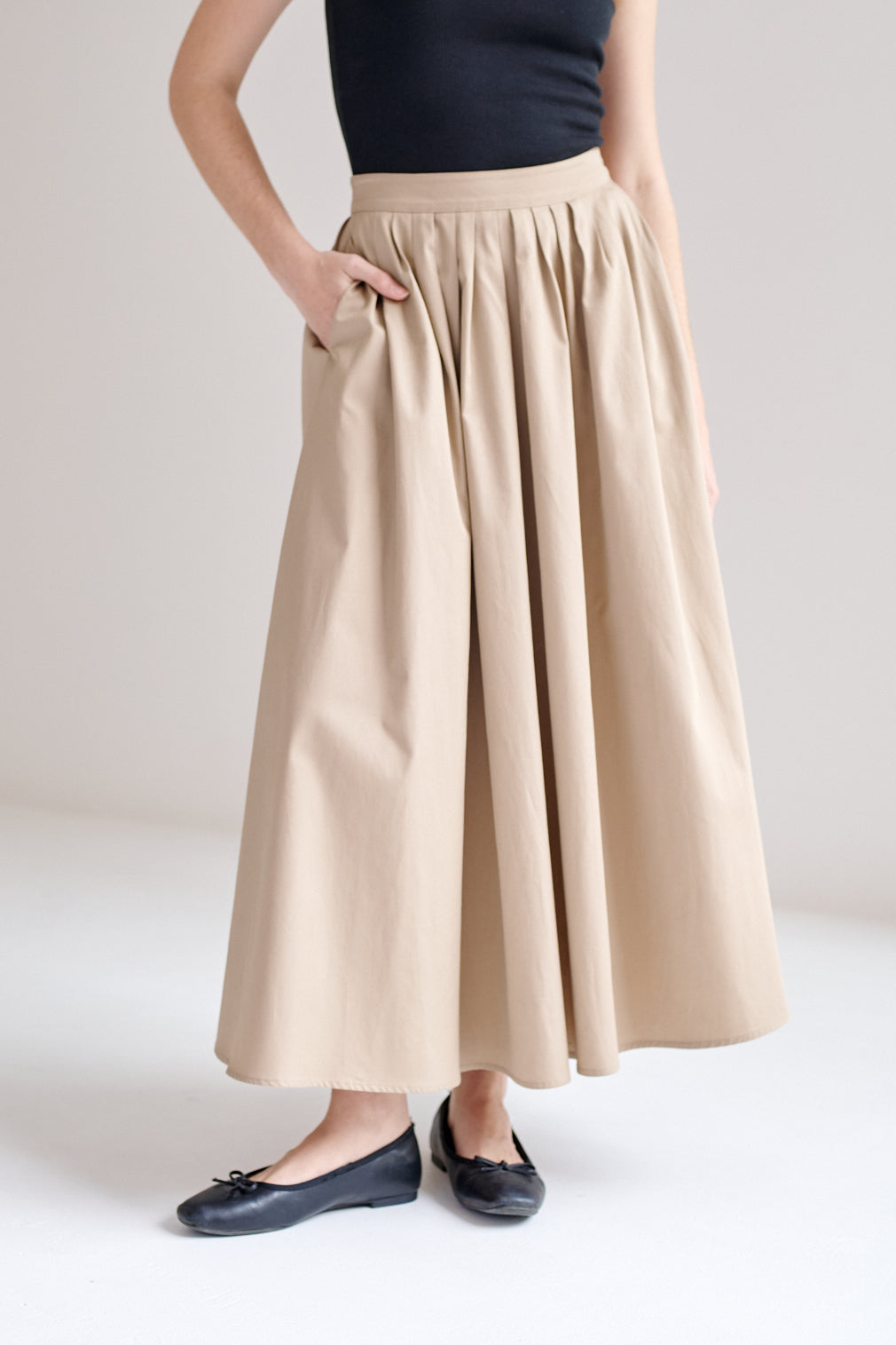 Falda midi tableada con pliegues definidos y bolsillos laterales funcionales.