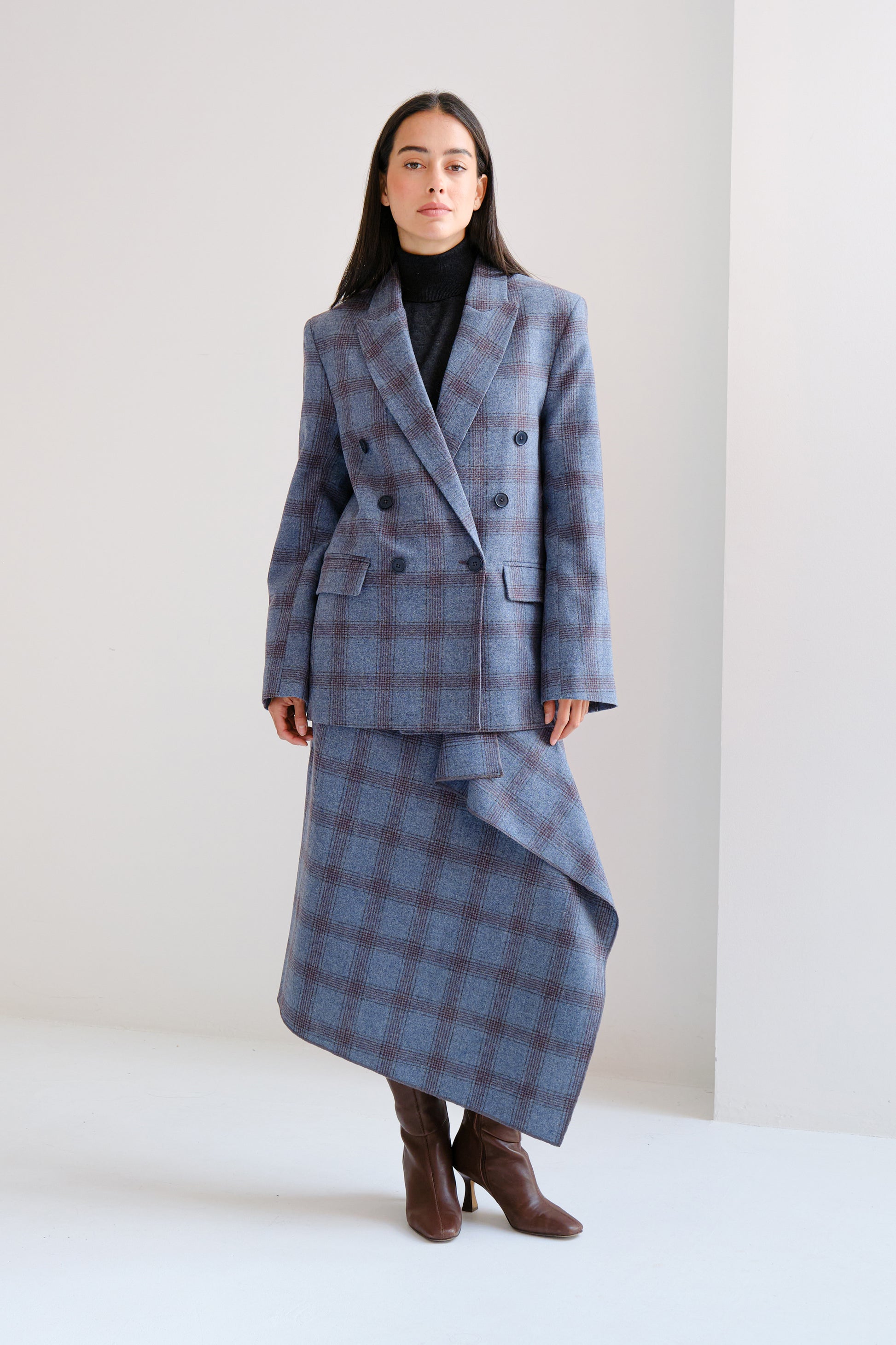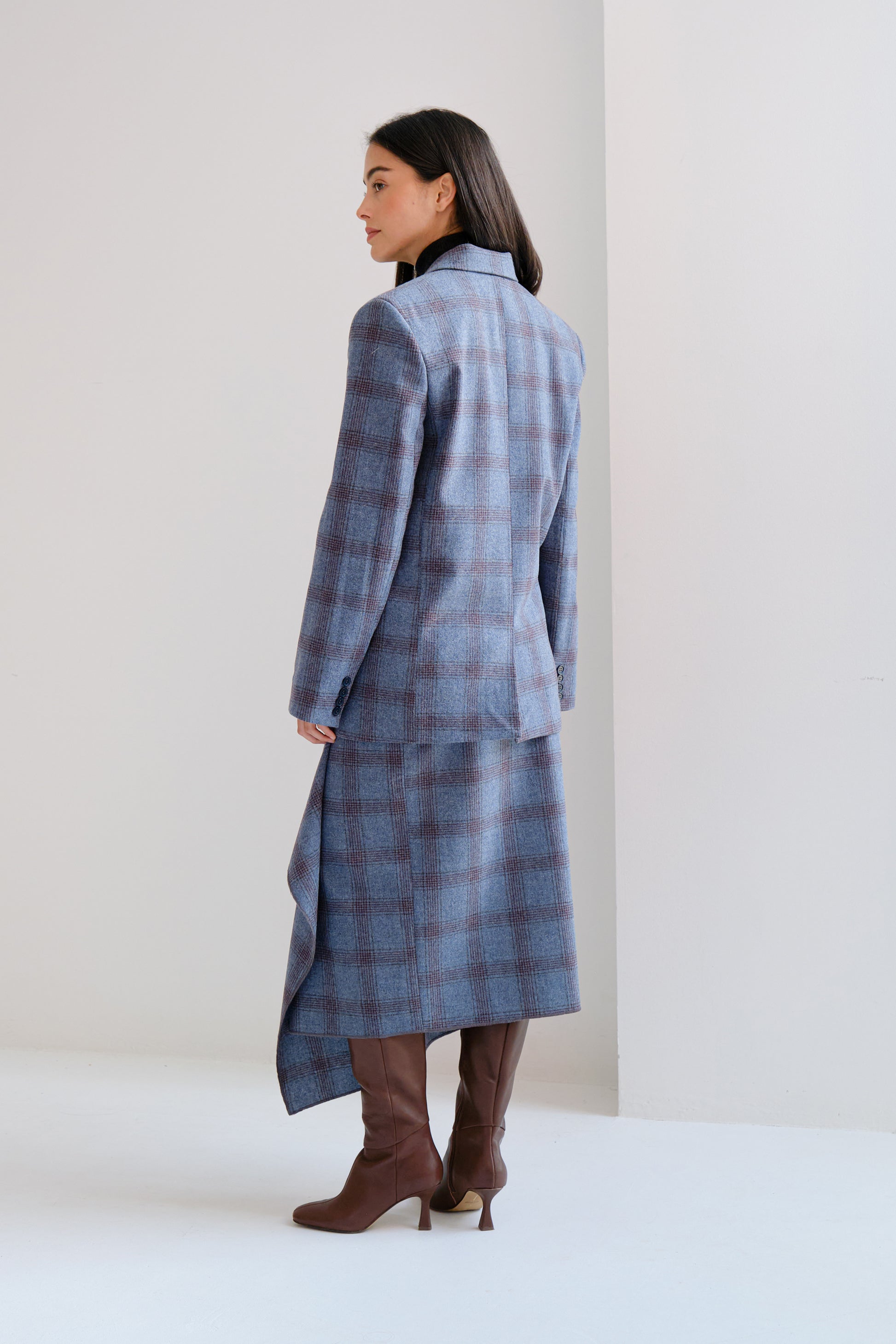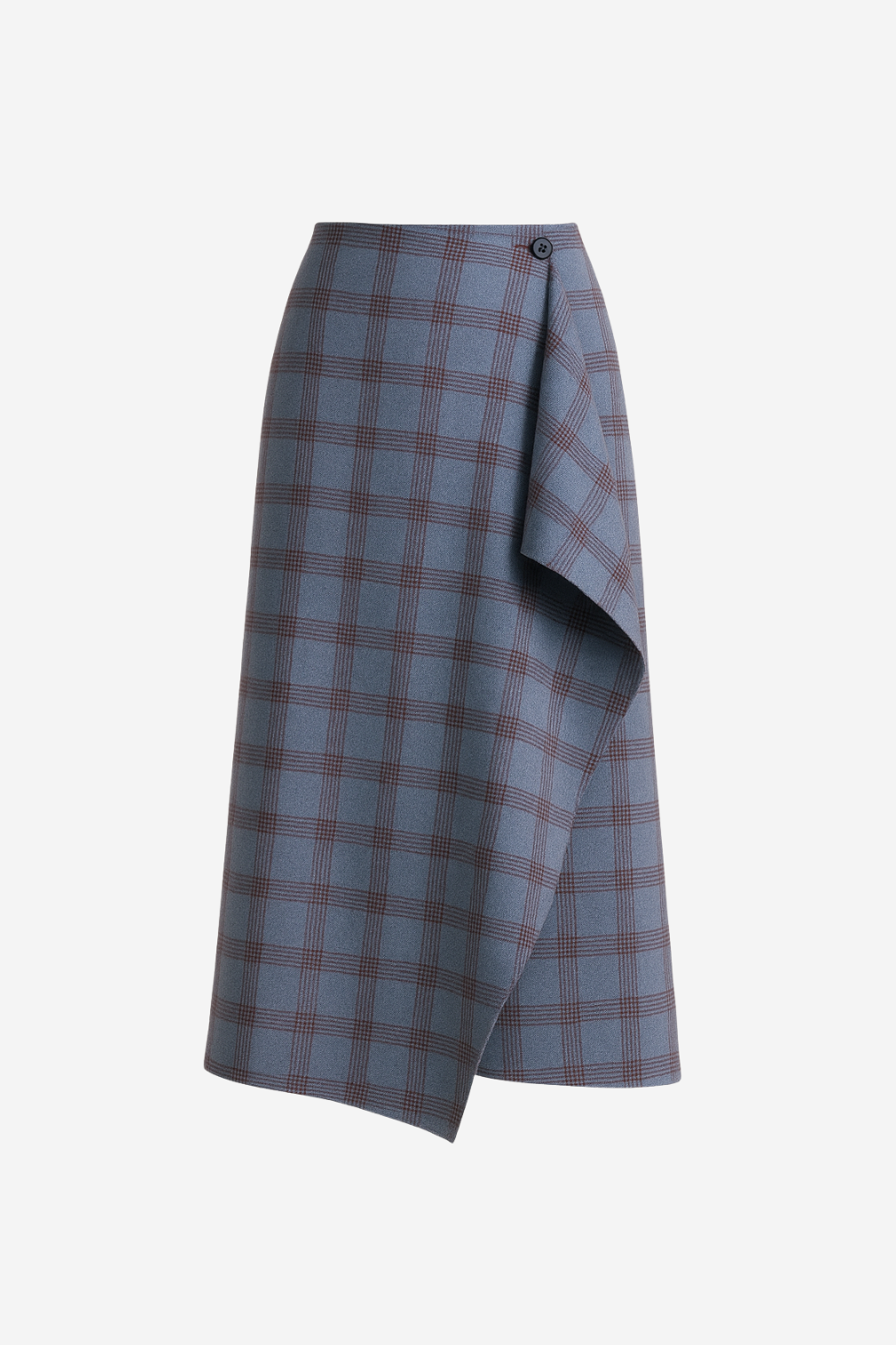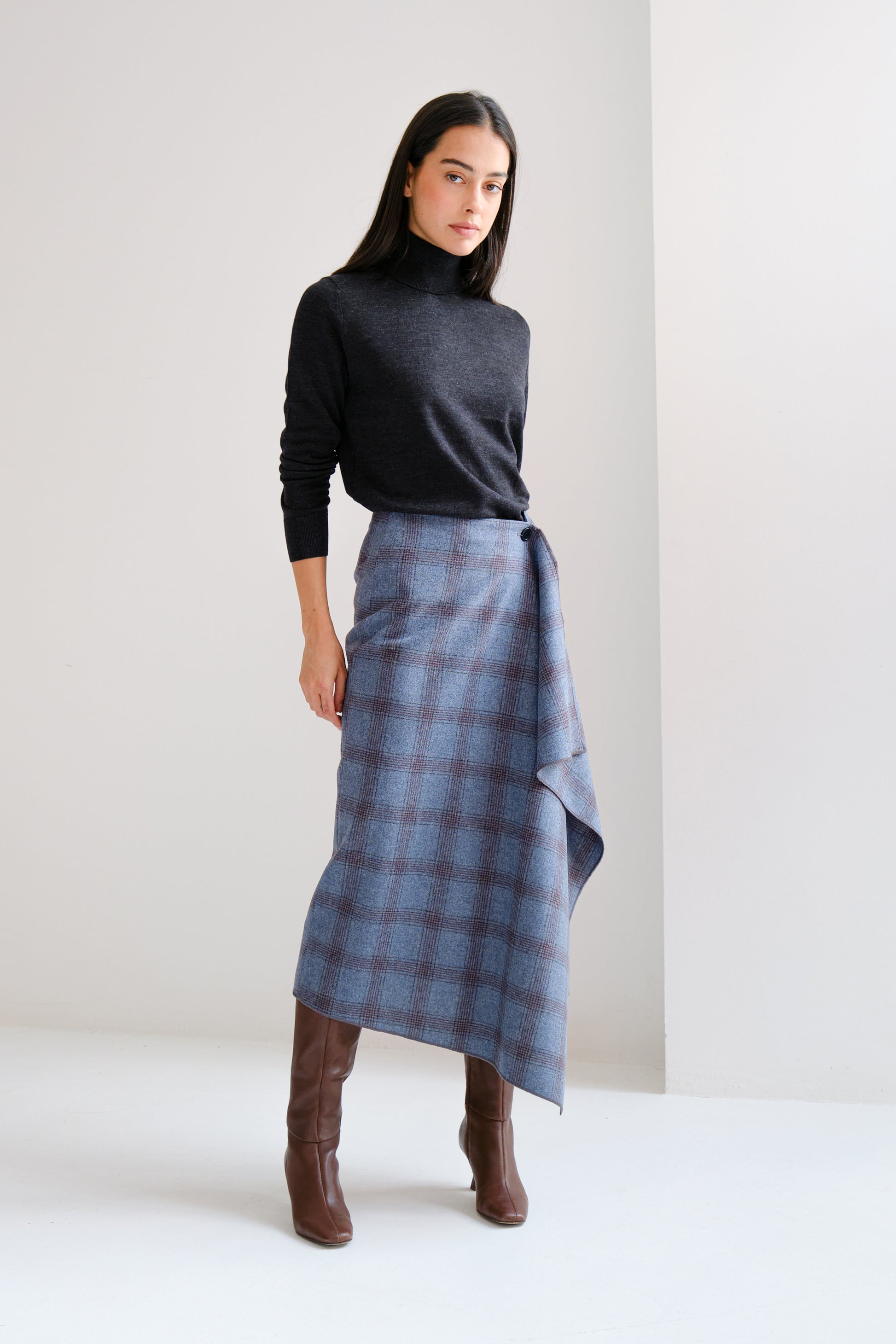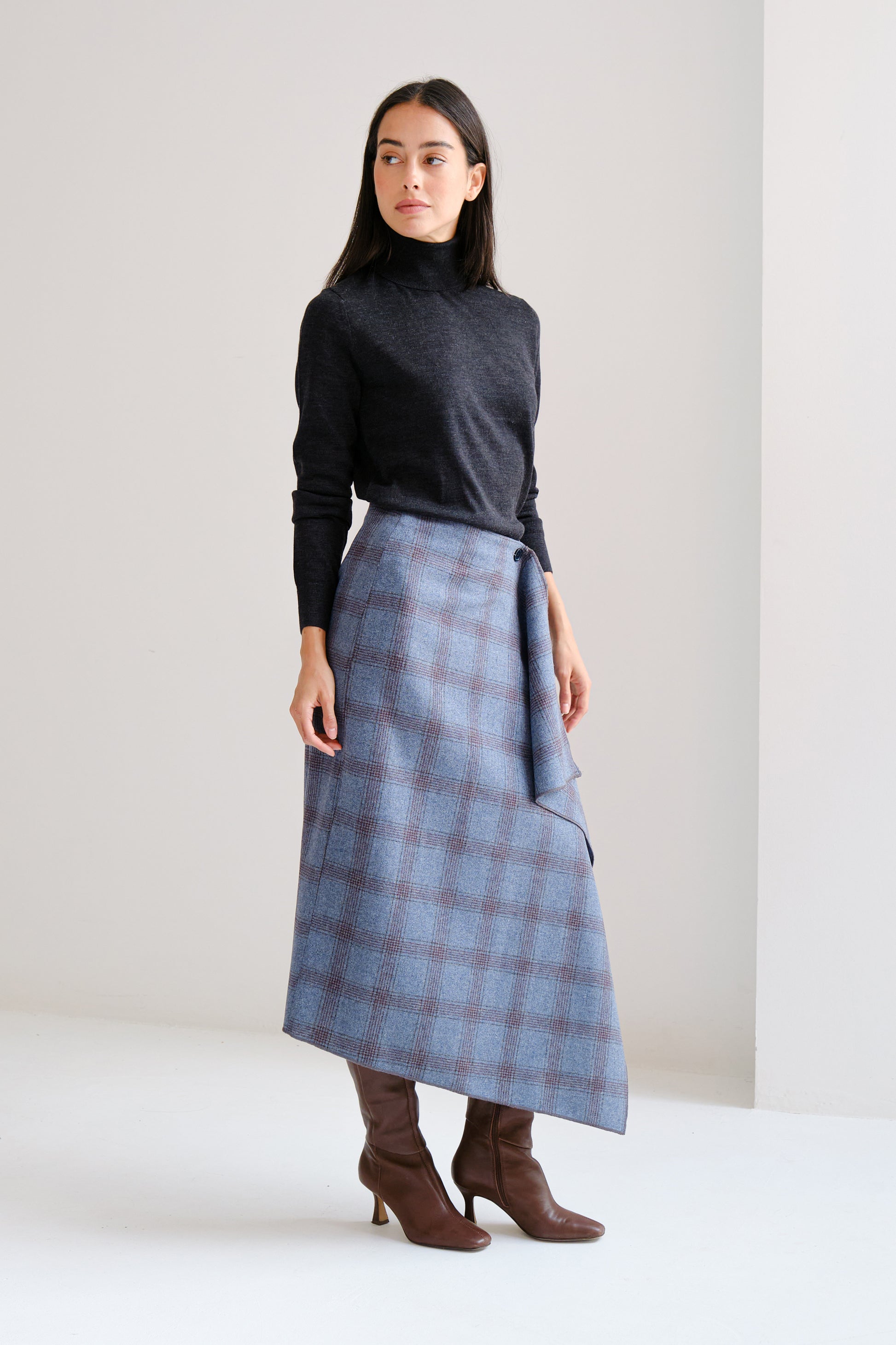 Falda midi cruzada confeccionada en lana con patrón de cuadros azul y líneas color vino. Presenta un diseño envolvente con cierre lateral mediante botón y un panel superpuesto