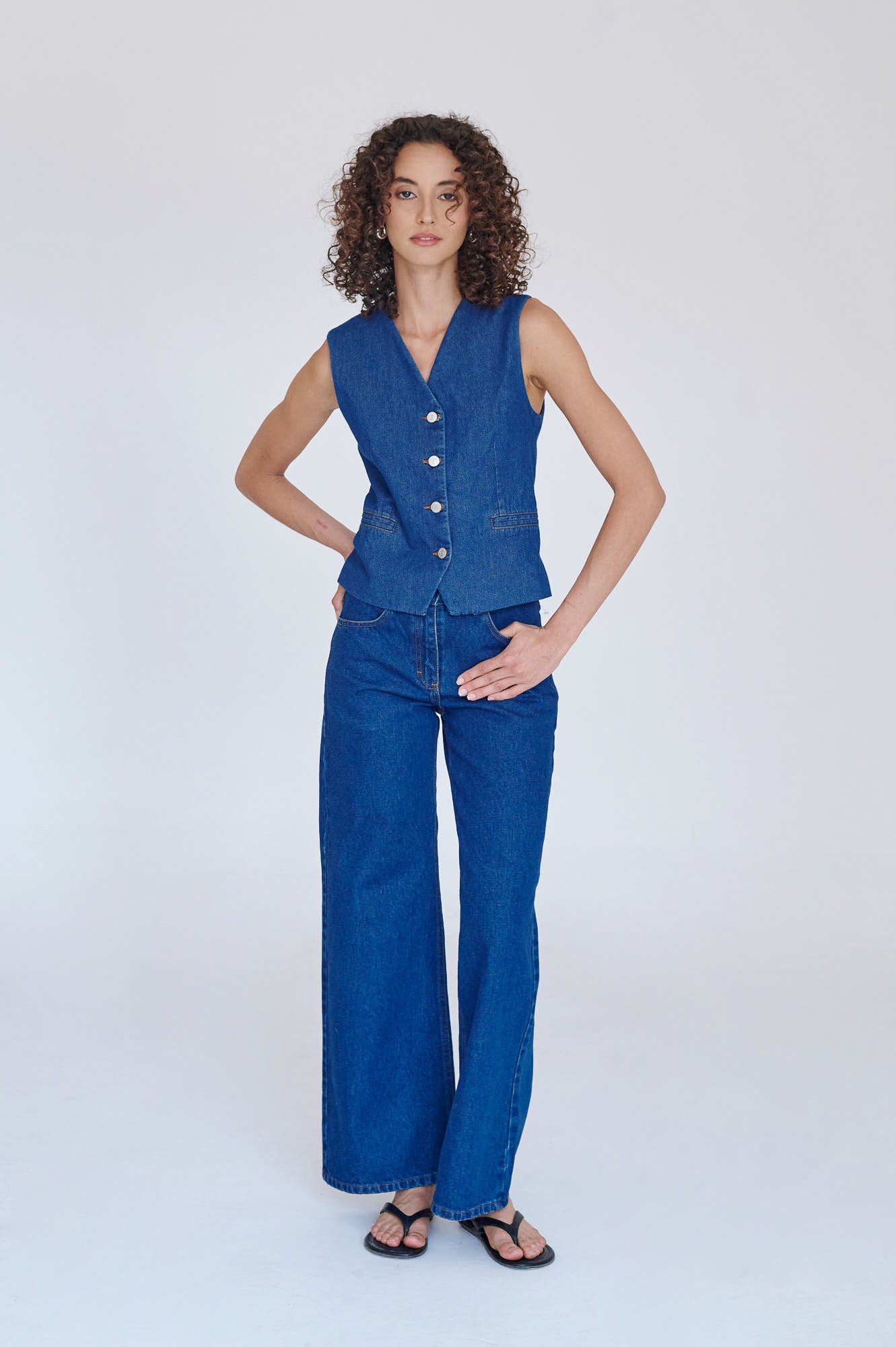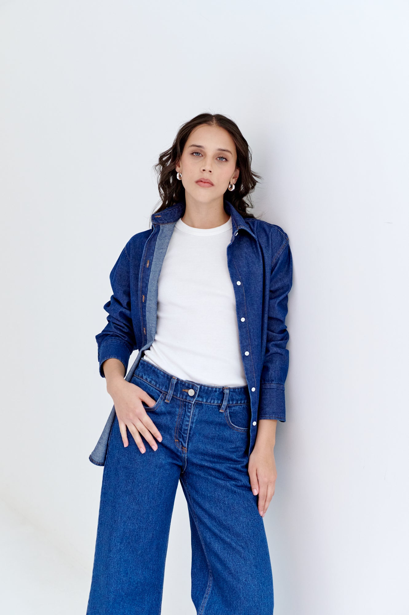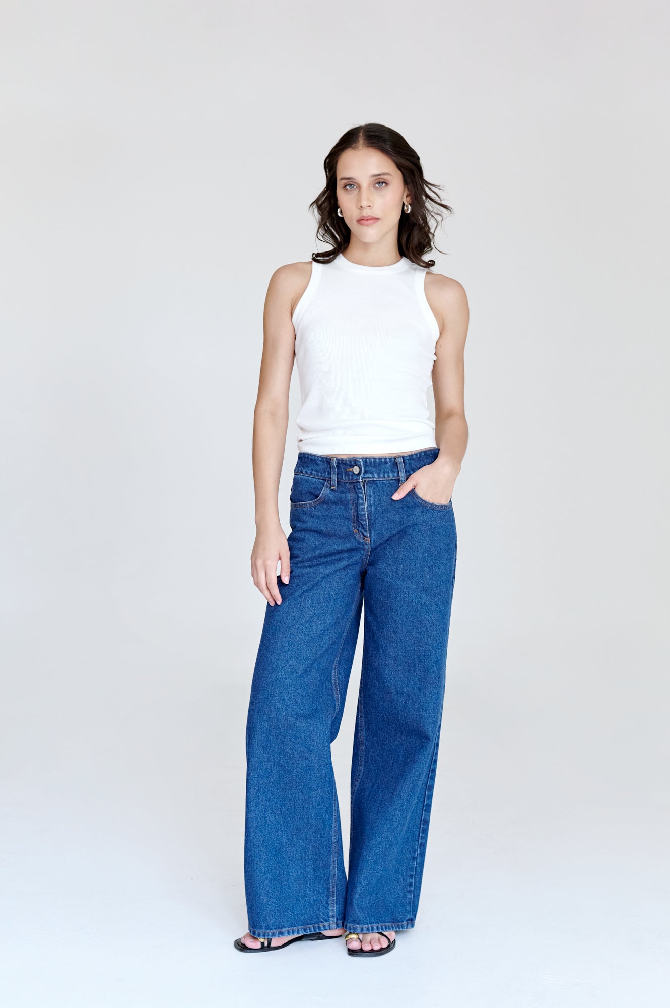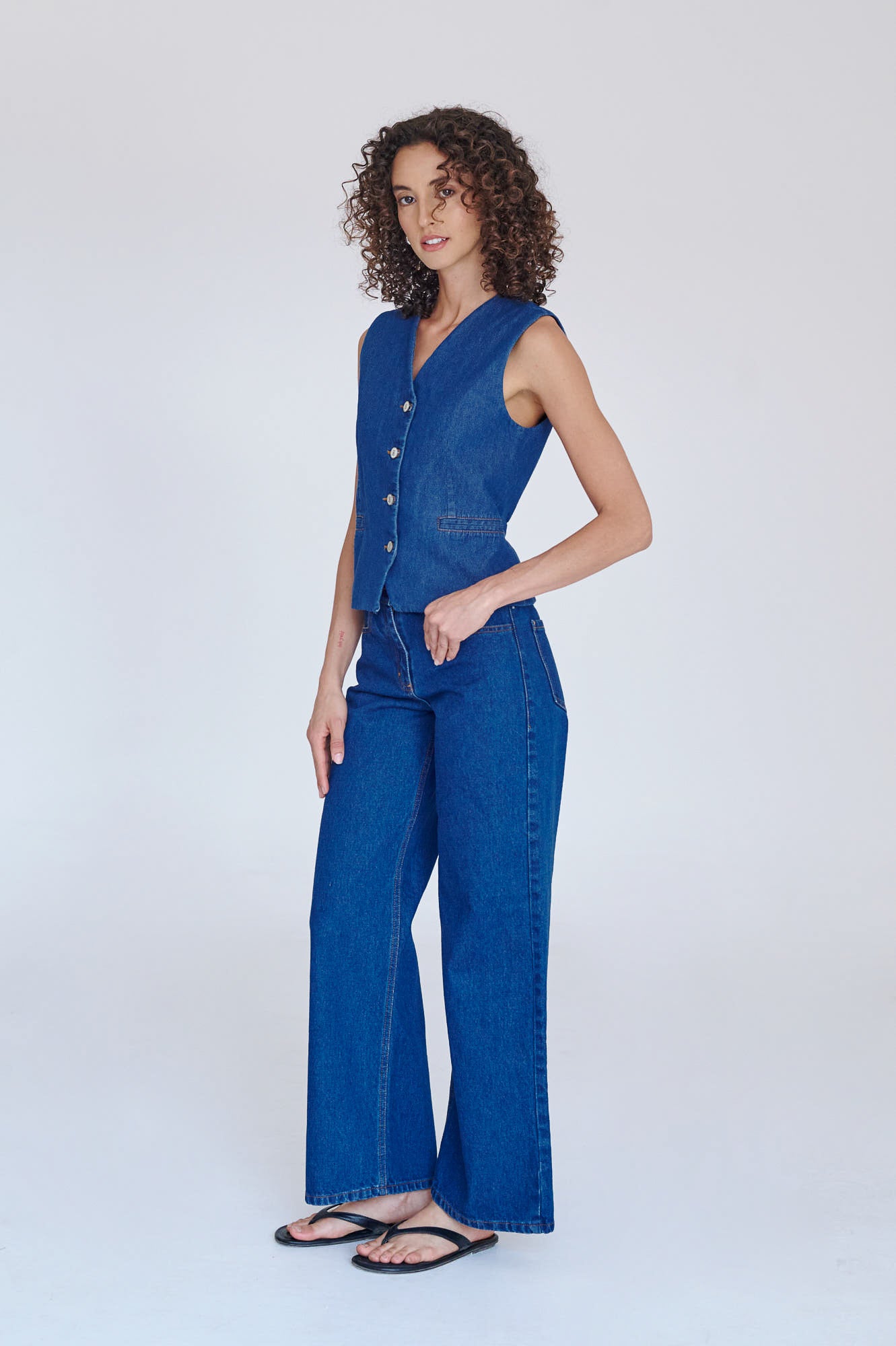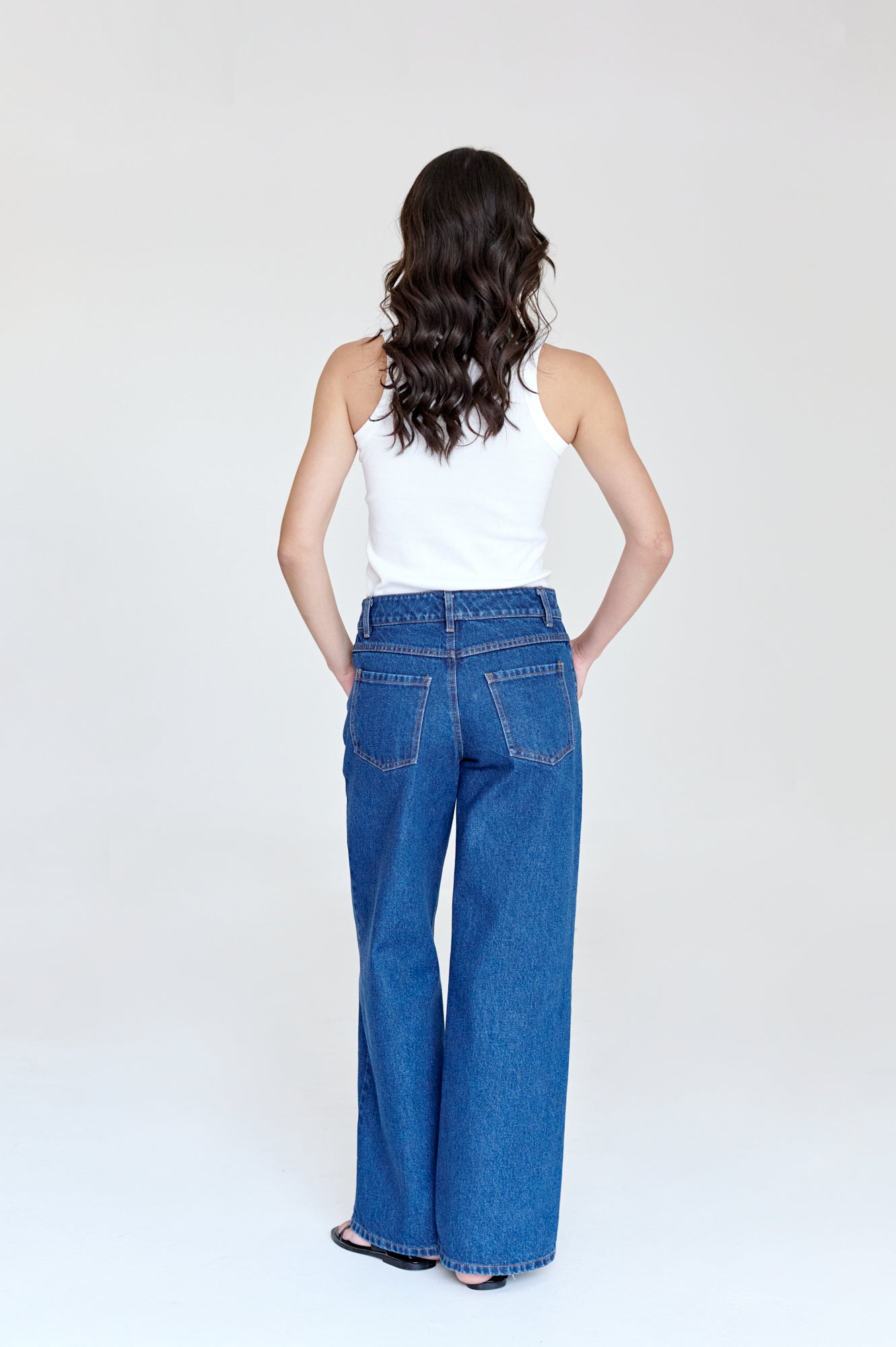 Pantalón mezclilla de pierna ancha. Con construcción de pantalón vaquero. Fit 3/4 a la cadera.