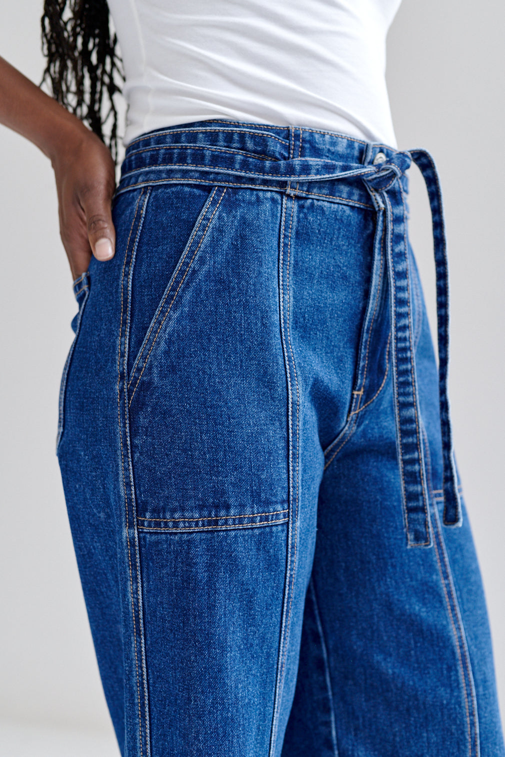 Jeans de tiro alto y corte recto con estructura marcada y paneles al frente que alargan la silueta. Cinturón para ajustar la cintura y costuras visibles que definen el fit.