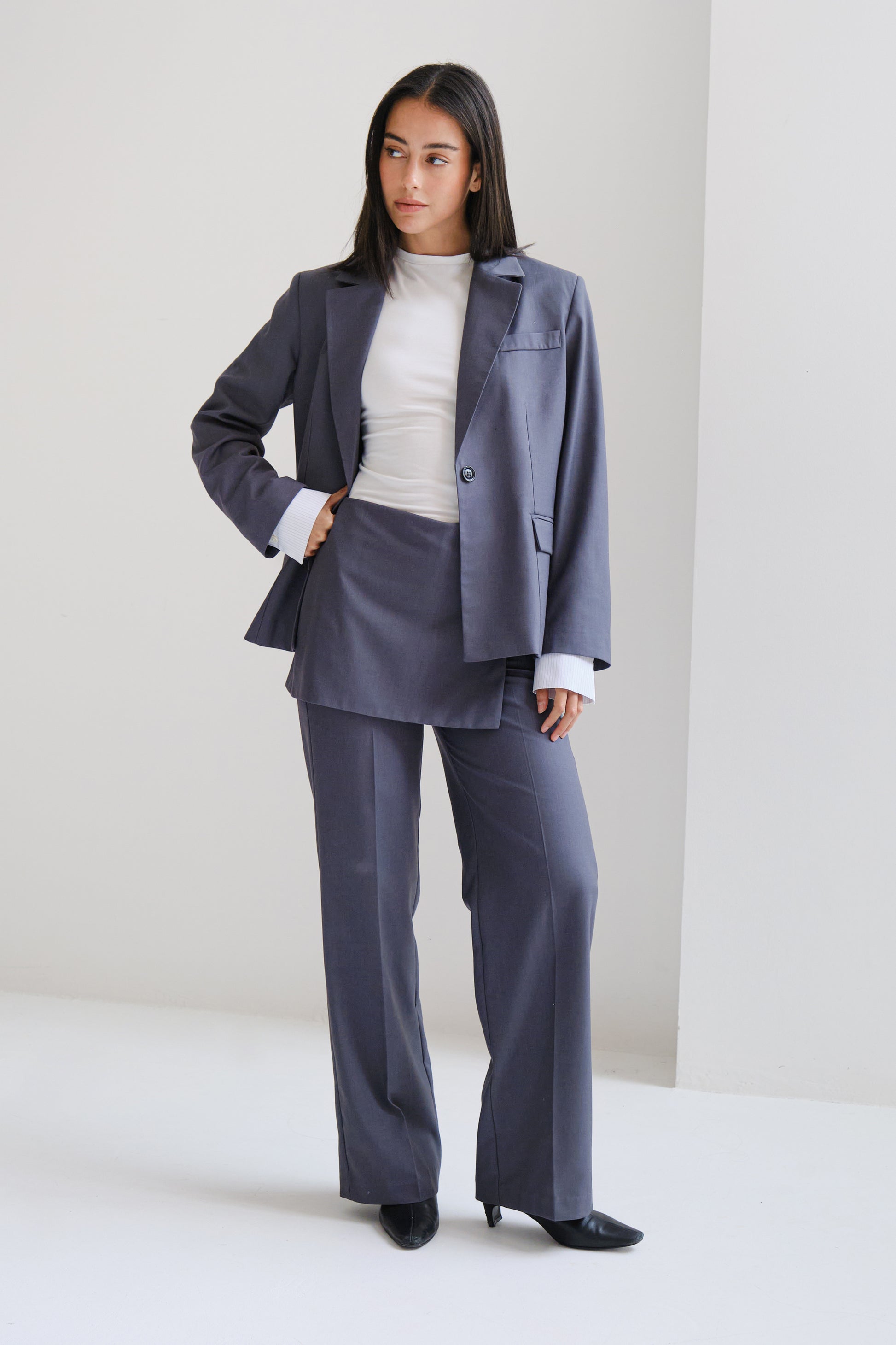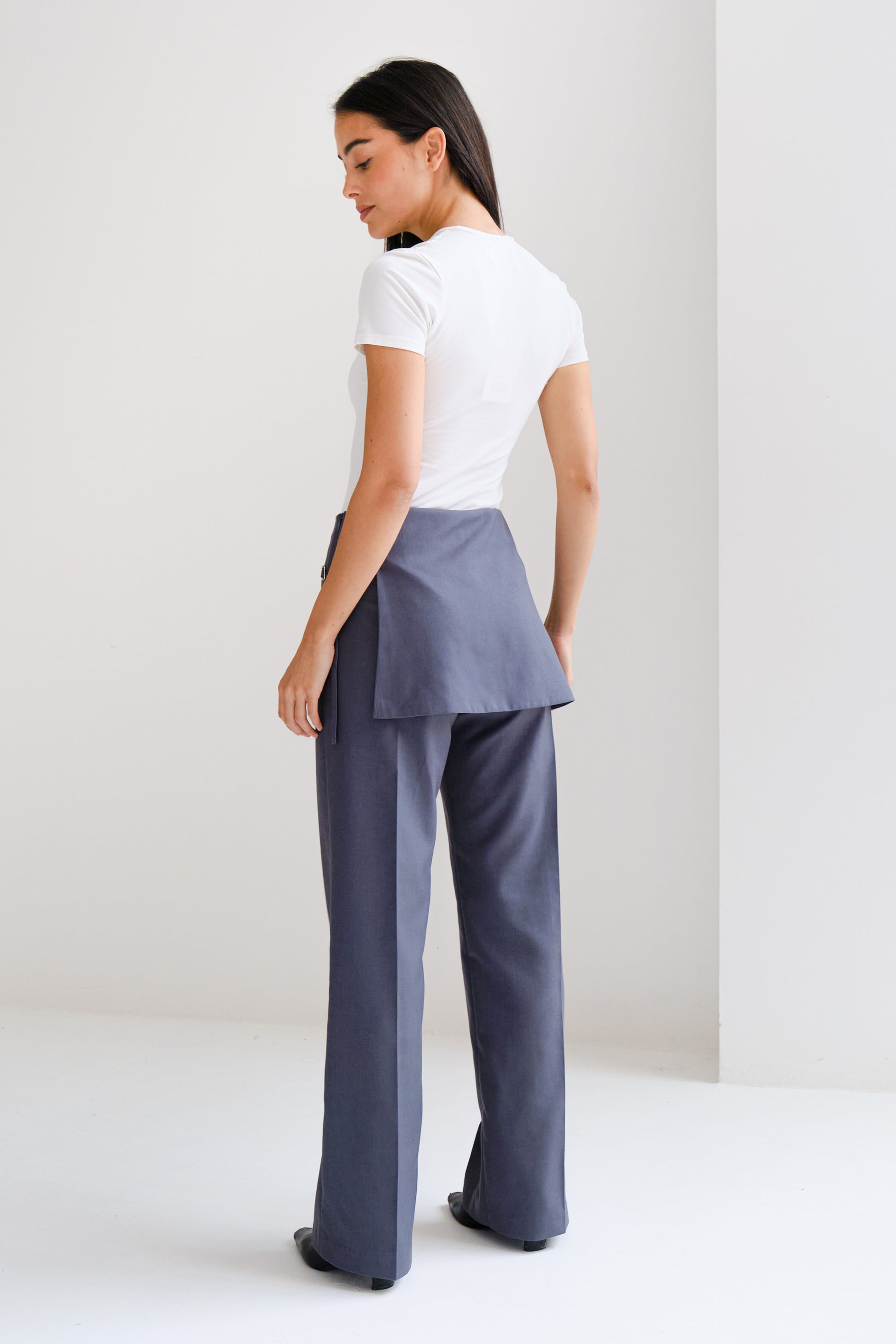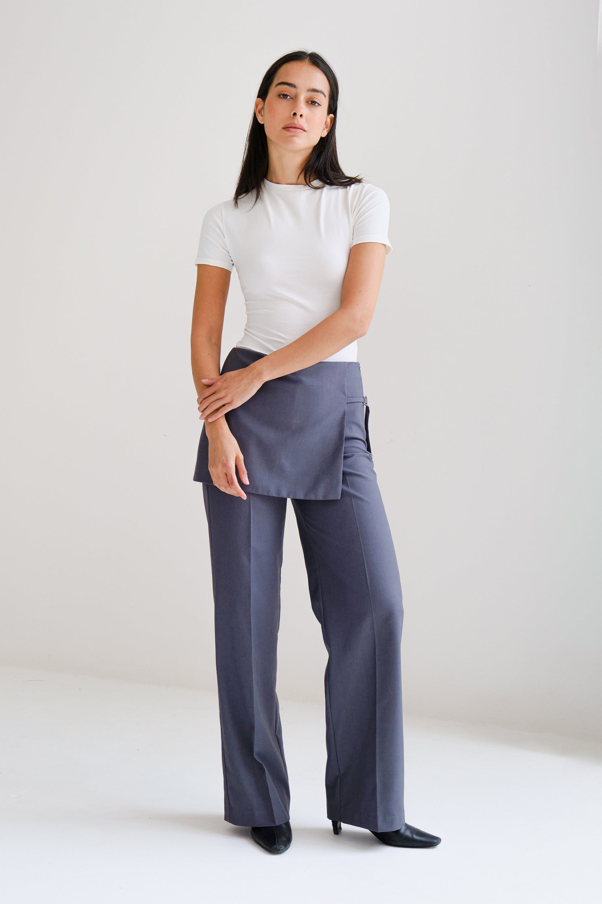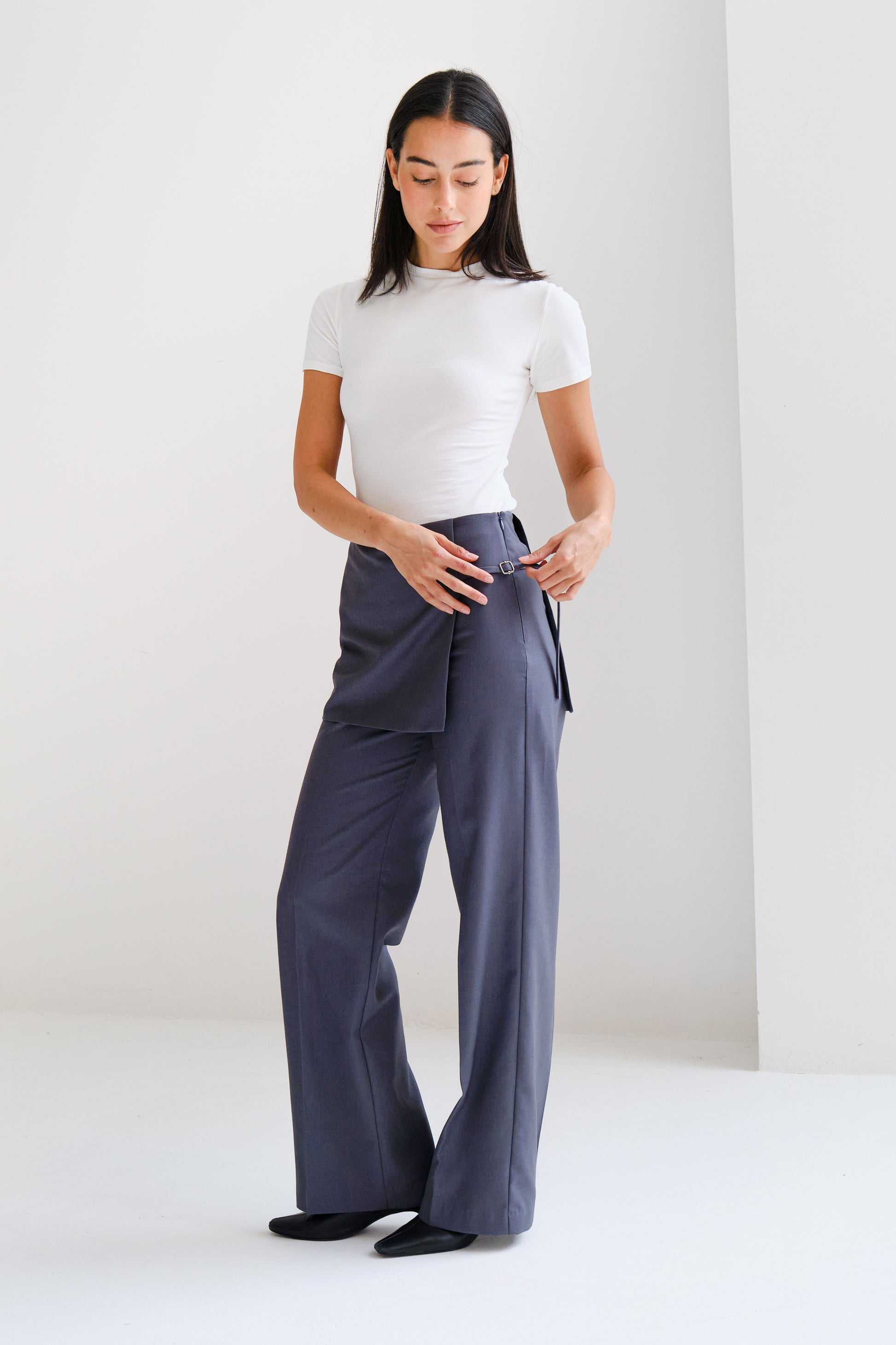 Pantalón de vestir mid waist con falda corta integrada. Se ajusta con cierre lateral y cuenta con hebilla metálica.
