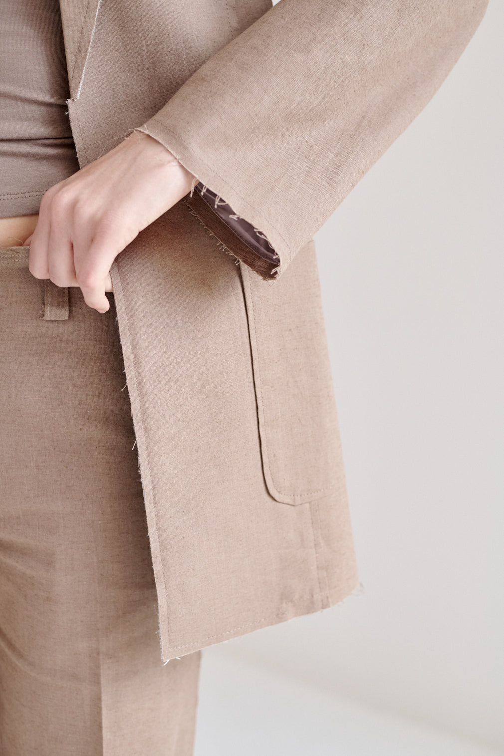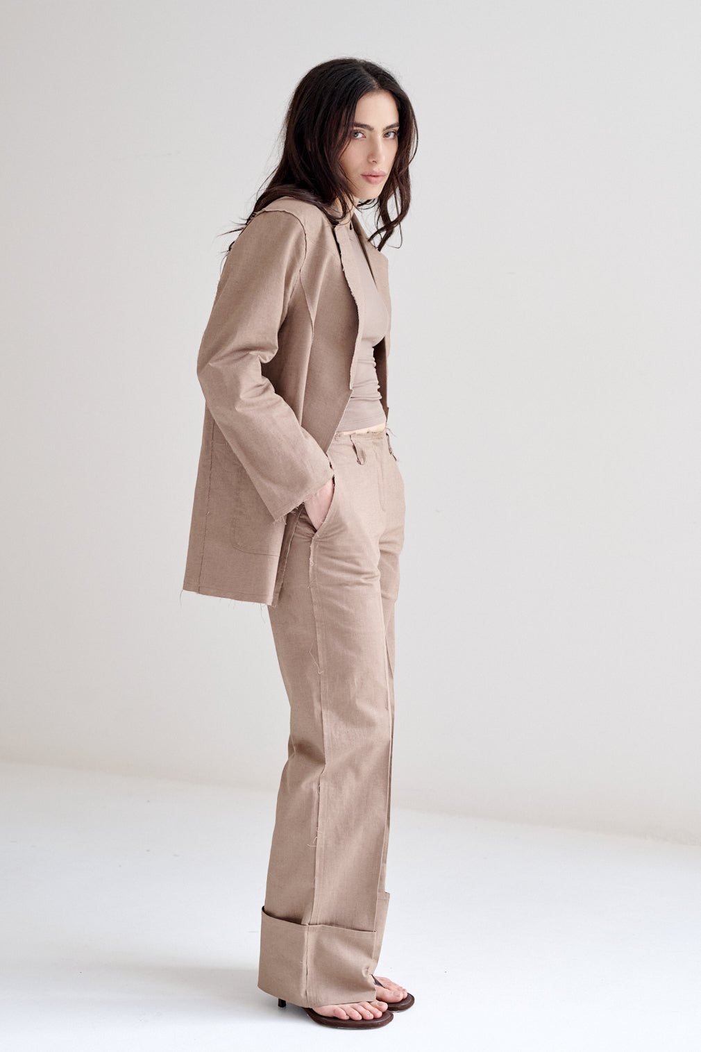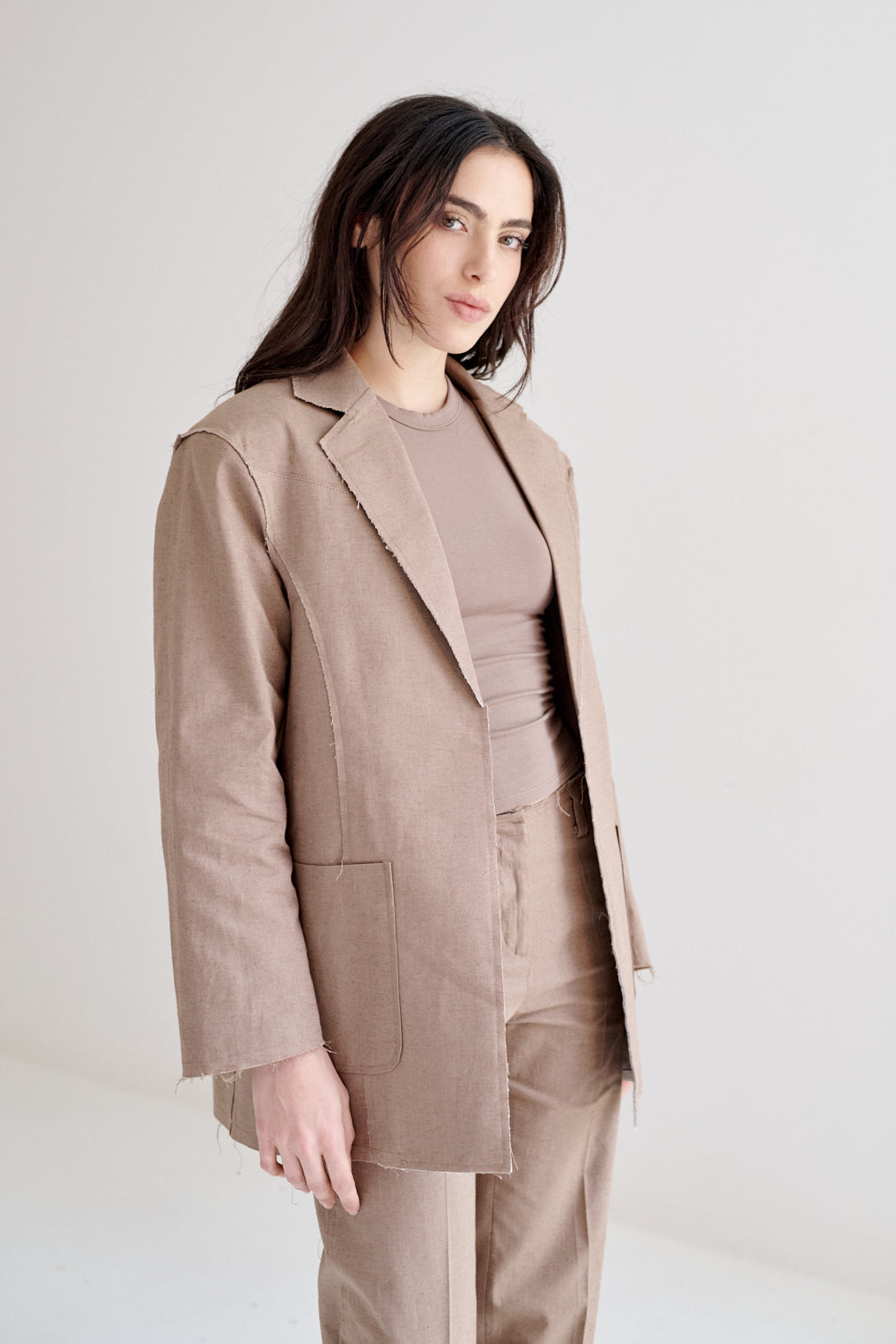 Saco oversized con textura rústica y deshilachado en costuras y bordes.