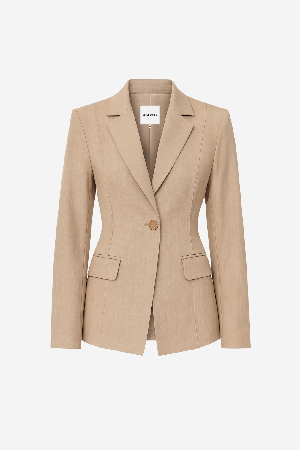 Saco ajustado con cortes y pinzas externas visibles que aportan forma y definición a la silueta. Cruce sencillo al frente para un cierre limpio y minimalista, costuras reforzadas en puntos de tensión.