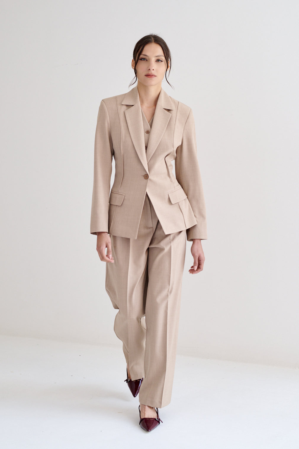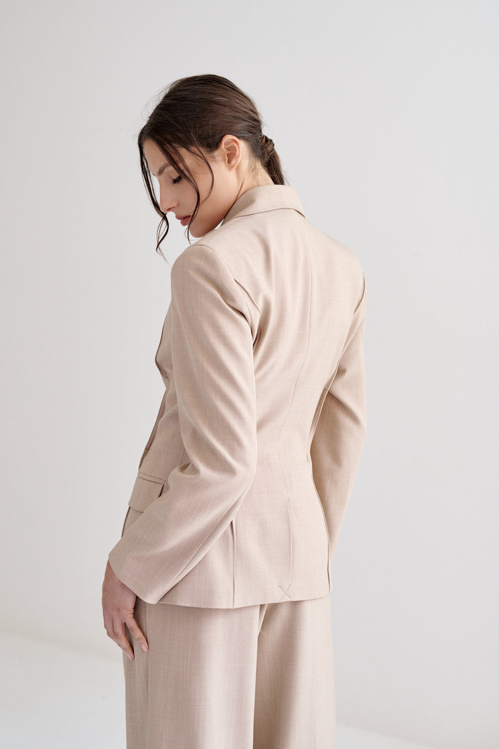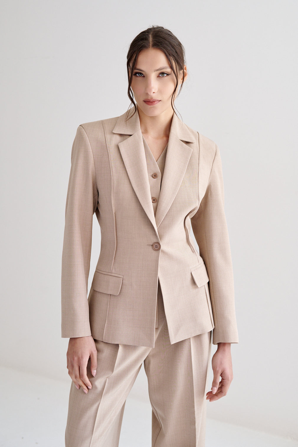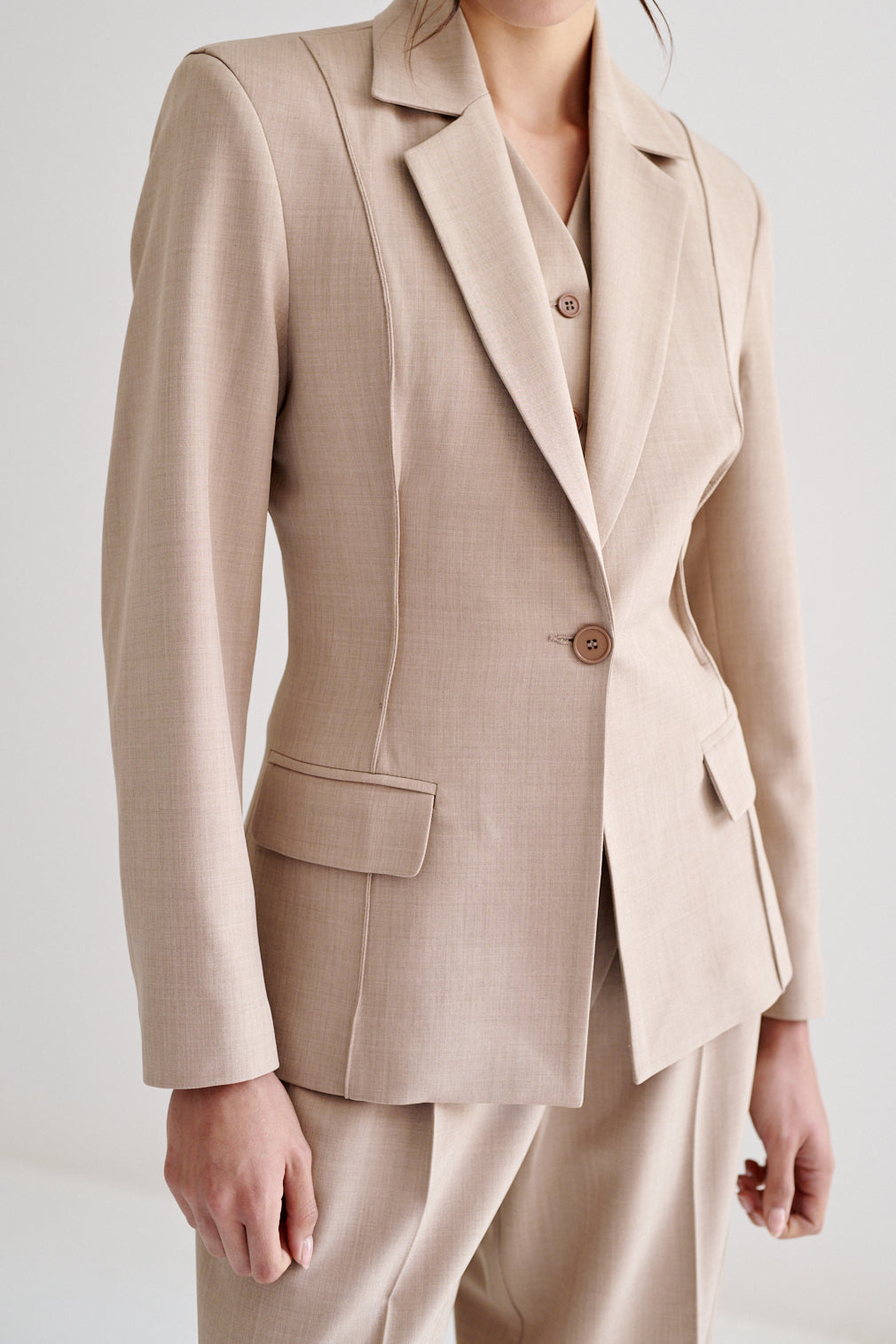 Saco ajustado con cortes, pinzas por fuera y cruce sencillo.
