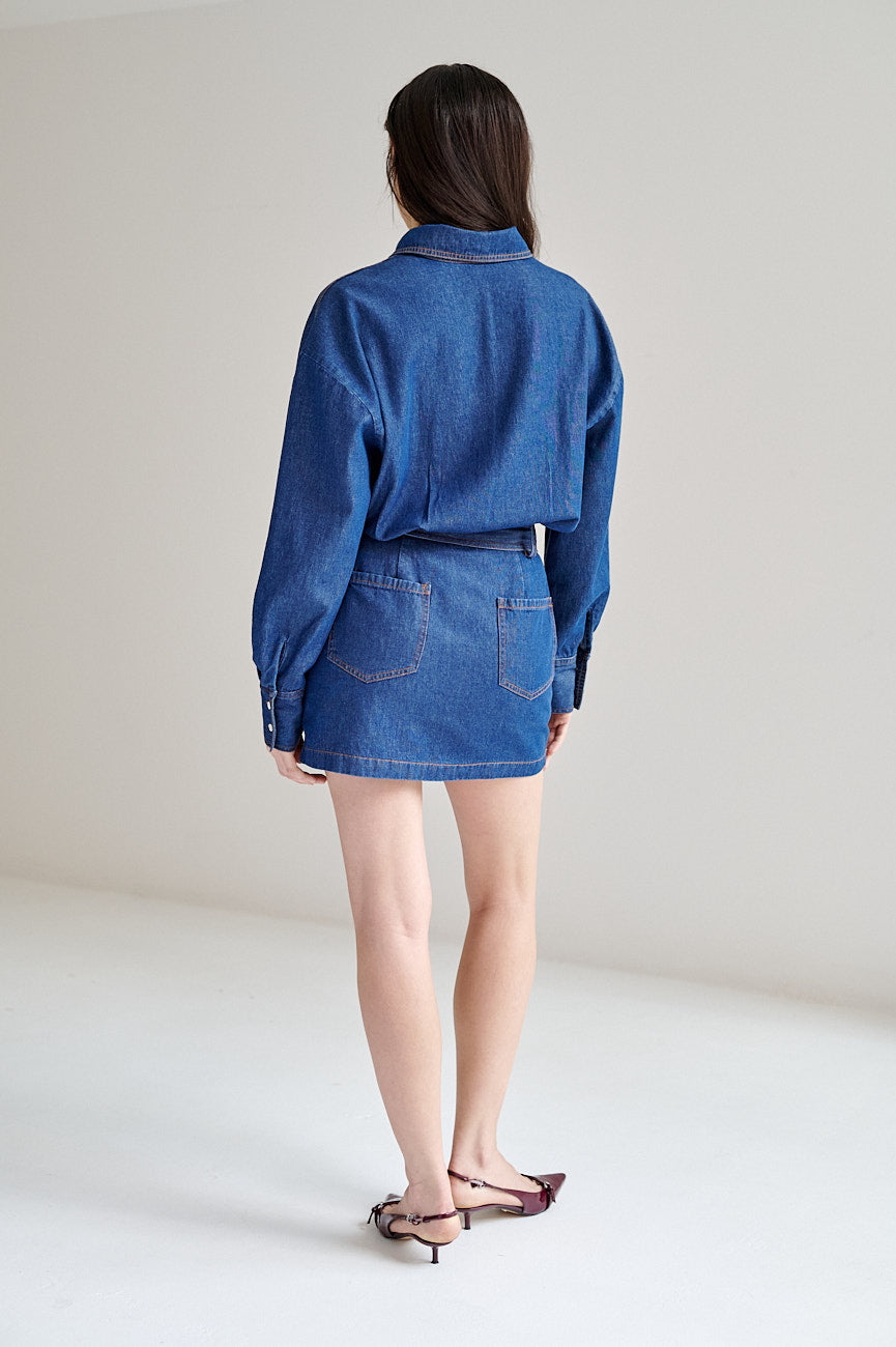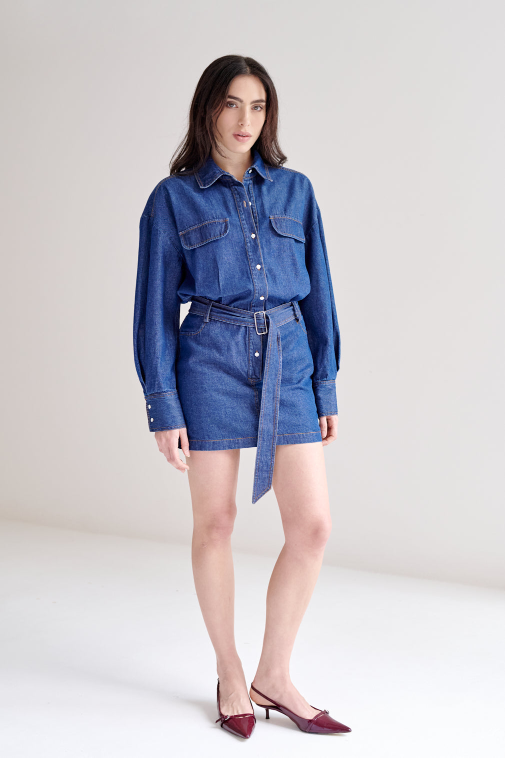 Jumpsuit camisero con falda, bolsa de cartera en pecho y mangas oversize.