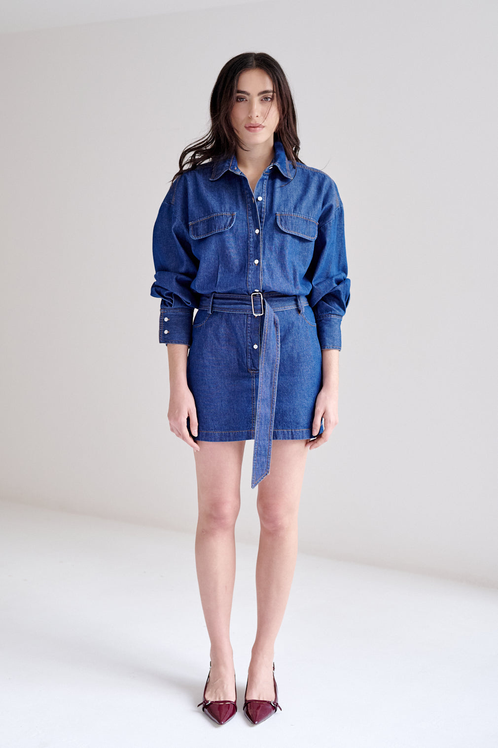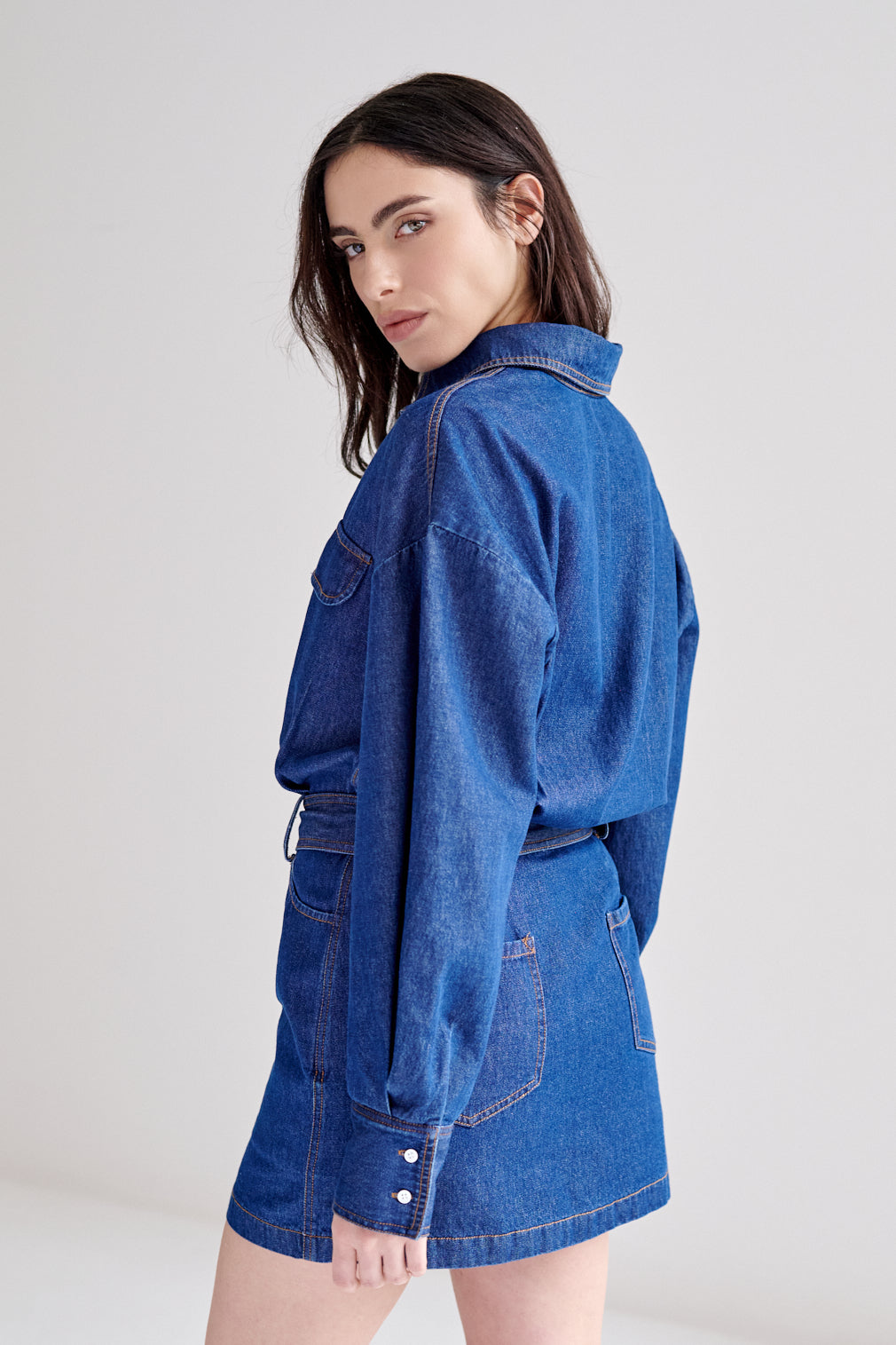 Jumpsuit confeccionado en denim grueso con parte superior relajada y falda entallada. Tiene bolsas cargo funcionales, cinturón ajustable que define la cintura, cierre frontal metálico y costuras reforzadas para mayor resistencia.