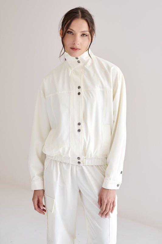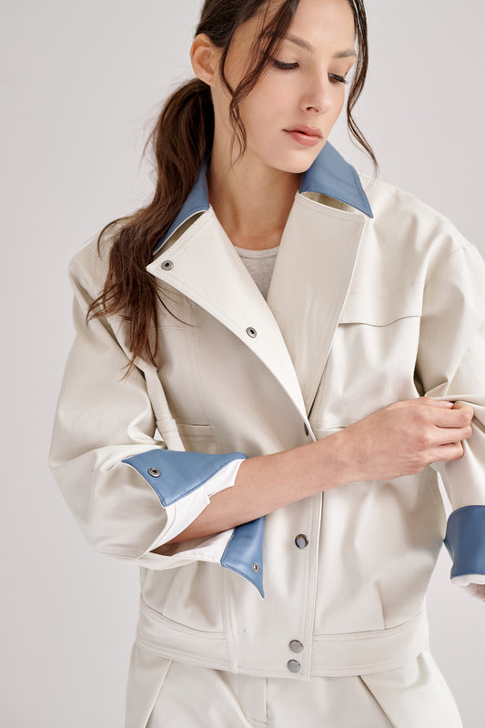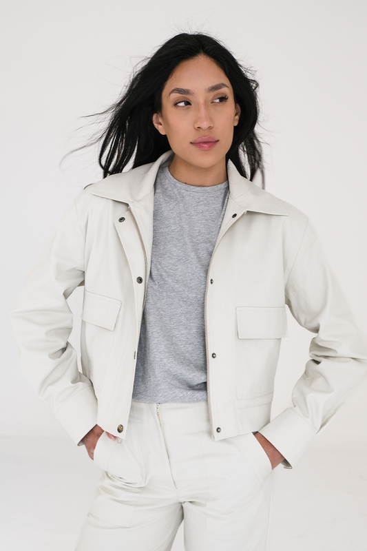 Chamarra de vestir ajustada al cuerpo con cierre metálico.
