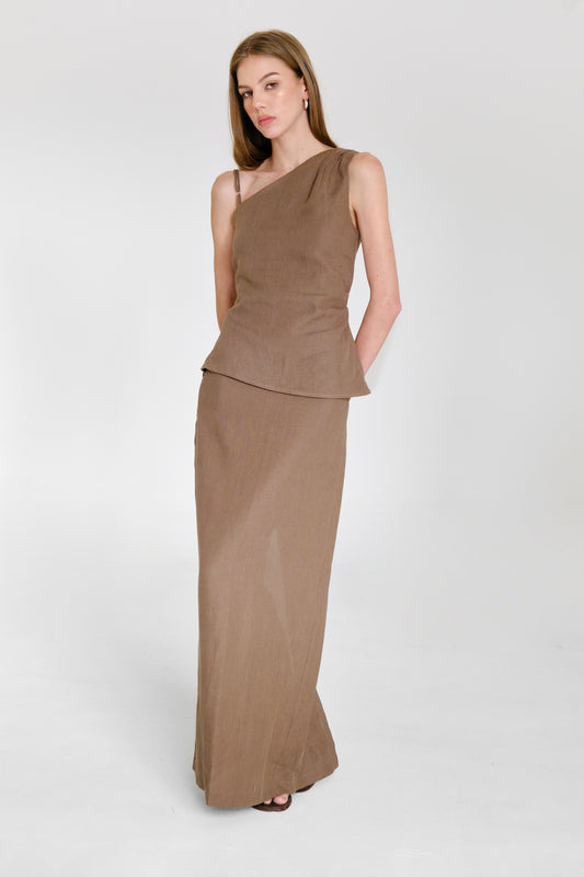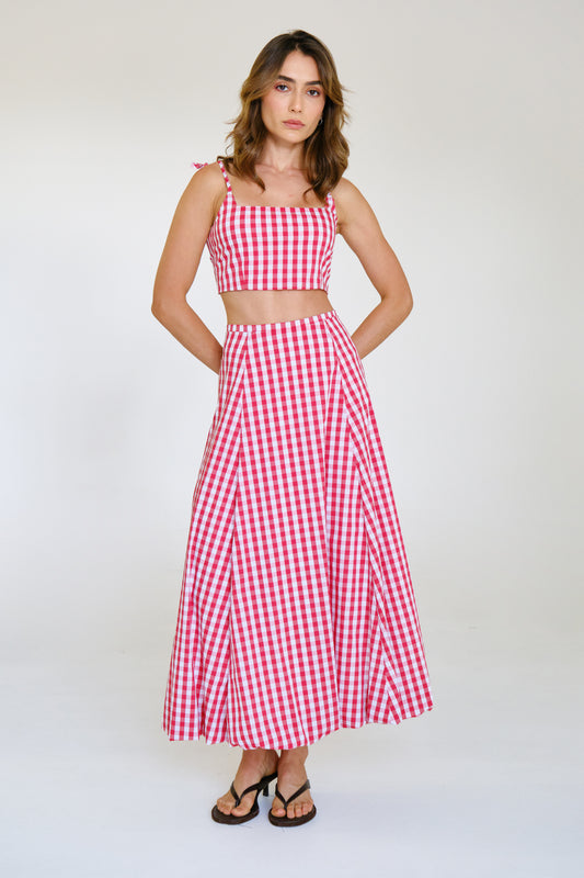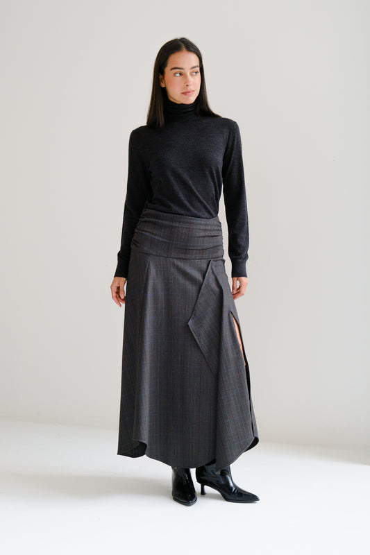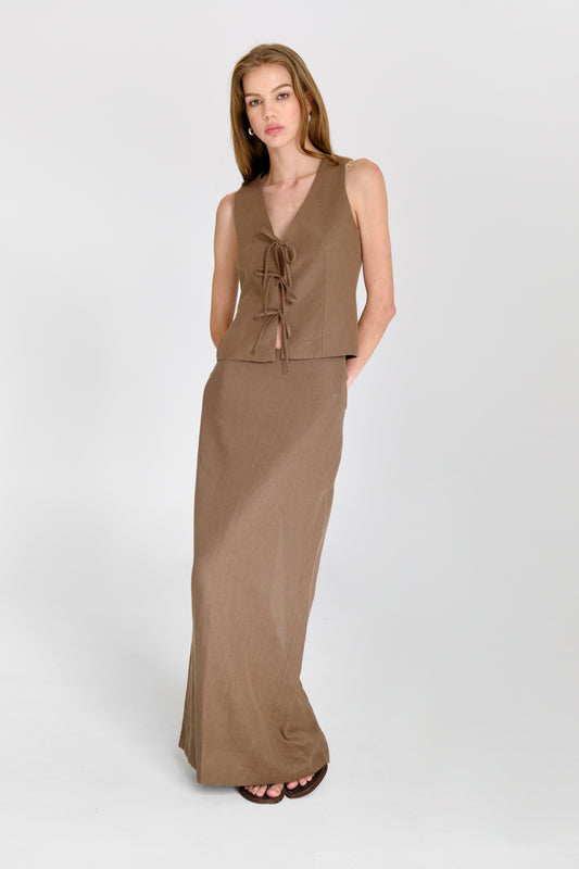 Falda maxi con fruncido en cintura, jaretas y amarre al costado