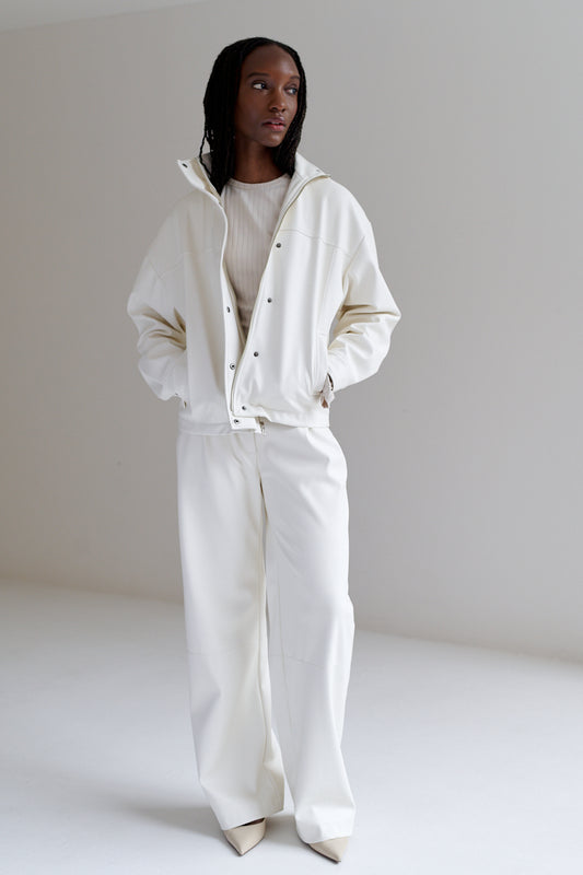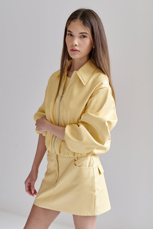 Chamarra estilo bomber oversized. Con cuello y puños de piel vegana