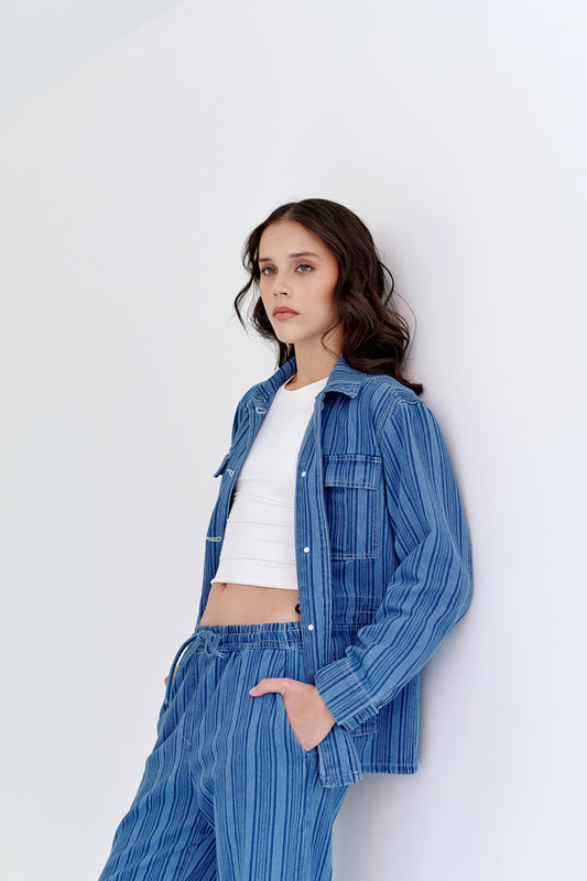 Chamarra de mezclilla rayada con bolsas de parche y ajustador en cintura.