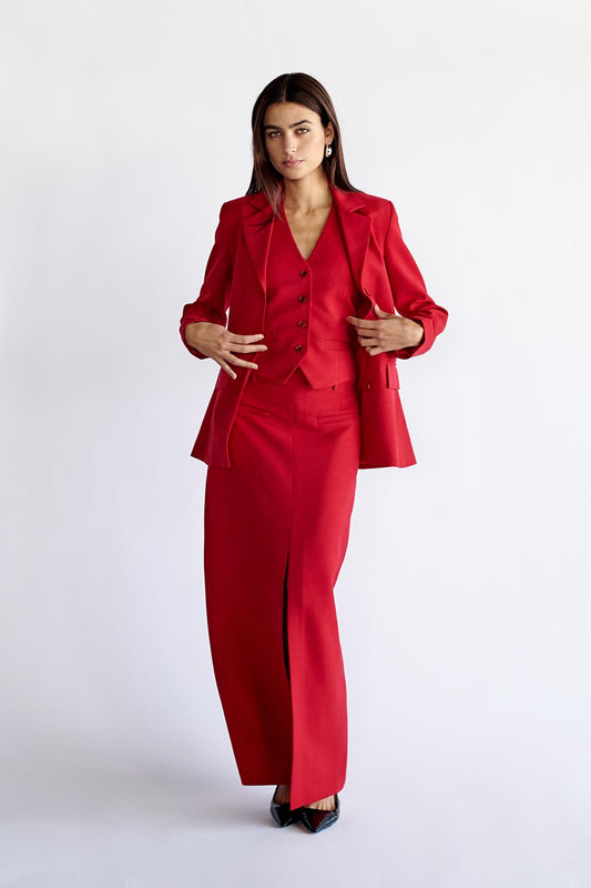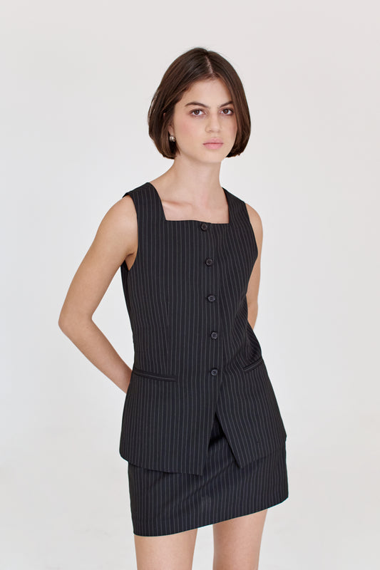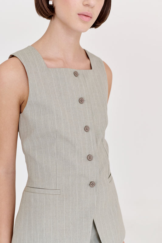 Chaleco largo de vestir con escote cuadrado y ajustadores en parte trasera.