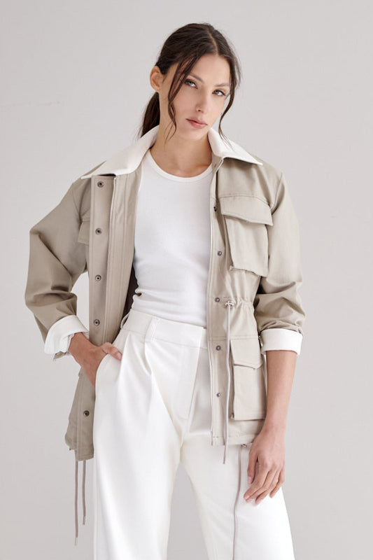 100% ALGODÓN Chamarra con cuello en contraste de piel, con jaretas internas en cintura y...