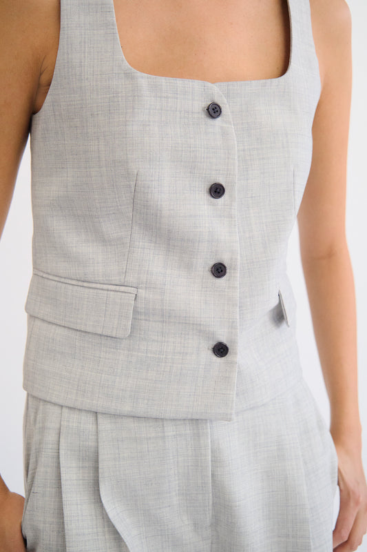 Chaleco con escote cuadrado botones en centro delantero y tirantes.