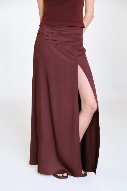 Falda larga con cintura drapeada y abertura al frente.