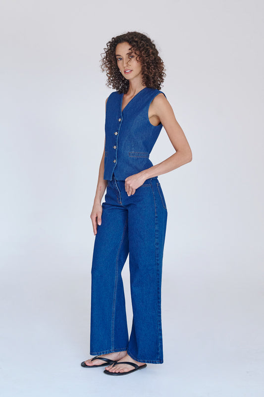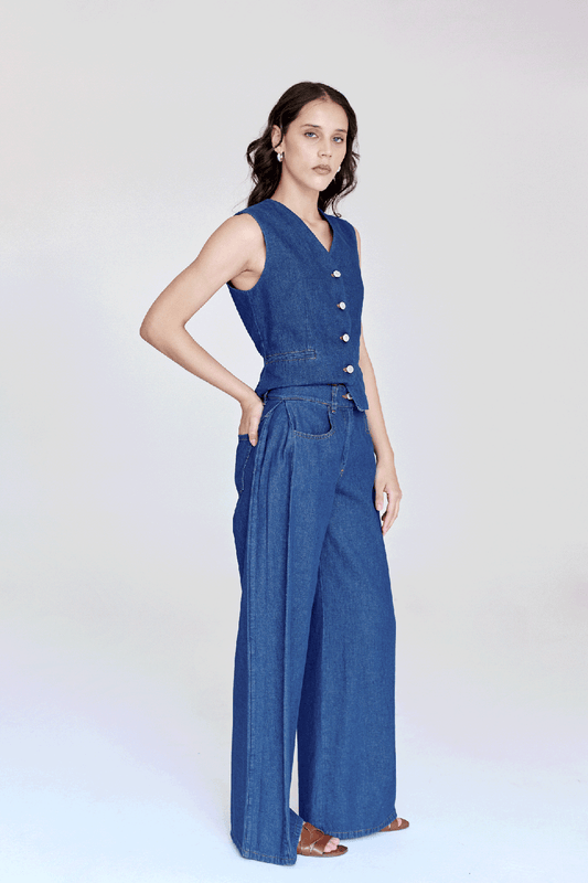 Pantalón de mezclilla ligera. Fit amplio con pinzas en los costados para dar volumen.