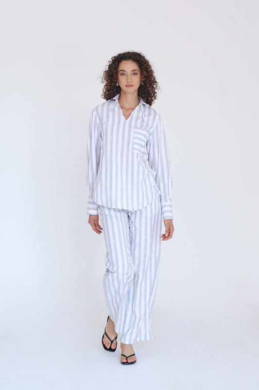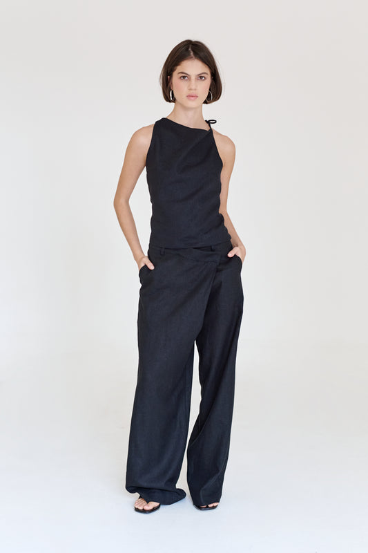 55% LINO 55% RAYÓN Pantalón de lino con pretina asimétrica que permite ajustarlo a la...
