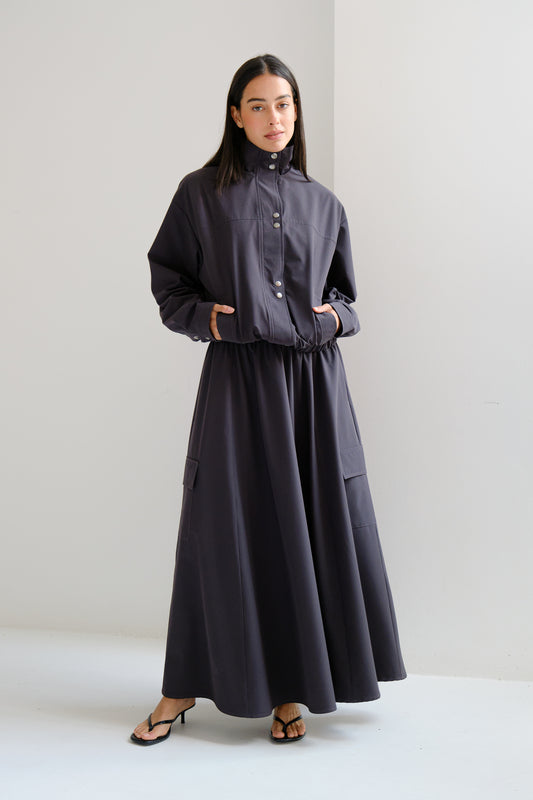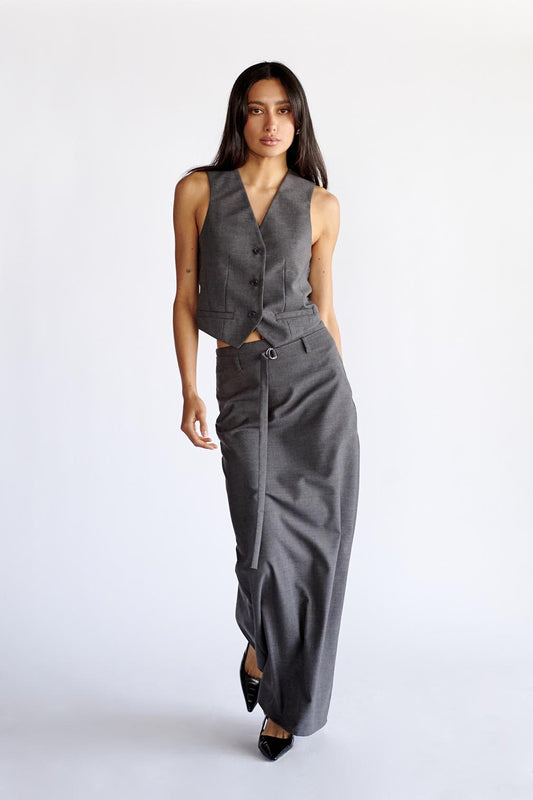 Falda midi tableada con pliegues definidos y bolsillos laterales funcionales.