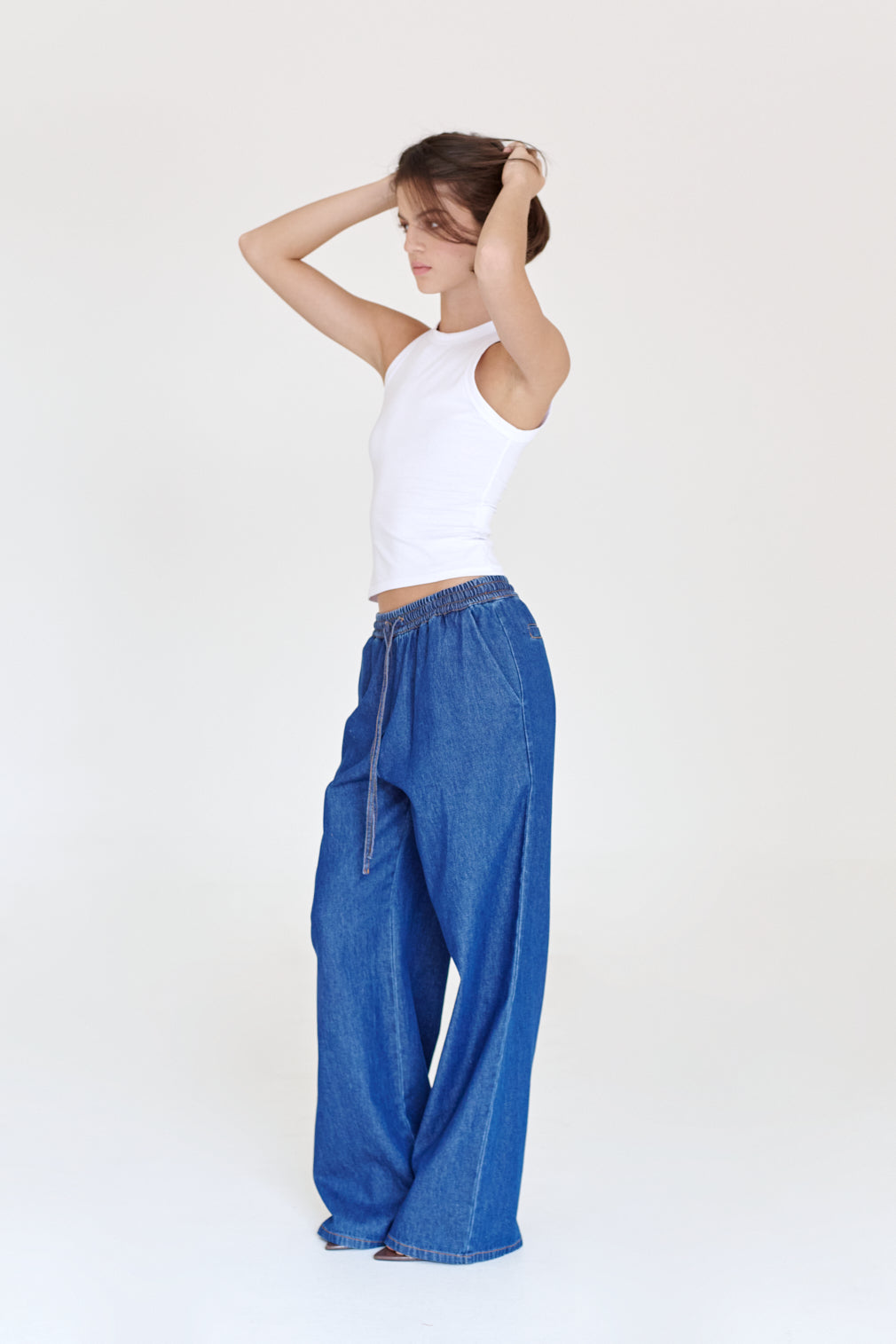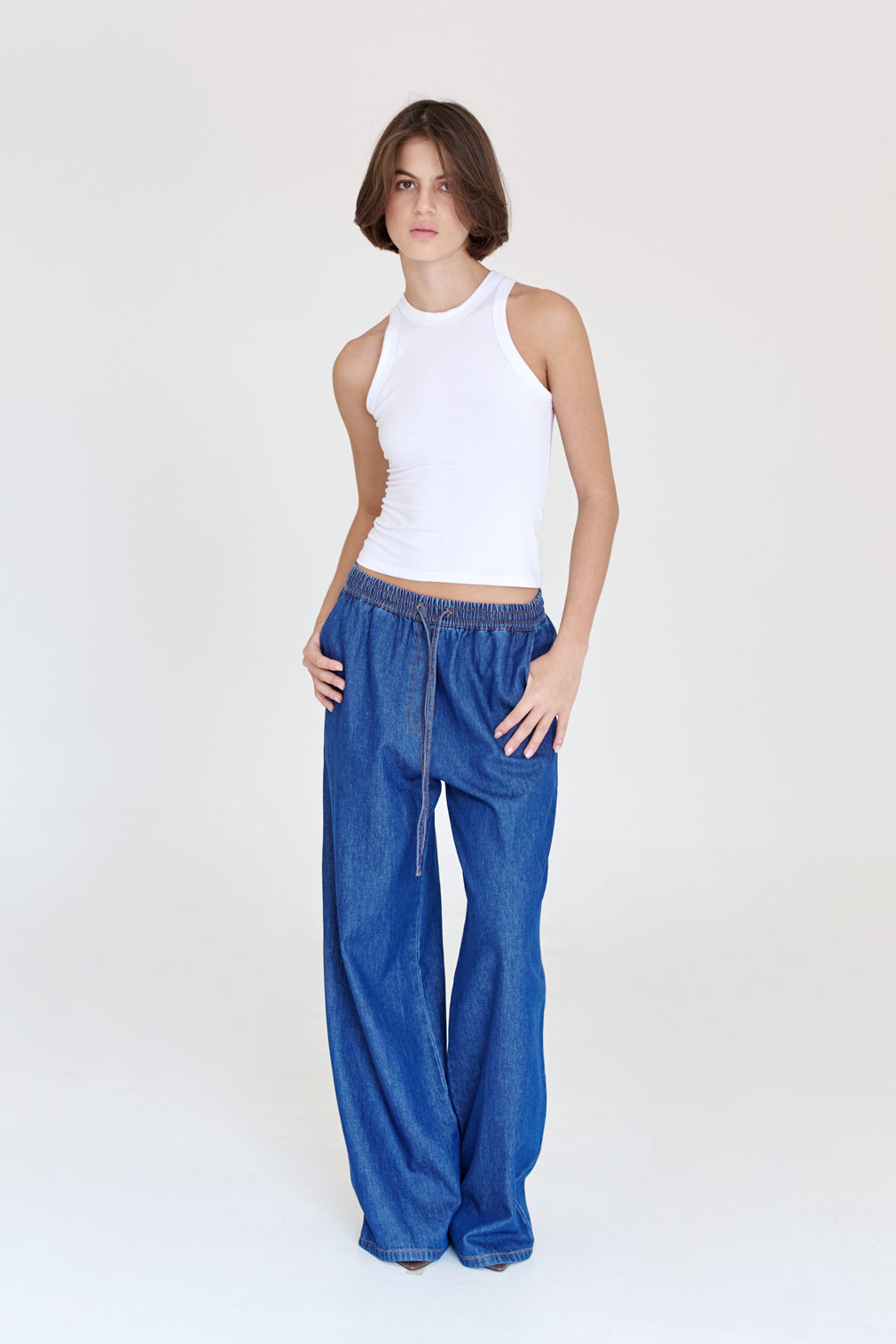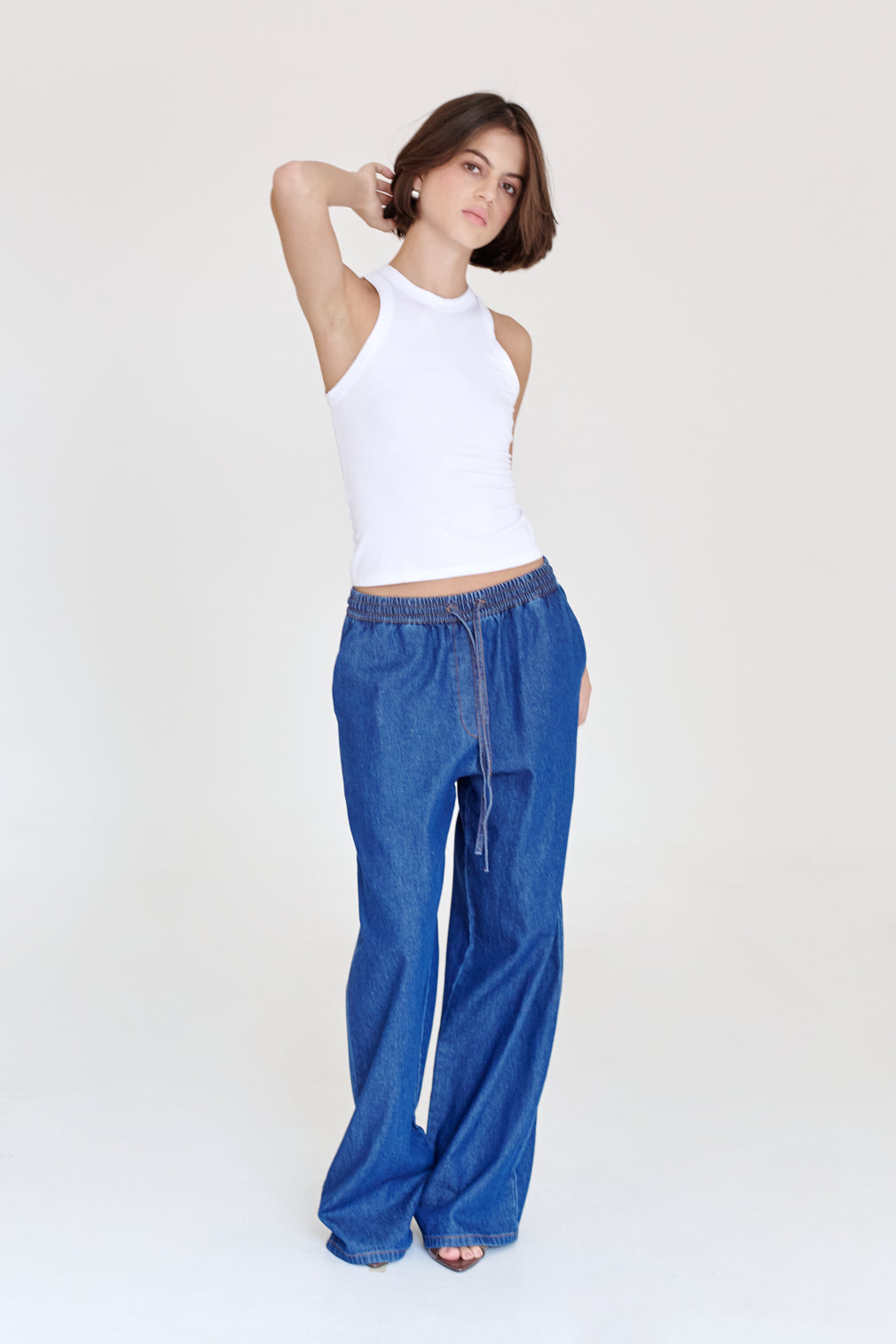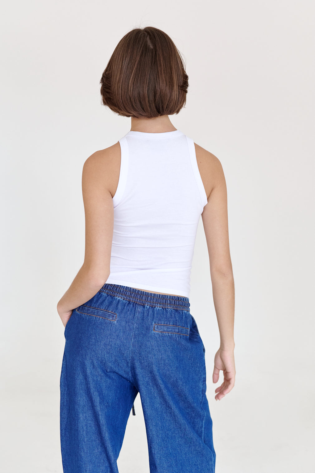 Tank top con escote redondo, confeccionada con una tela ligeramente translucida. Su largo cae justo debajo de la cadera. True to size. Si prefieres un fit más suelto, te recomendamos subir una talla.