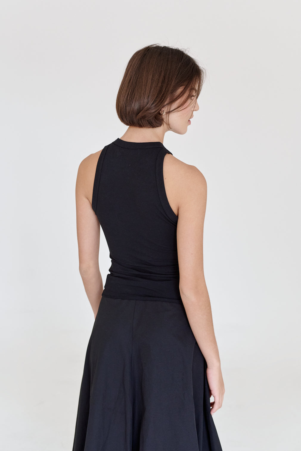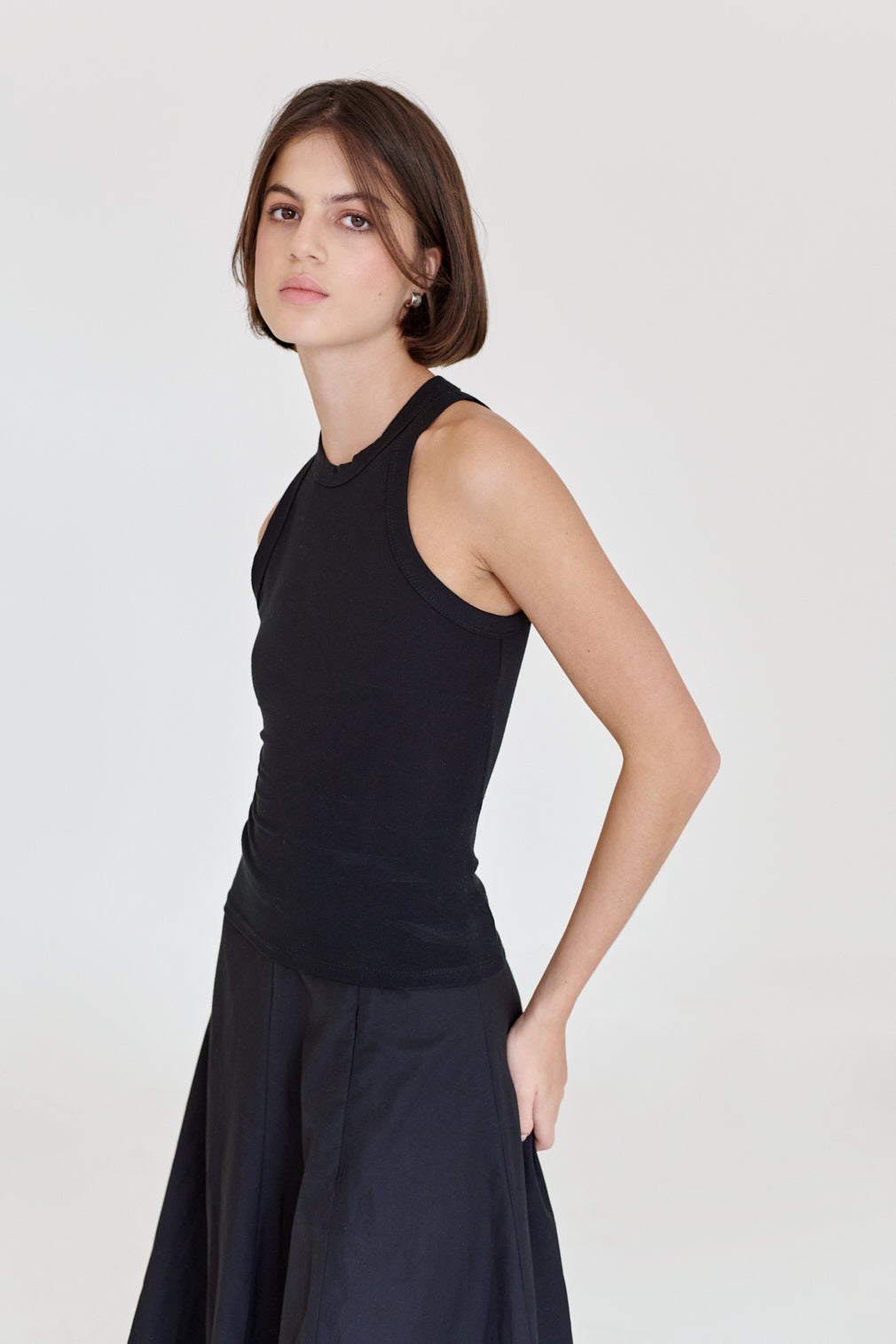 Tank top con escote redondo, confeccionada con una tela ligeramente translucida. Su largo cae justo debajo de la cadera. True to size. Si prefieres un fit más suelto, te recomendamos subir una talla.