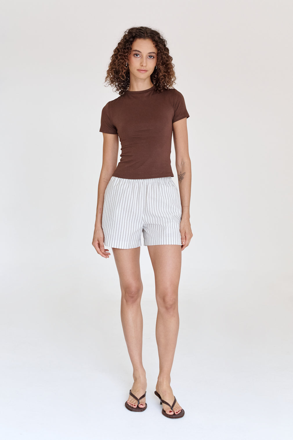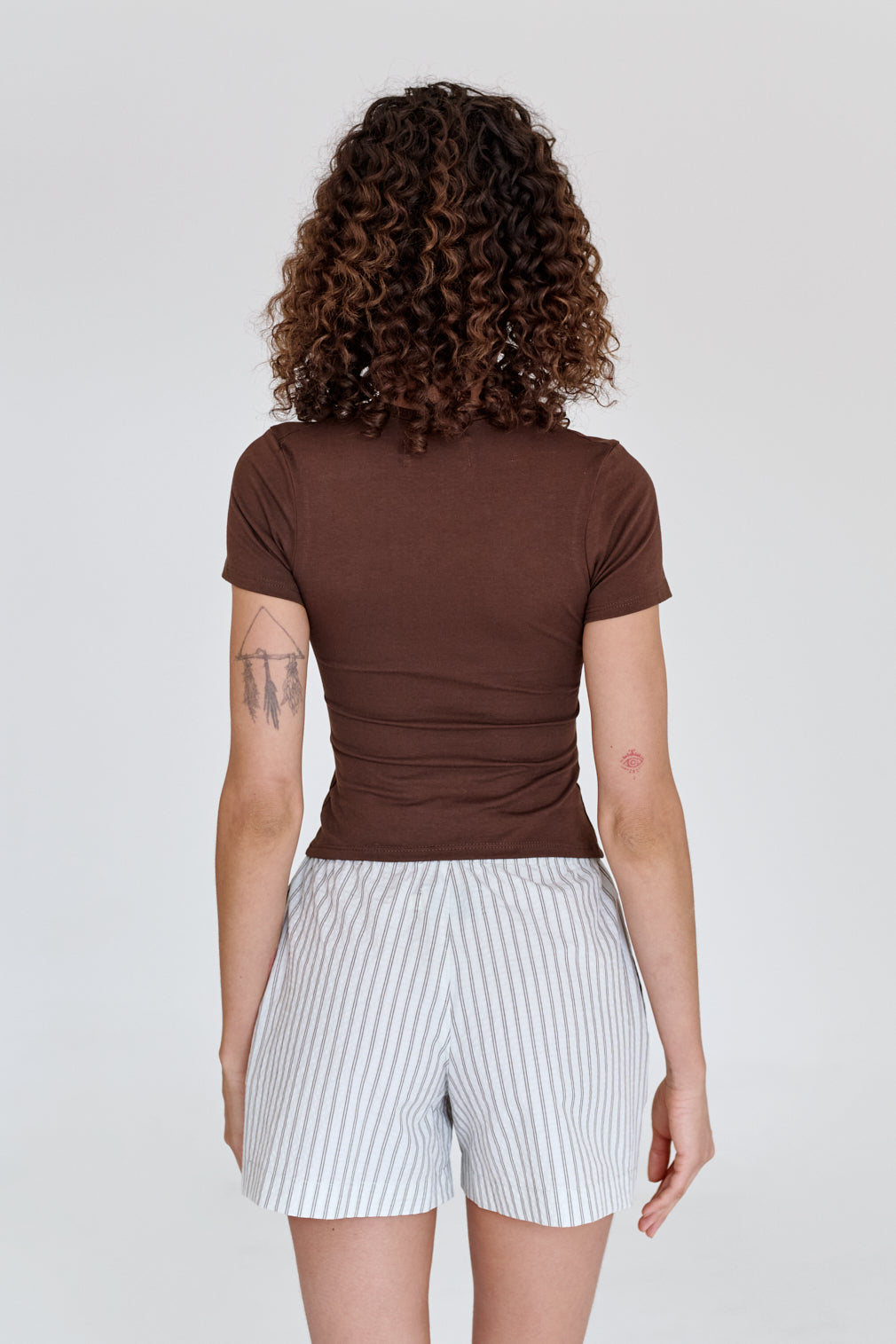 T-shirt confeccionada con una tela ligera y elástica que se moldea a tu cuerpo. Su largo cae justo debajo de la cintura. True to size. Si prefieres un fit más suelto, te recomendamos subir una talla.