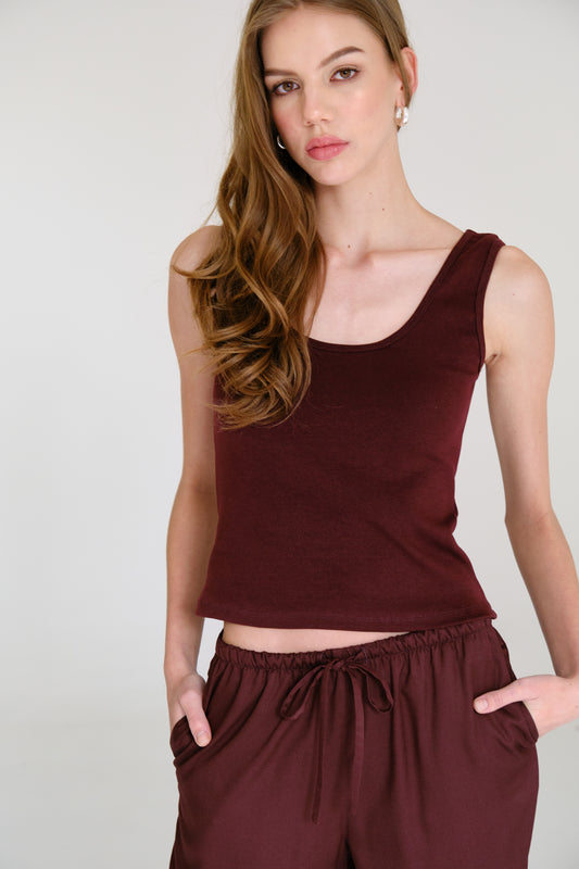 97% ALGODÓN 3% SPANDEX Top de rib con tirantes anchos y escote redondo. Corte ajustado...