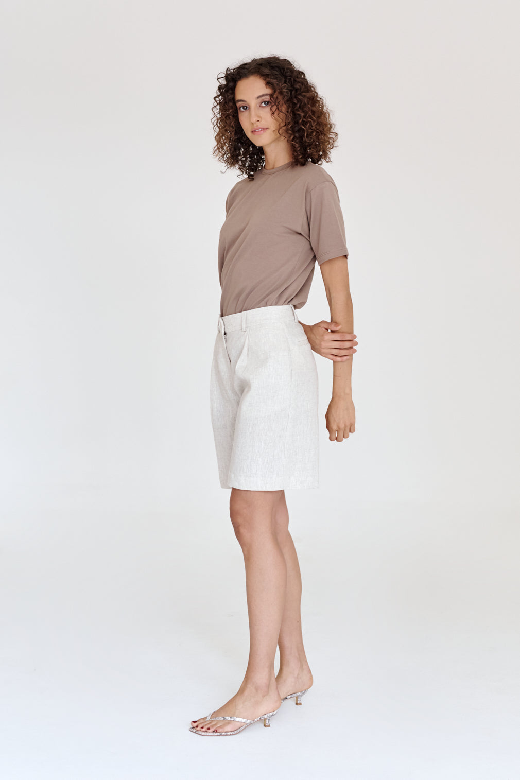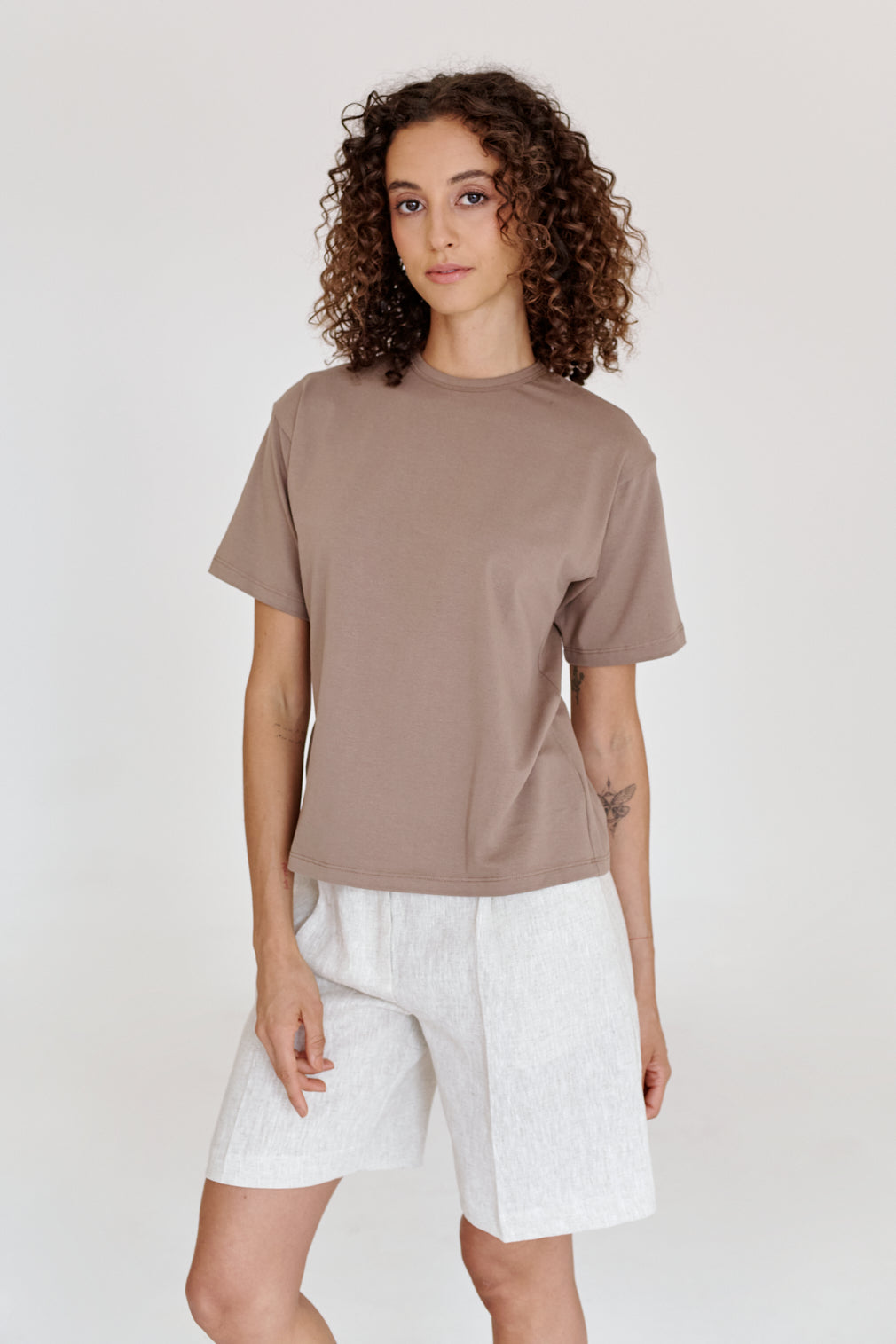 T-shirt oversized de mangas cortas con caída en el hombro, cuello redondo. Su largo llega a la altura de la cadera, ideal para llevar por dentro o por fuera del pantalón.