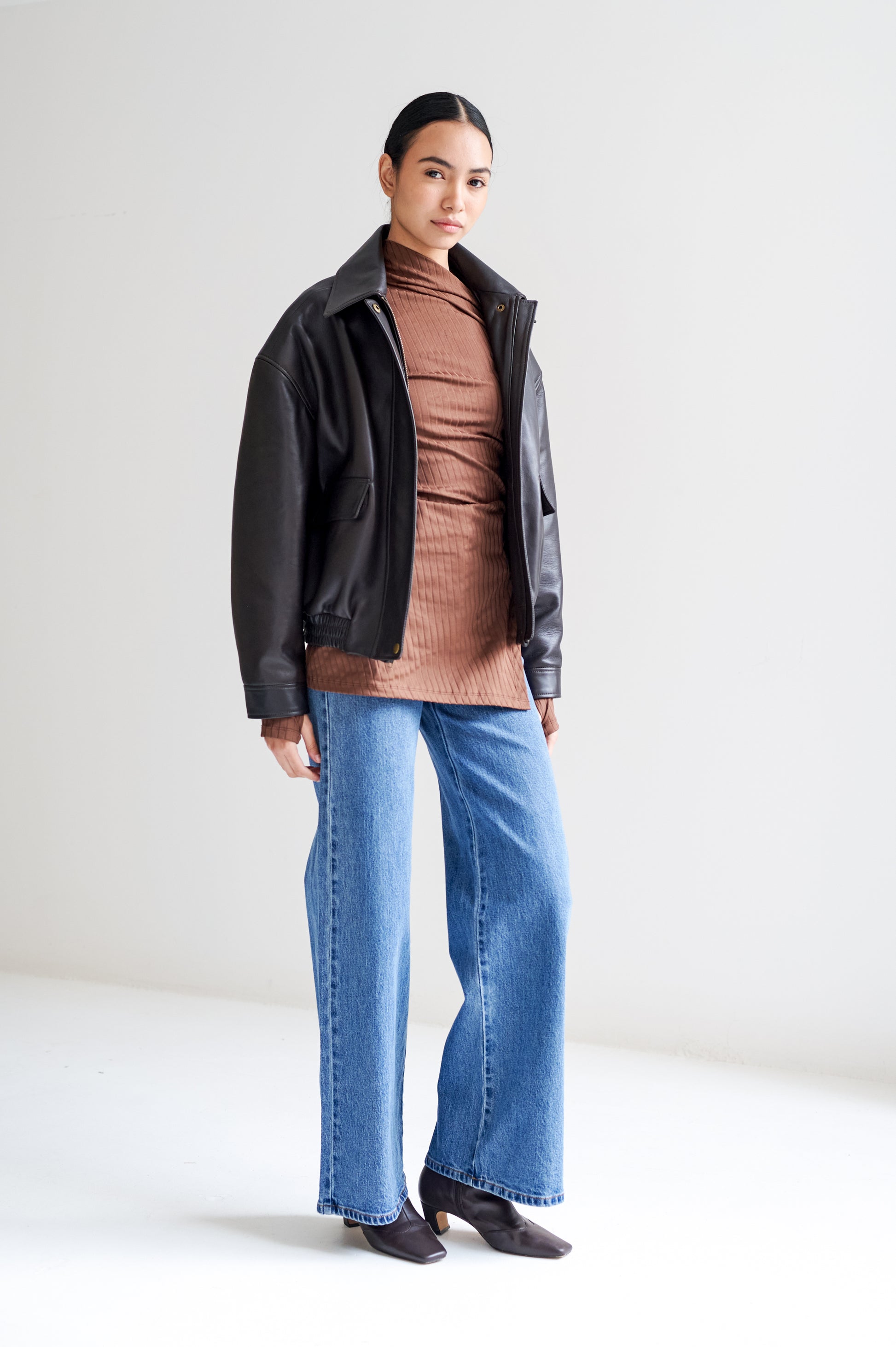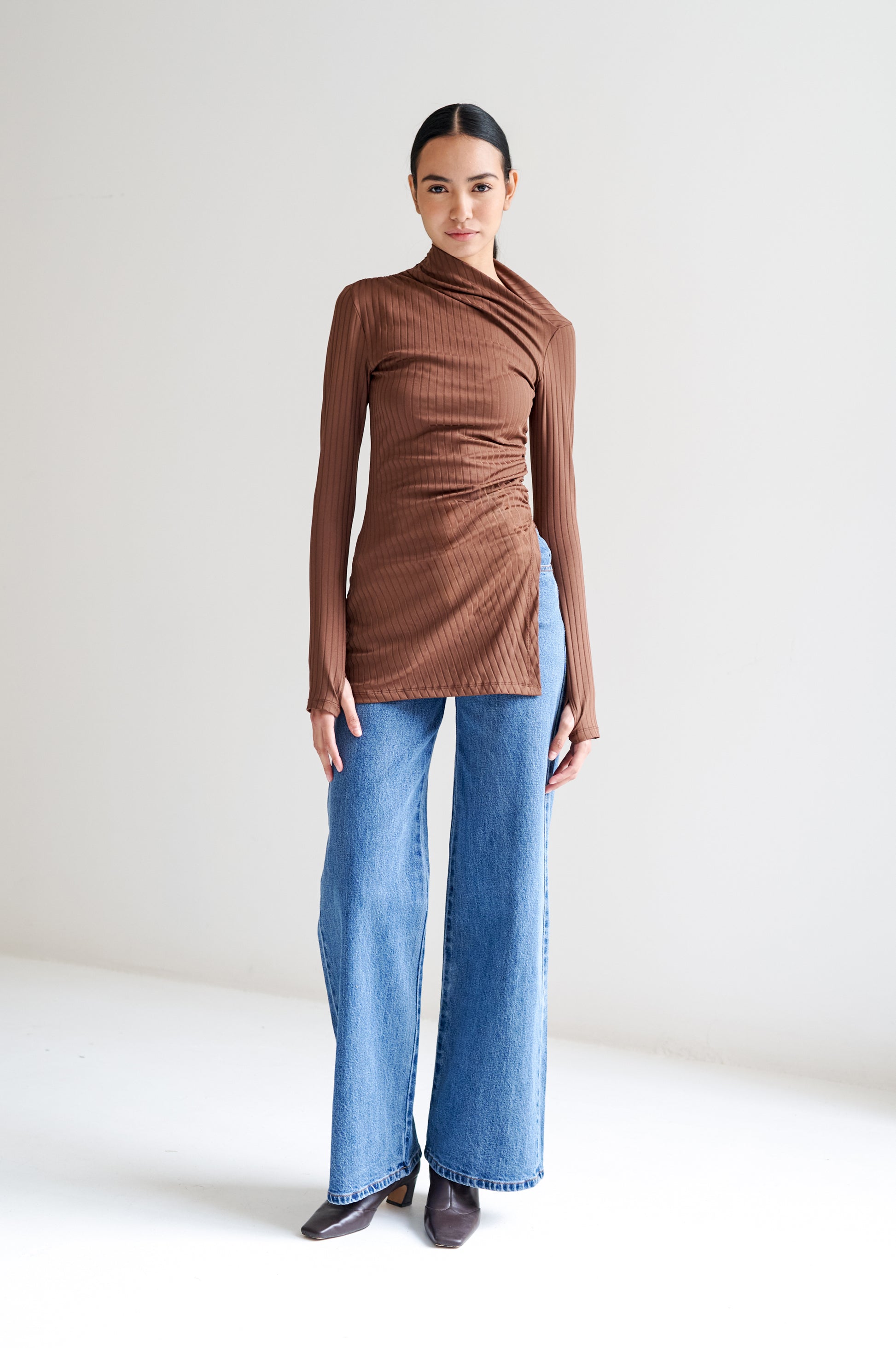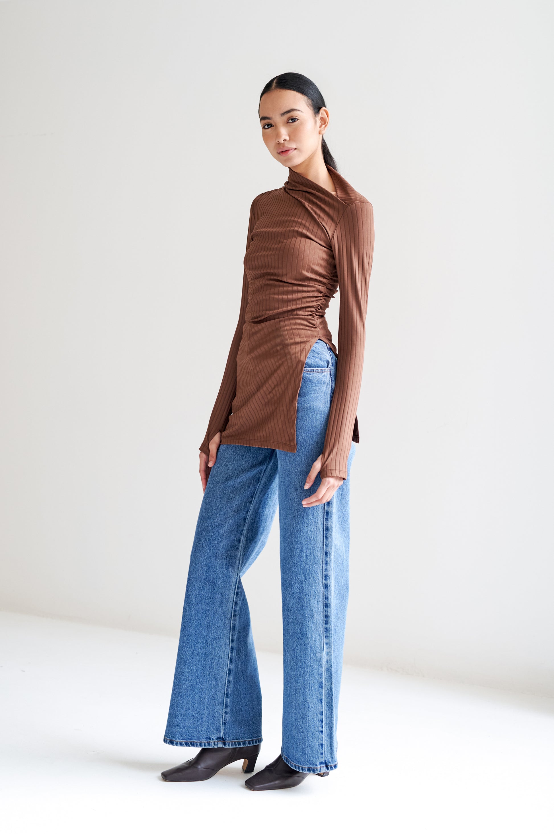 Blusa larga ajustada al cuerpo con apertura asimétrica, dreapeada de la cintura