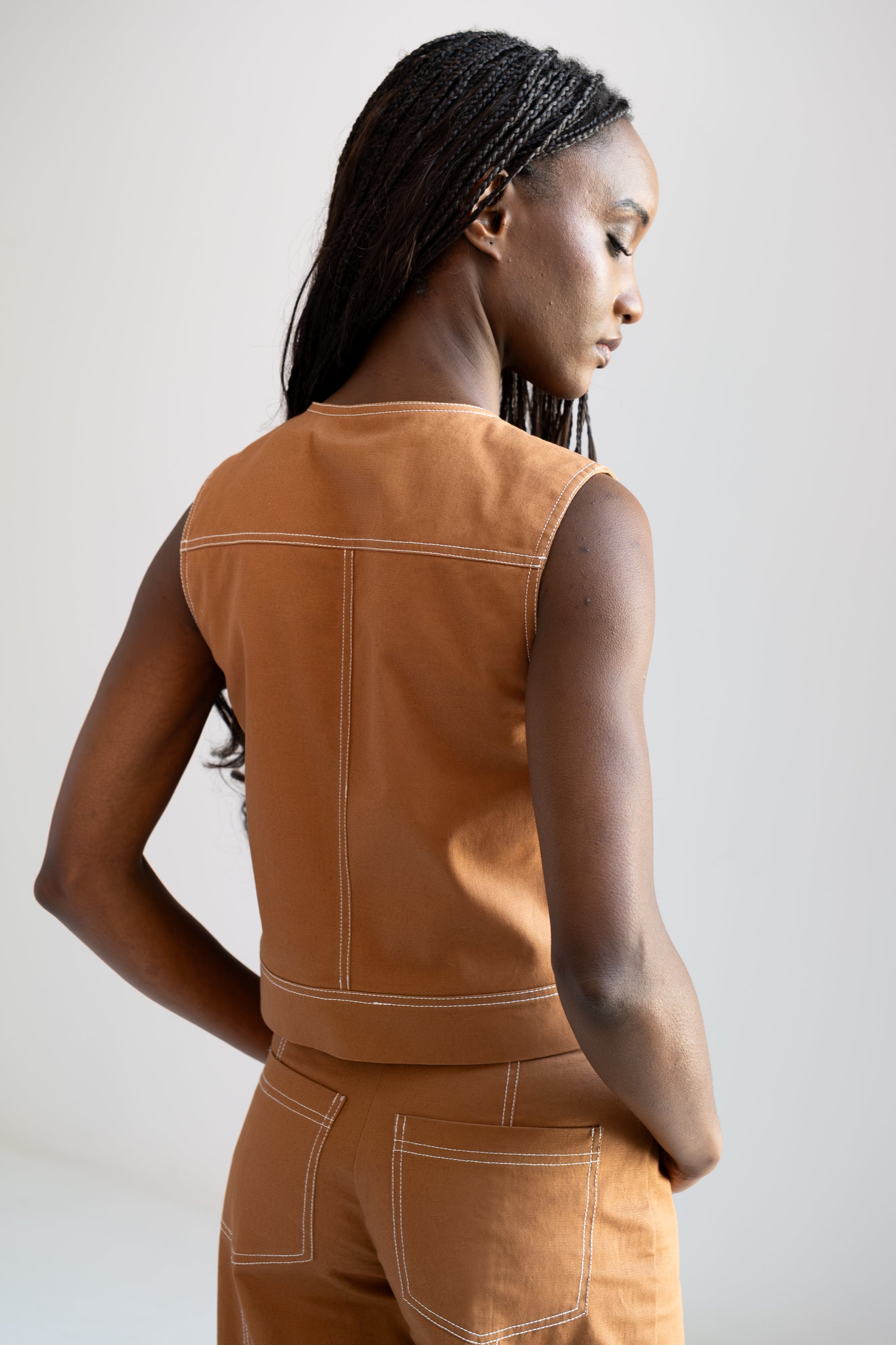 Chaleco con carteras frontales y pespuntes en contraste. Corte recto, escote en “V” y cierre frontal con botones.