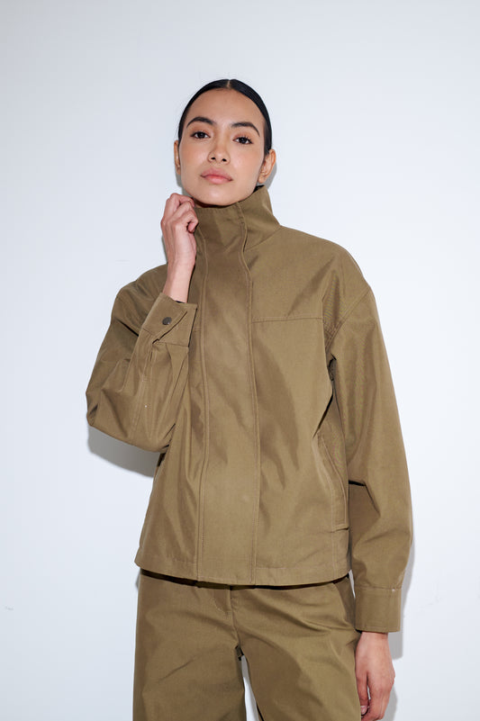 Chamarra de vestir ajustada al cuerpo con cierre metálico.