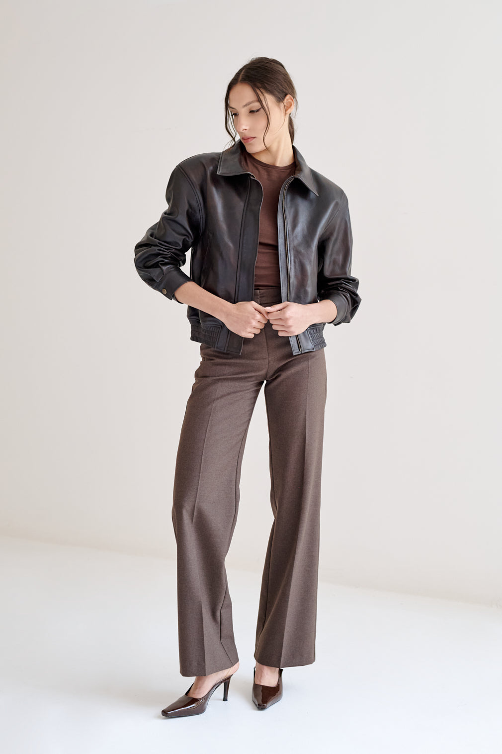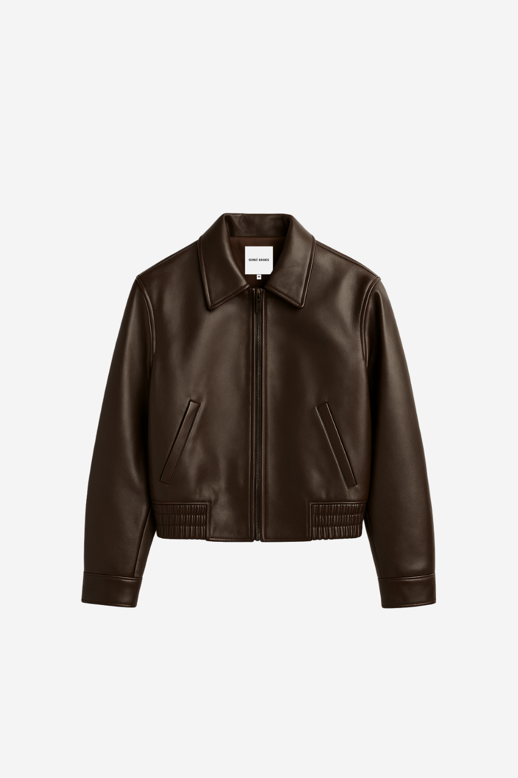 Chamarra bomber de piel genuina con cierre frontal metálico y hombreras internas que aportan estructura, costuras reforzadas y forro interior para mayor confort.