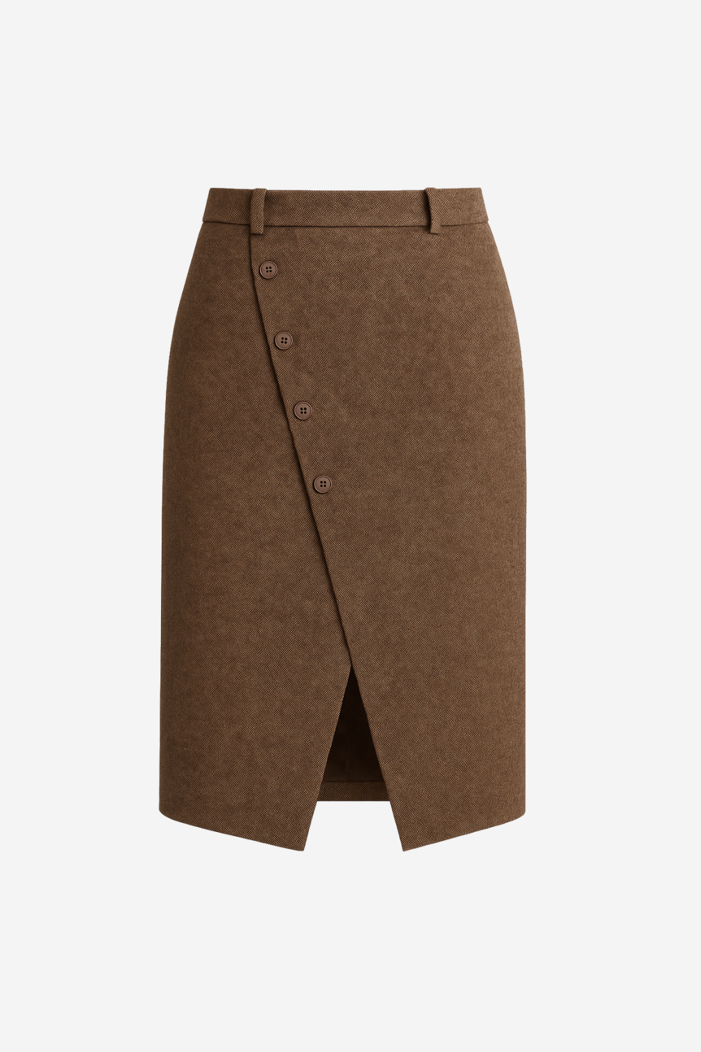 Falda midi cruzada con botones laterales y abertura frontal en tejido tipo lana.