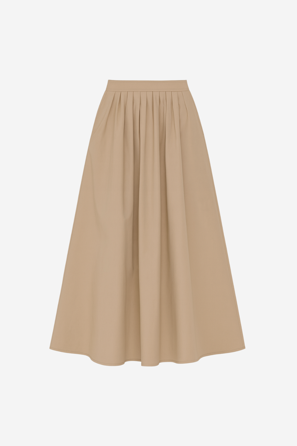 Falda midi tableada confeccionada en tejido de peso medio, con pliegues marcados y planchados que mantienen la estructura y aportan movimiento al caminar. Presenta tiro medio/alto para un ajuste favorecedor en la cintura, bolsillos laterales funcionales discretamente integrados en las costuras para conservar la línea del diseño y pretina reforzada.