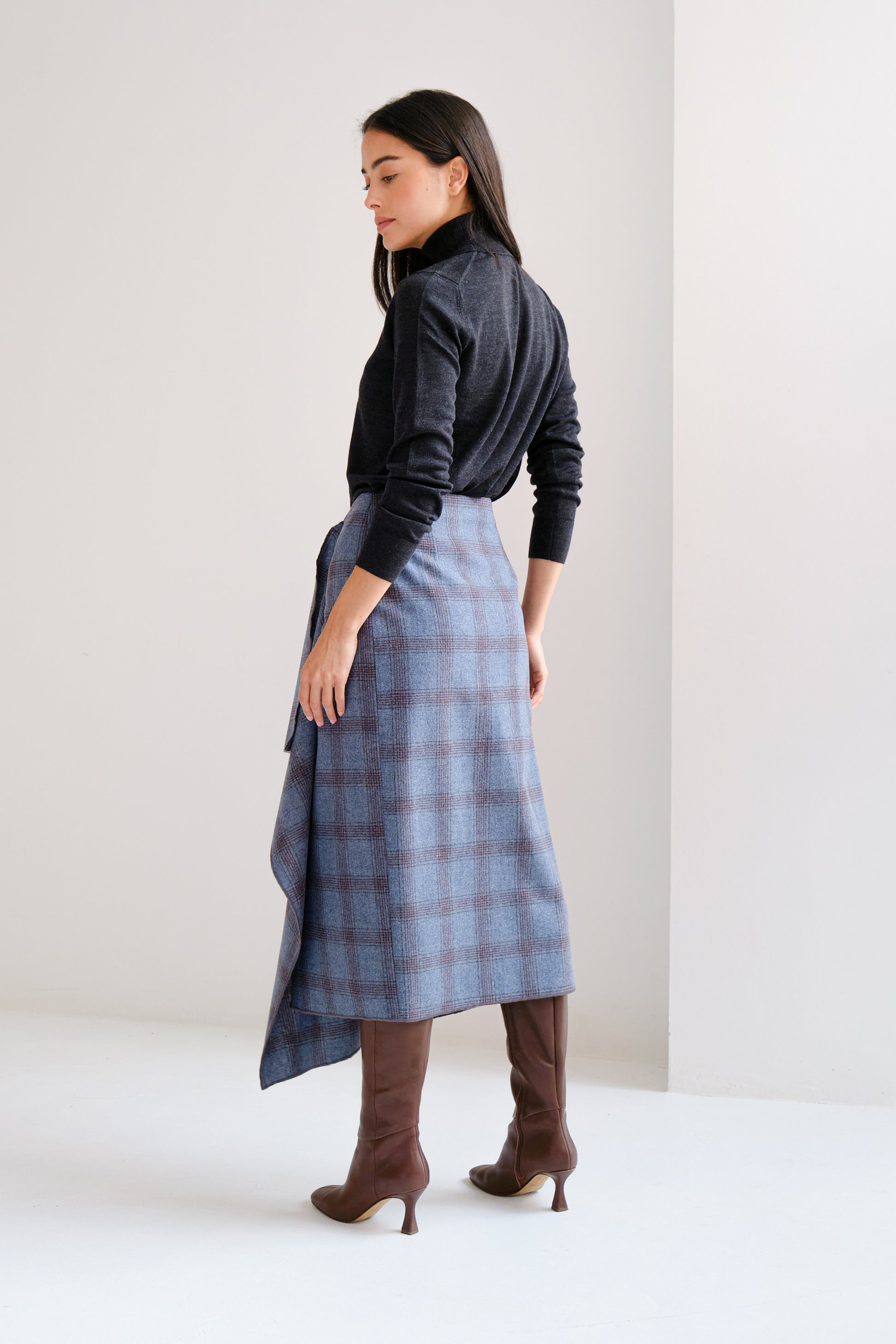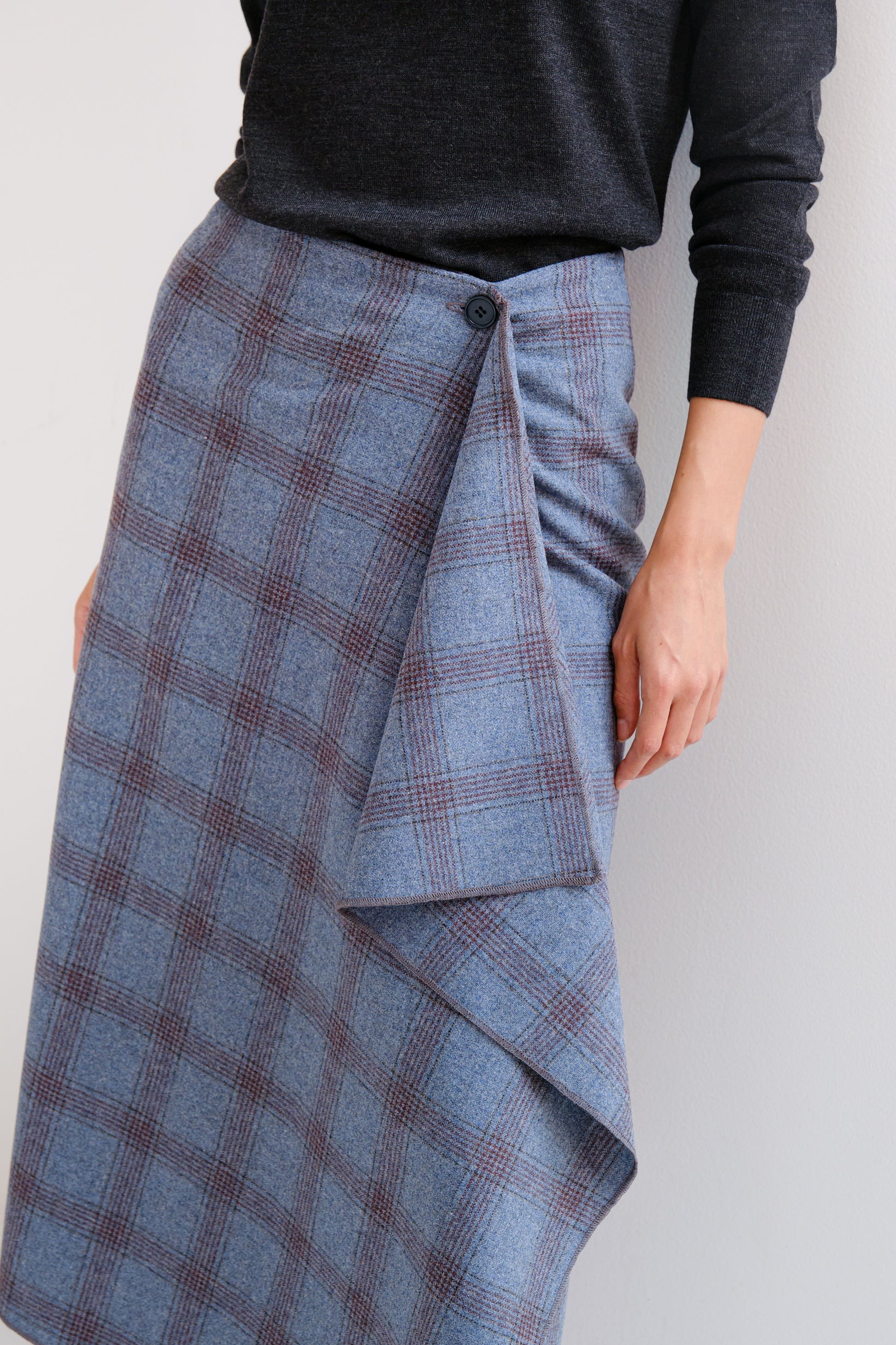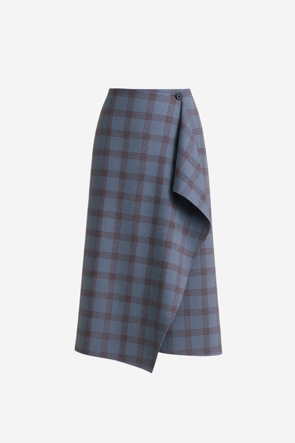 Falda midi cruzada confeccionada en lana con patrón de cuadros azul y líneas color vino. Presenta un diseño envolvente con cierre lateral mediante botón y un panel superpuesto