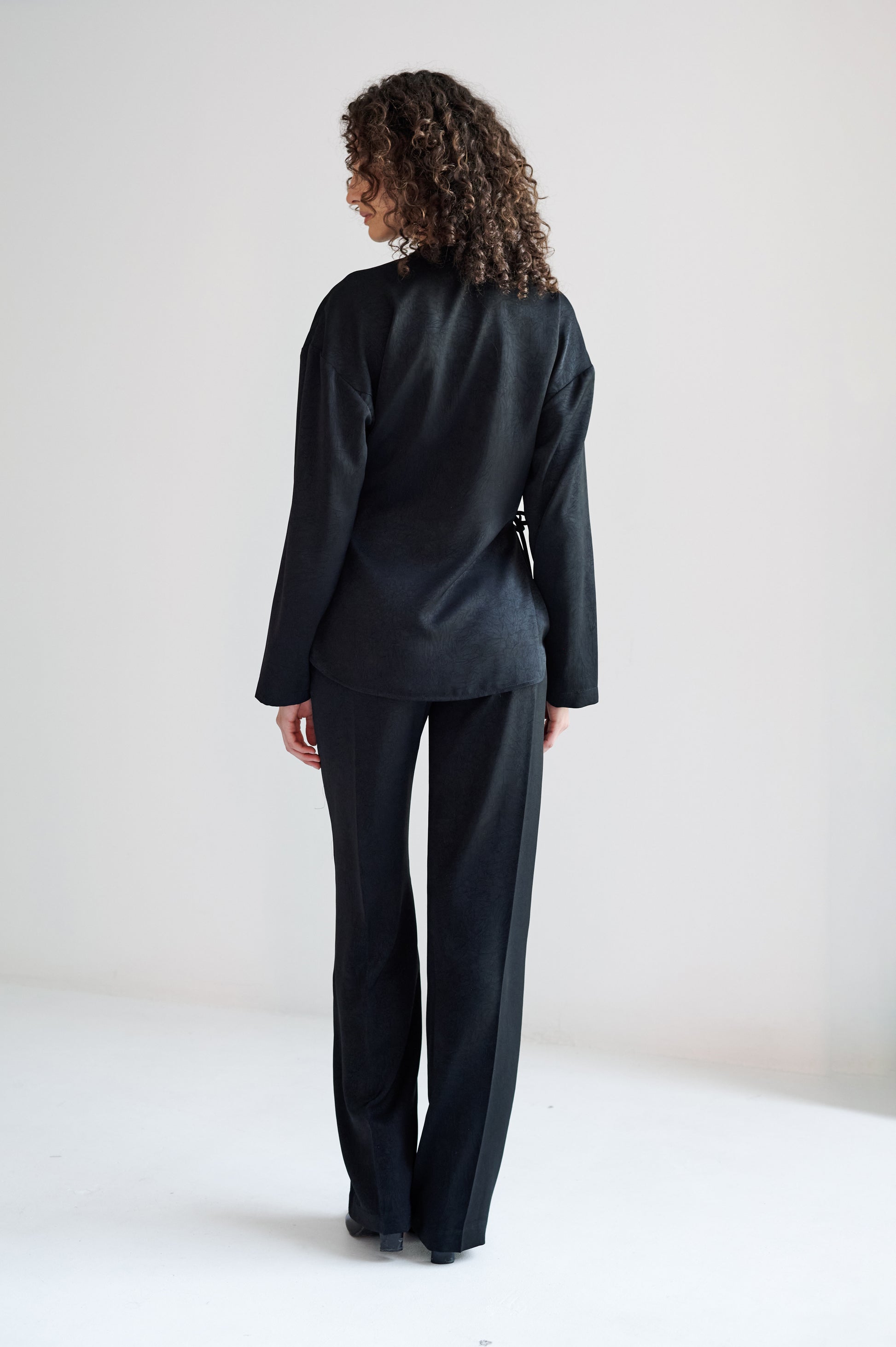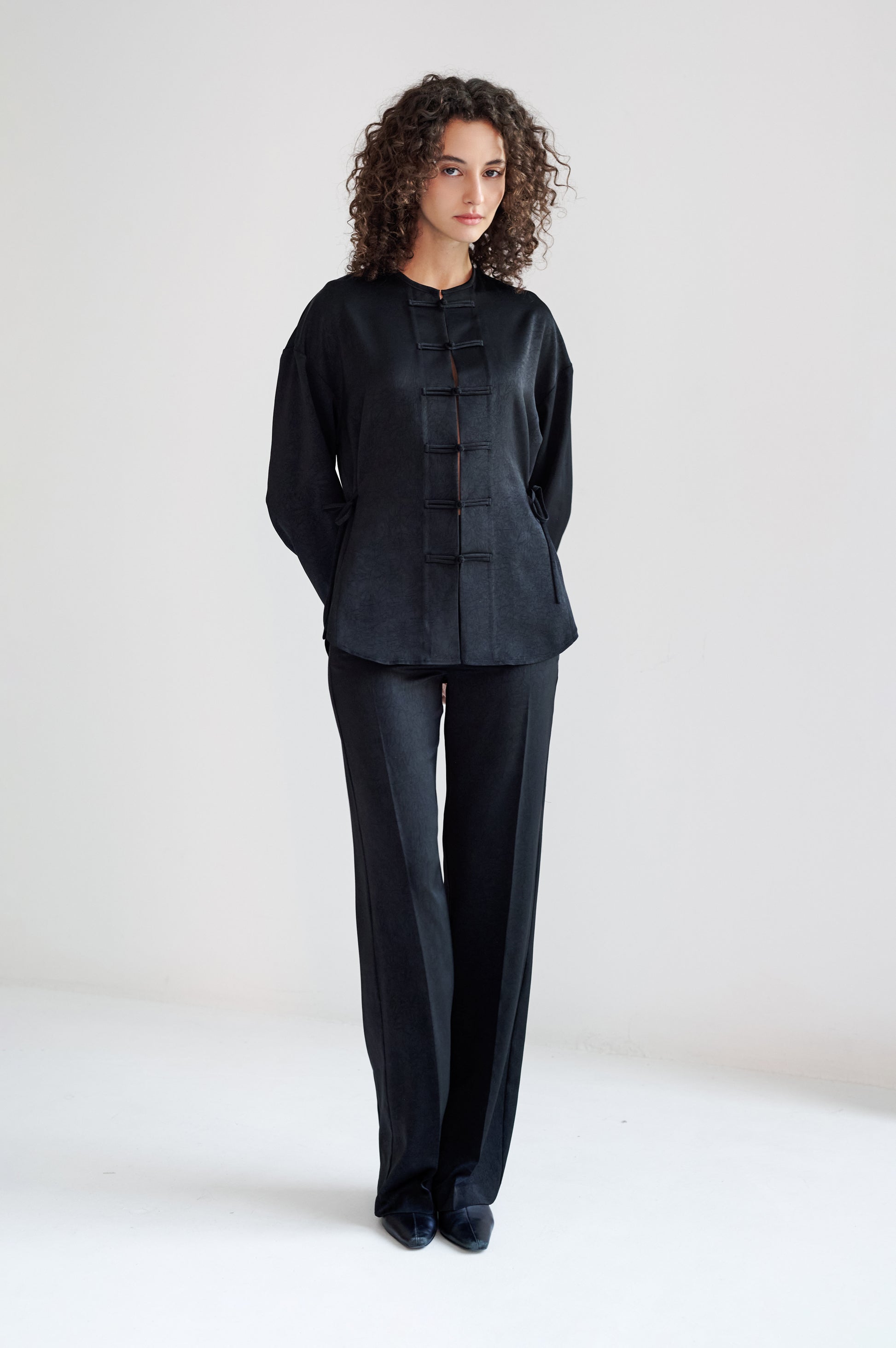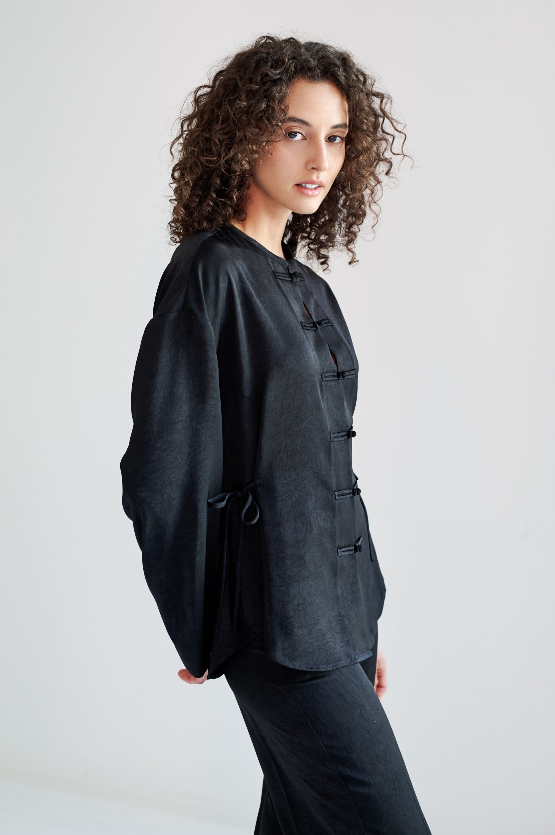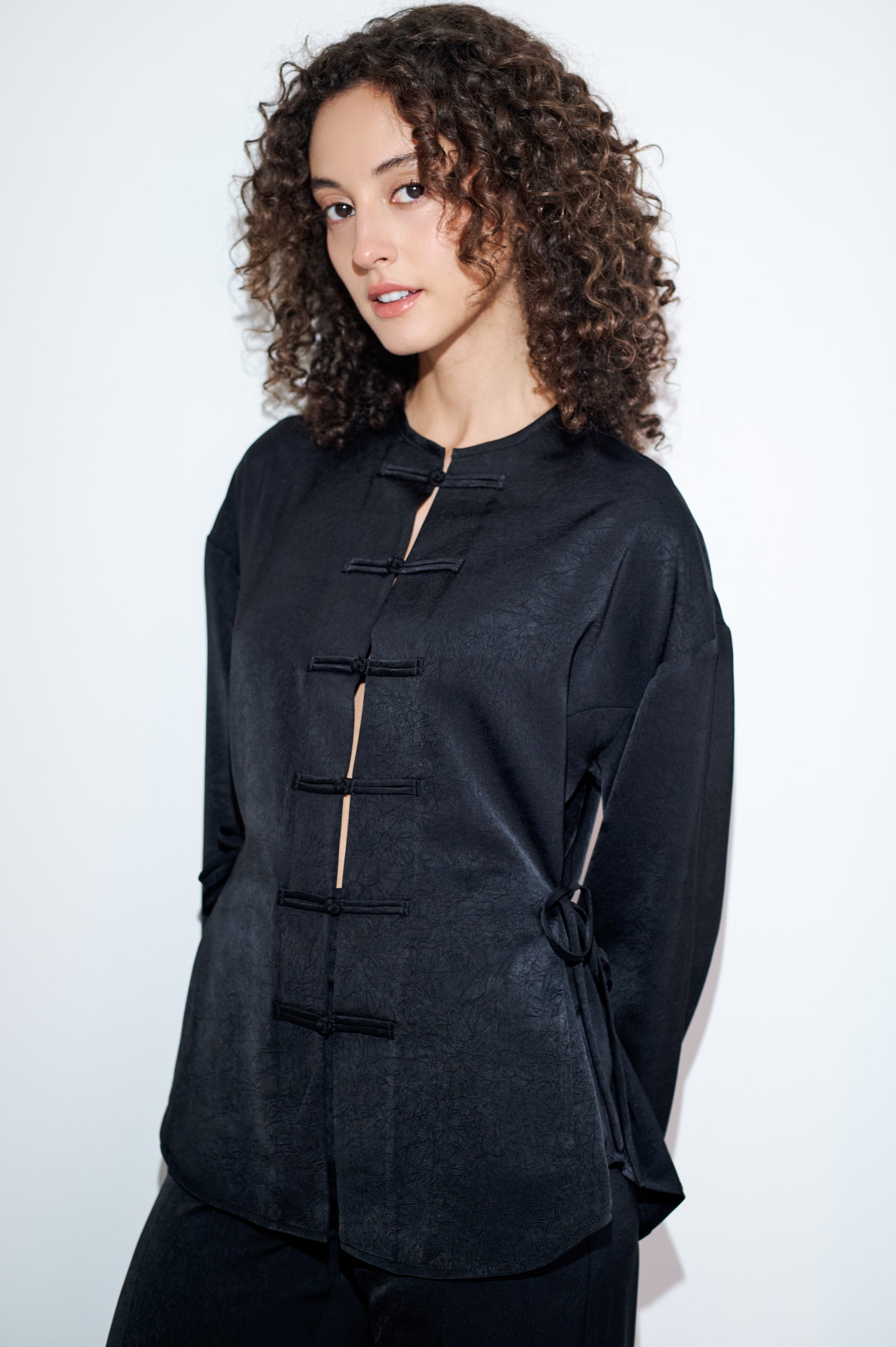 Top de manga larga con amarres laterales integrados y alamares al frente.