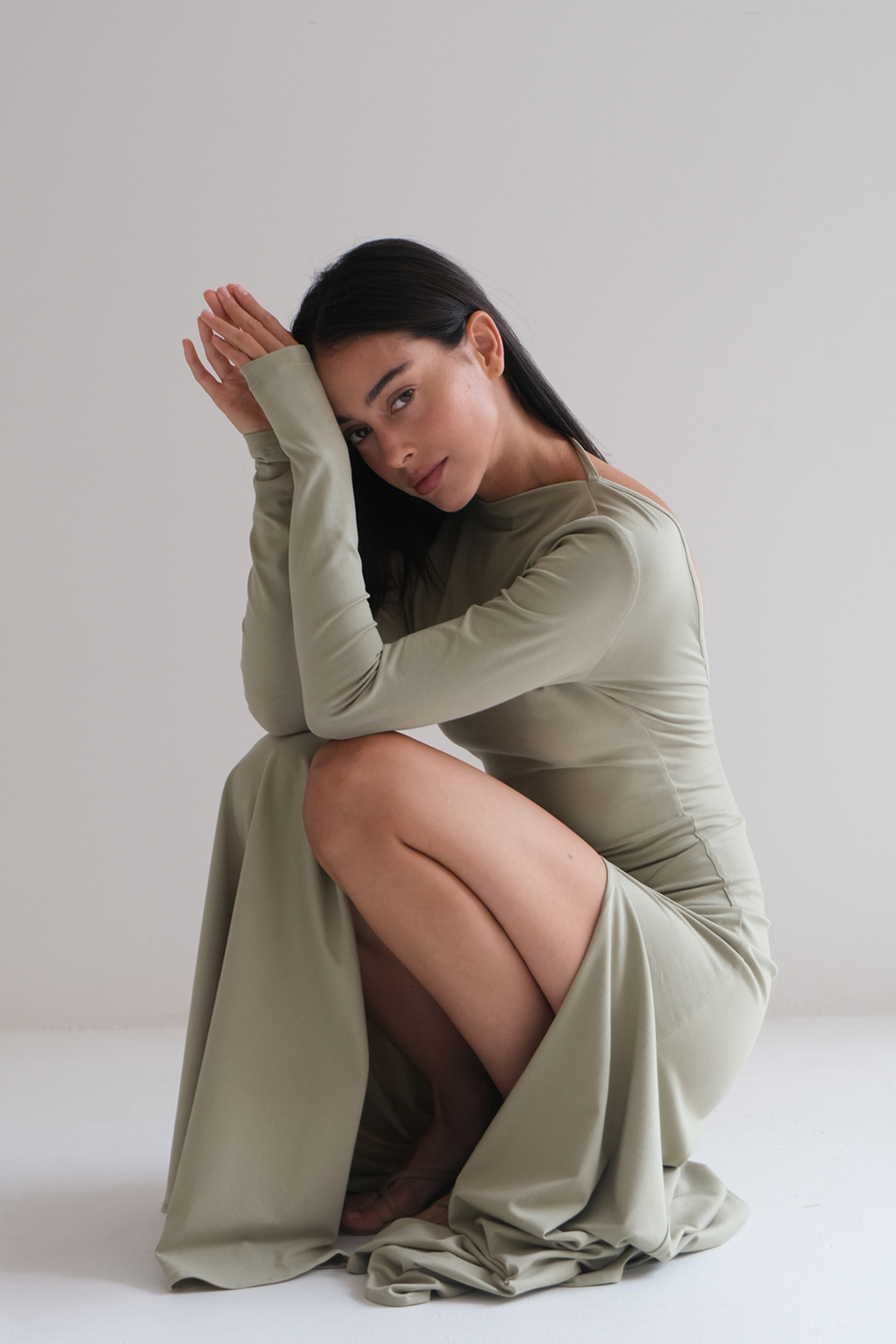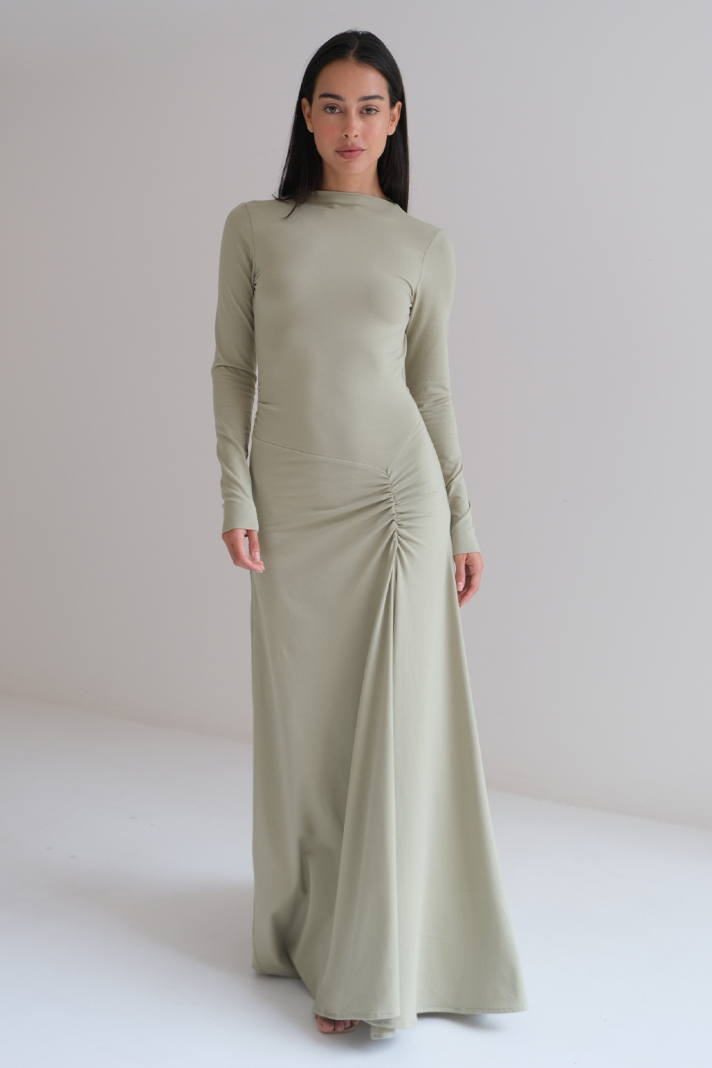 ⁠Vestido ajustado de manga larga, drapeado frontal, cuello alto y espalda descubierta.