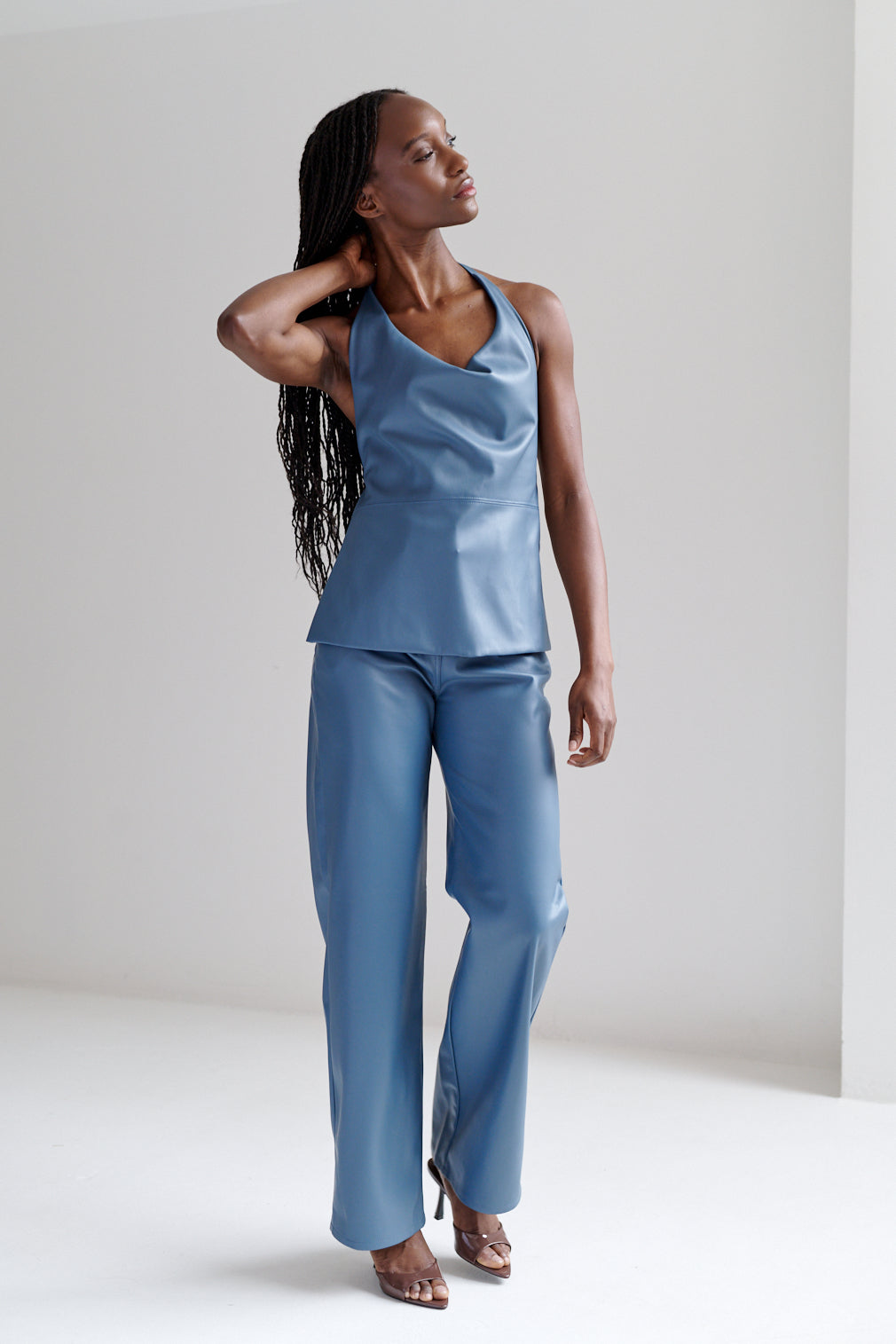 Top halter de piel vegana con escote en la espalda y cintura ajustable.