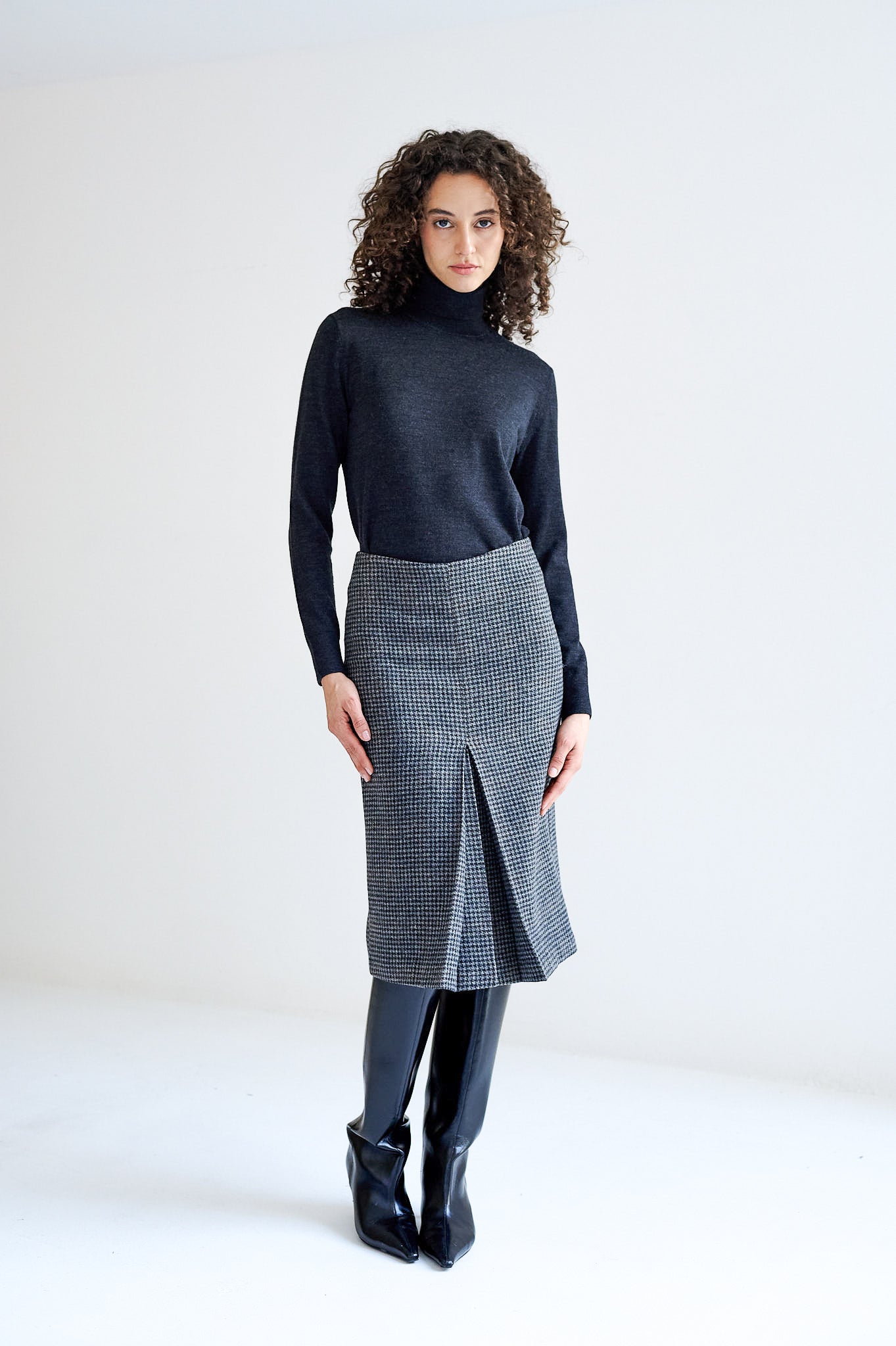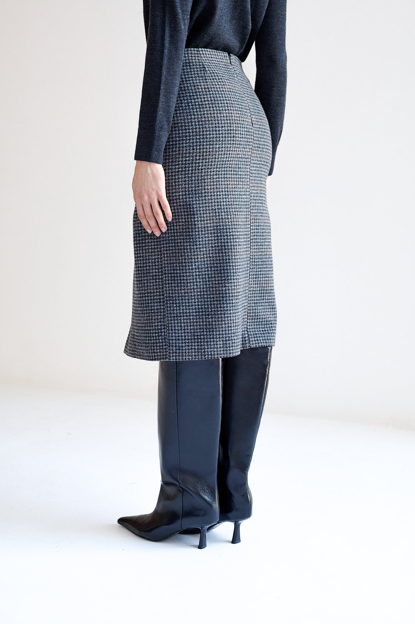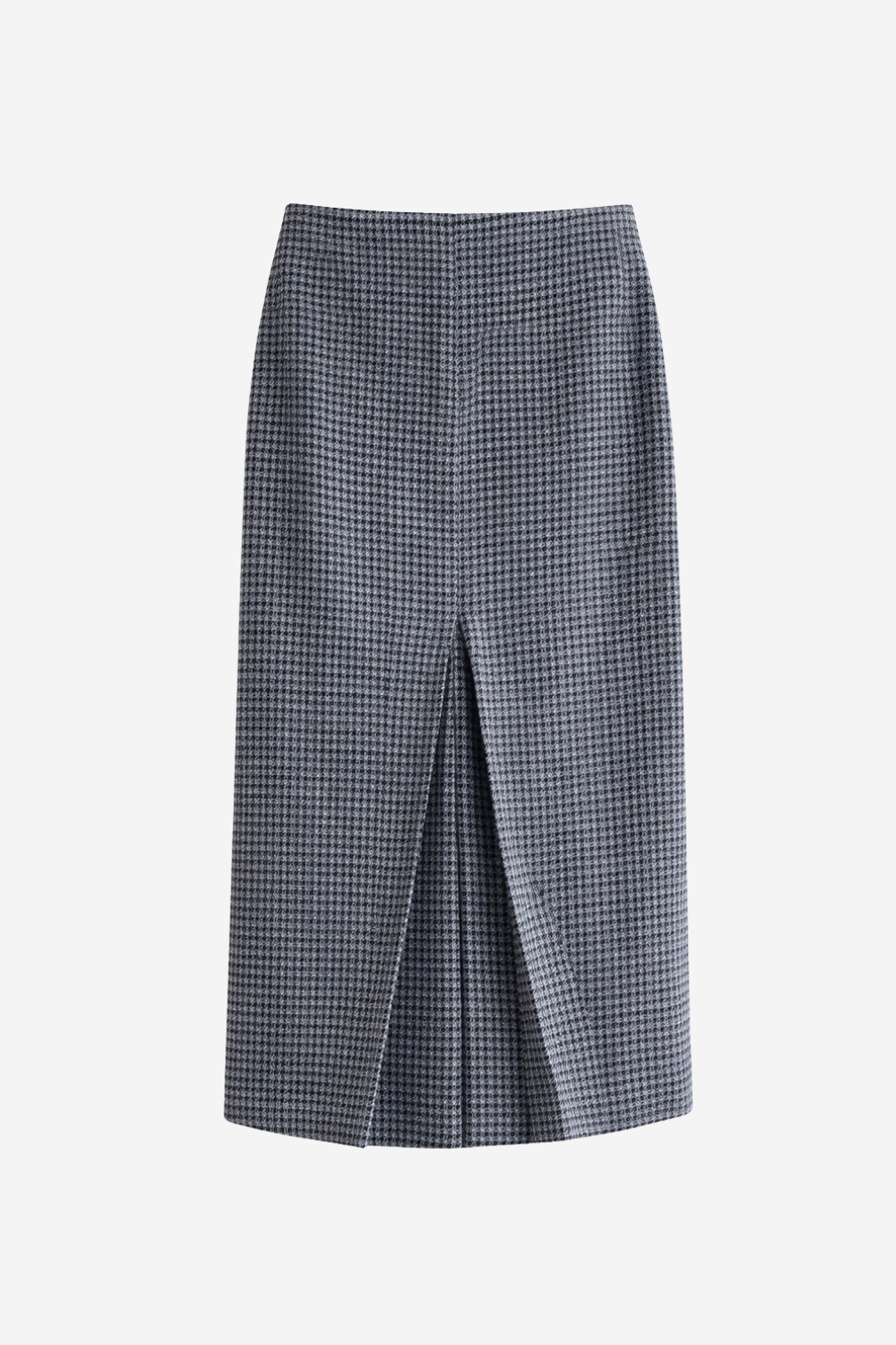 Falda midi recta de corte limpio, confeccionada en tejido de cuadros.Diseño de tiro alto con pretina estructurada y abertura frontal que aporta movimiento.