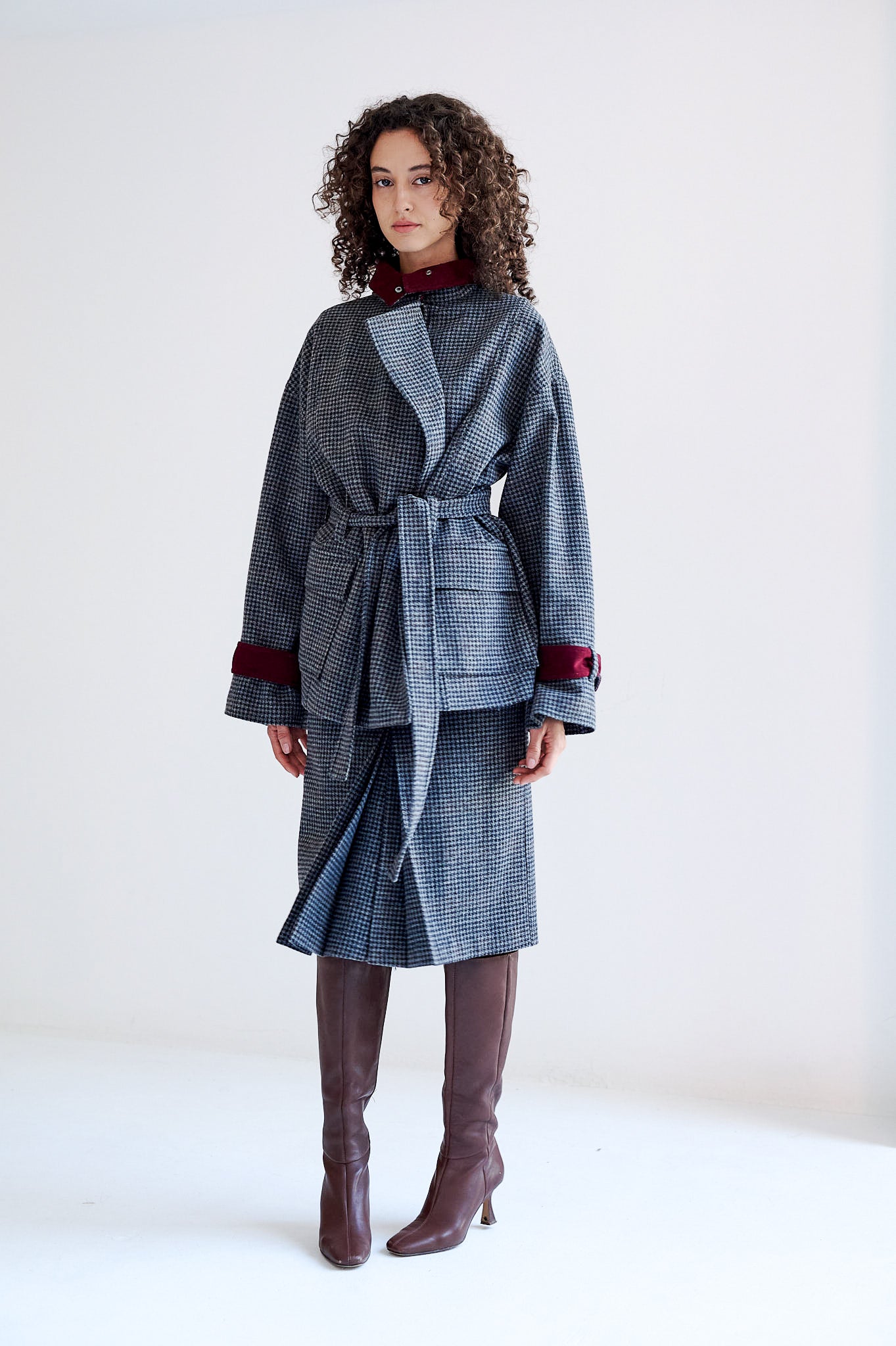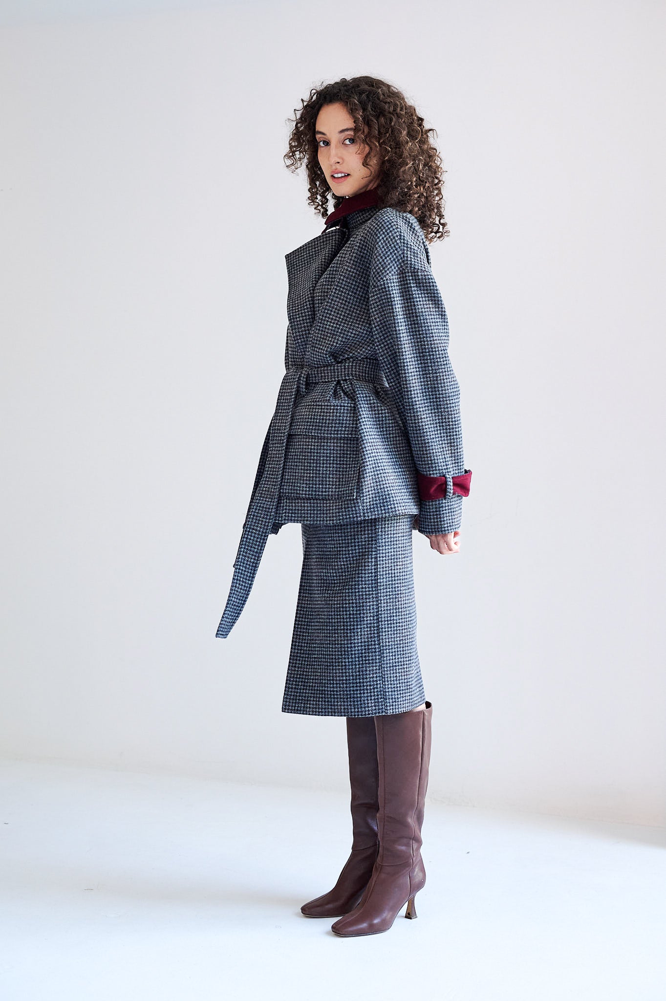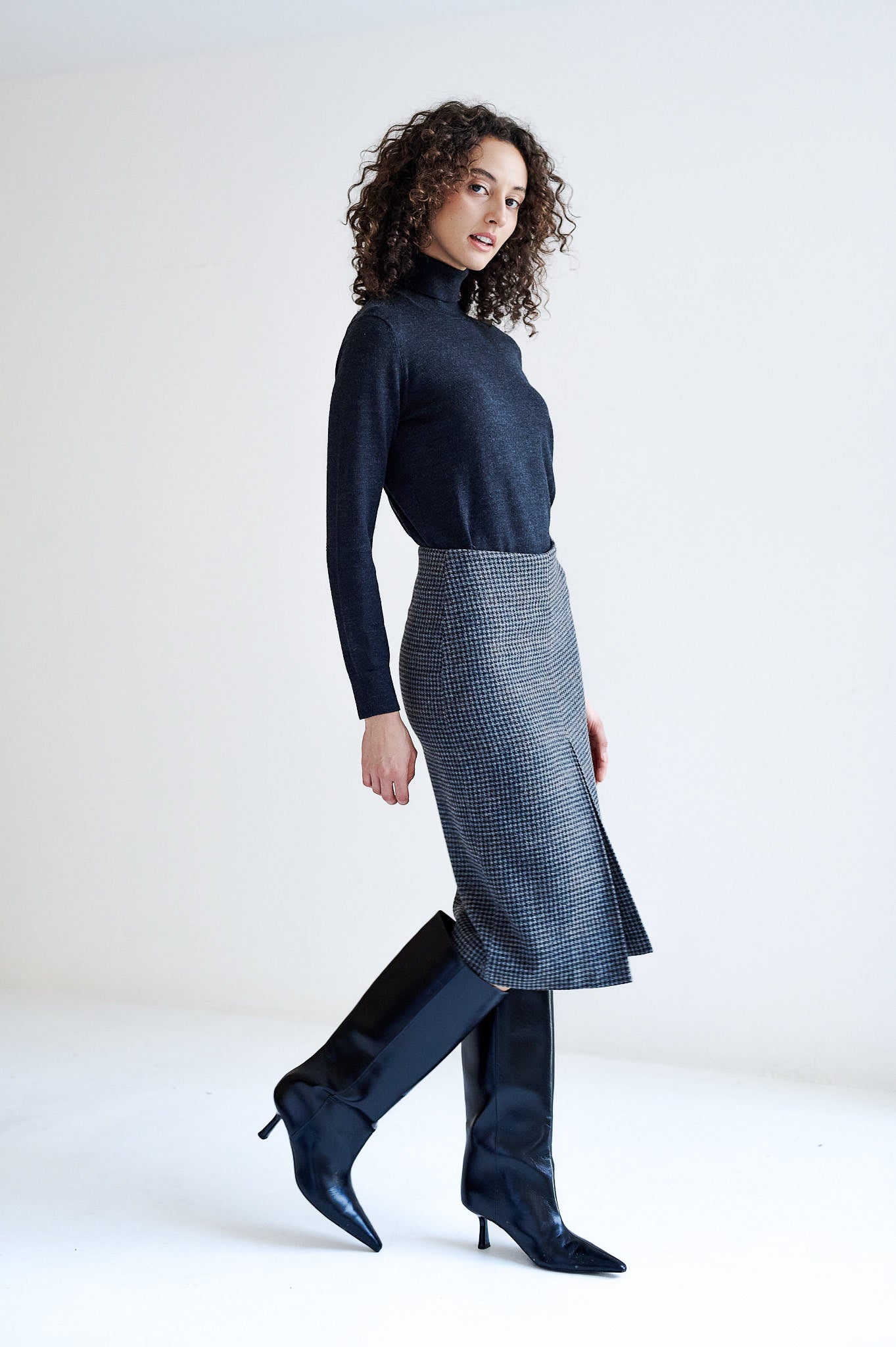 Falda midi recta de corte limpio, confeccionada en tejido de cuadros.Diseño de tiro alto con pretina estructurada y abertura frontal que aporta movimiento.