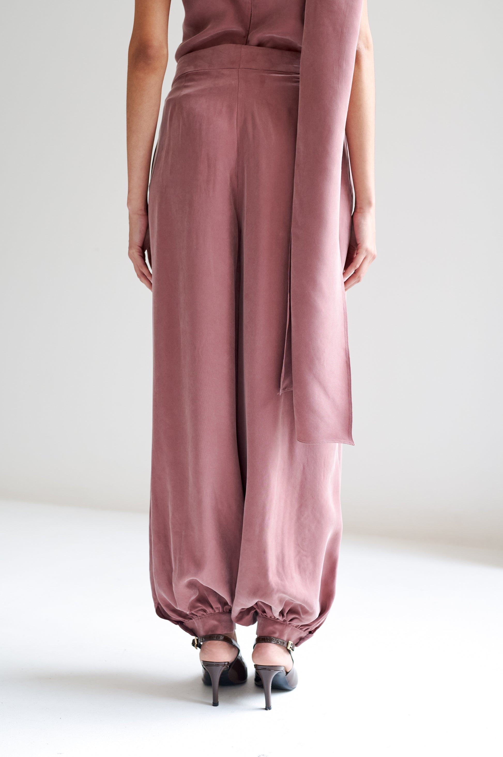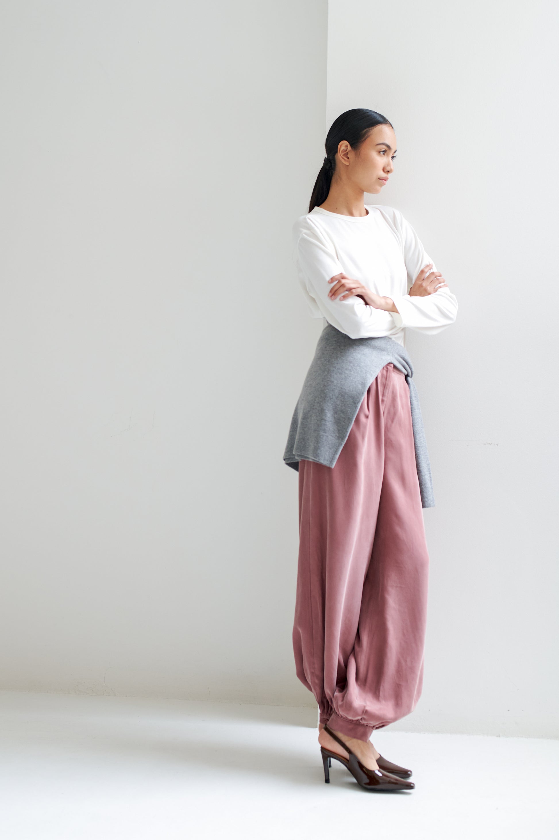 Pantalón de silueta globo con pretina fija y ajuste regulable en el tobillo para definir el volumen según el estilo.