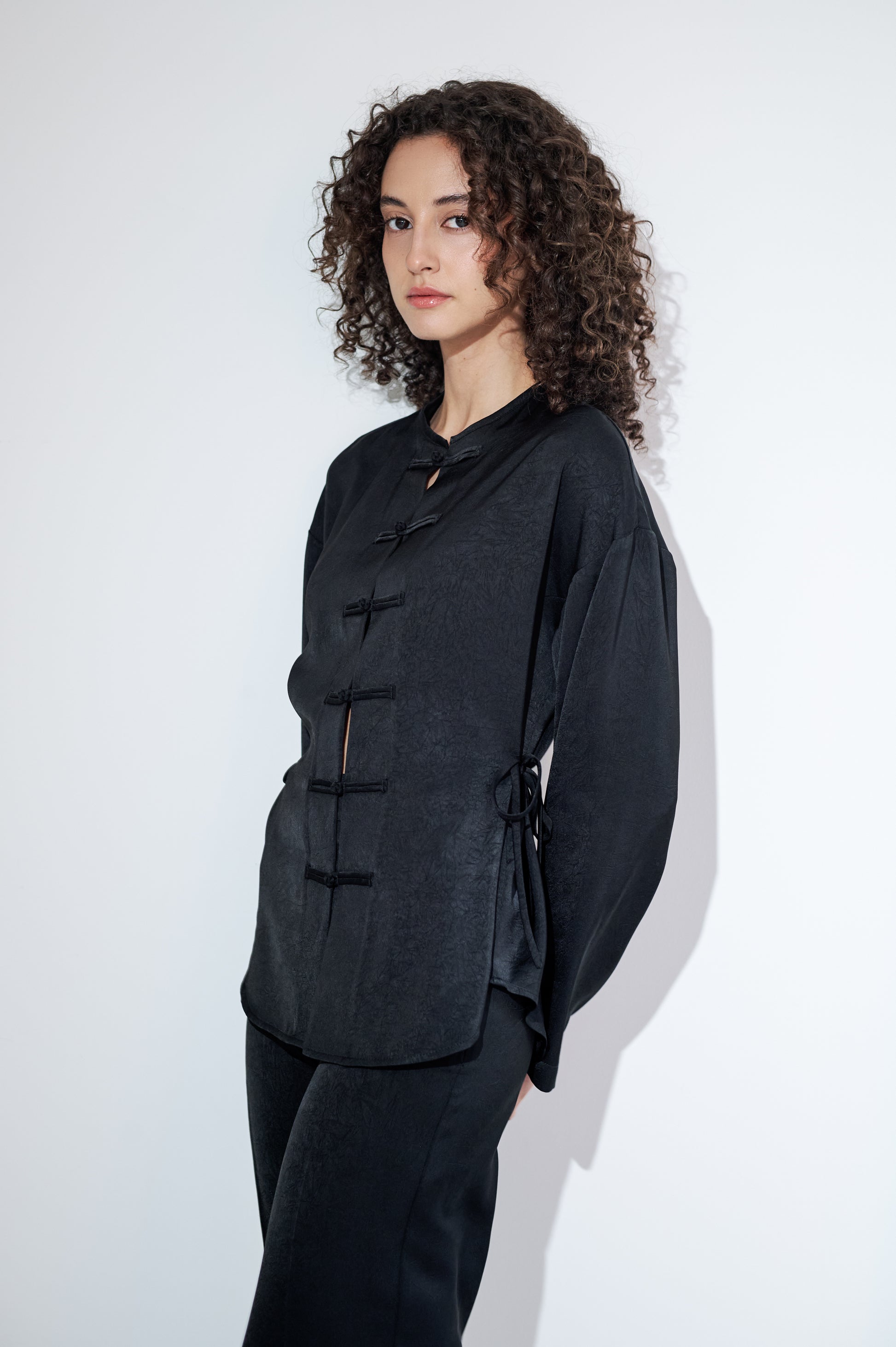 Pantalón de vestir con alamares en el costado delantero para cerrar.
