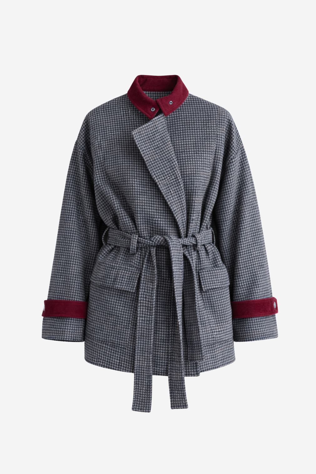 Saco tipo abrigo con cinturón. Detalle de puños y cuello en contraste.Silueta relajada con ajuste mediante cinturón.
