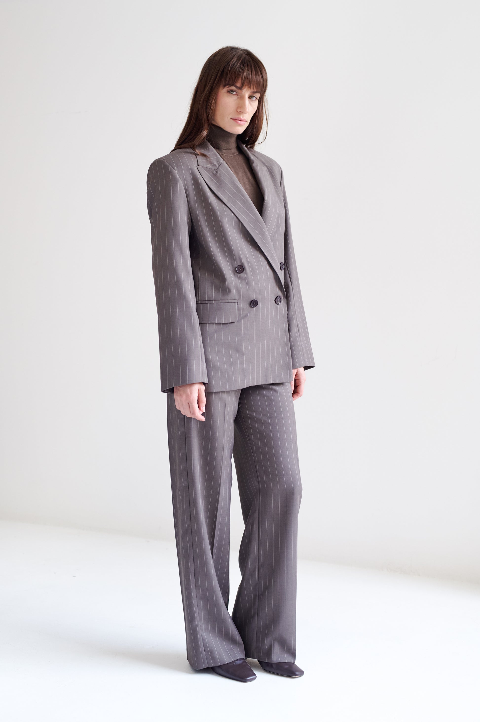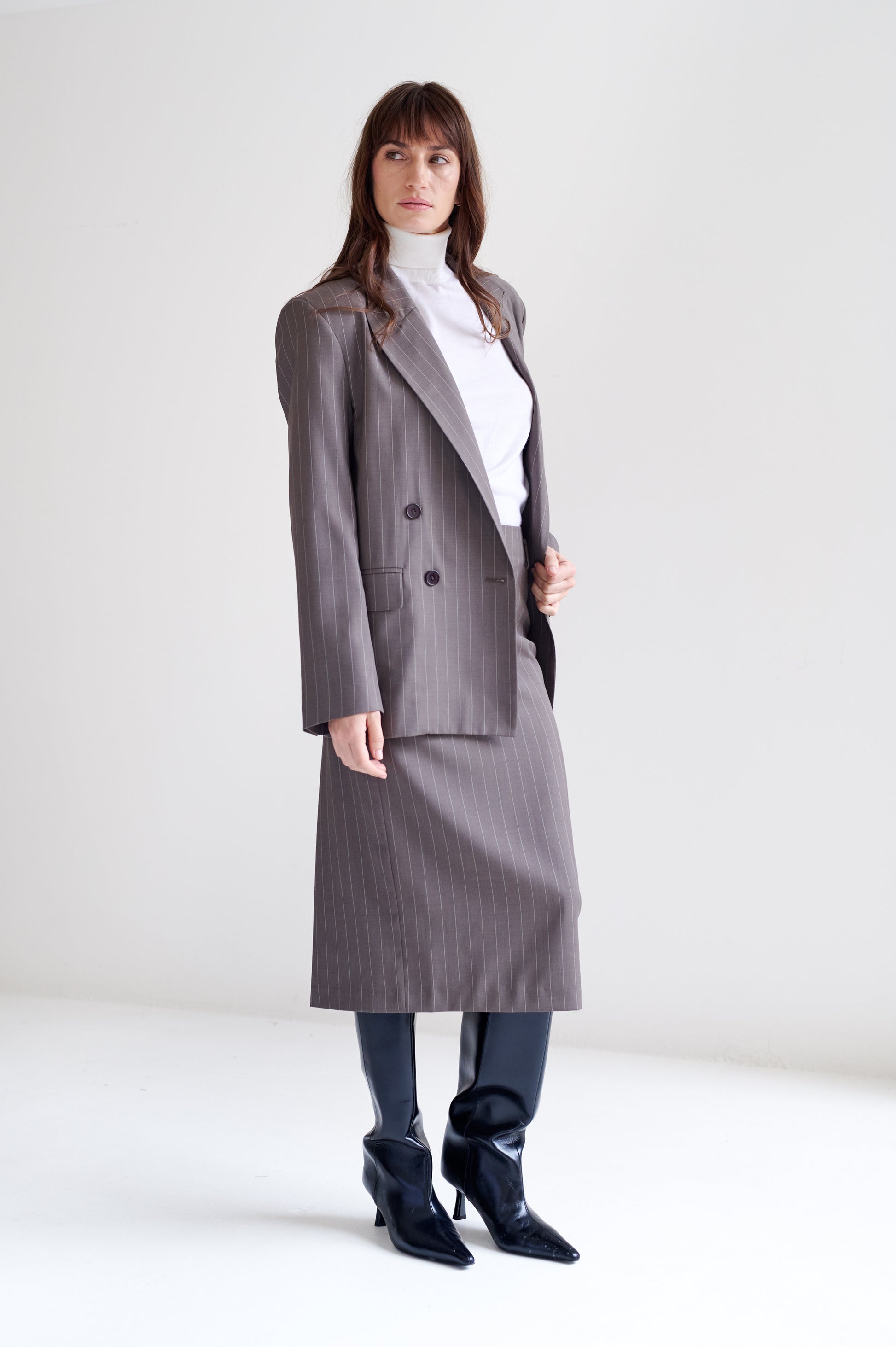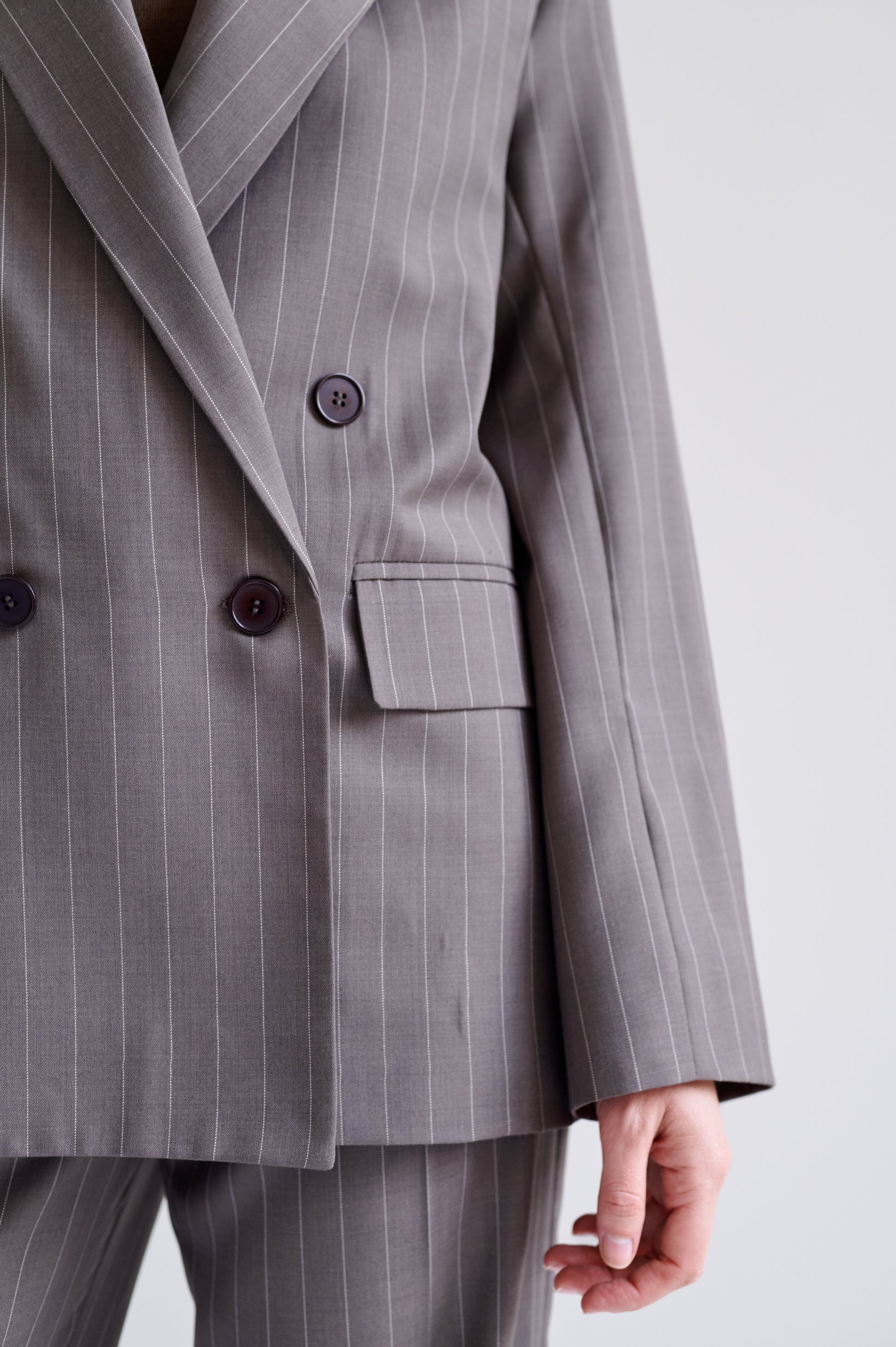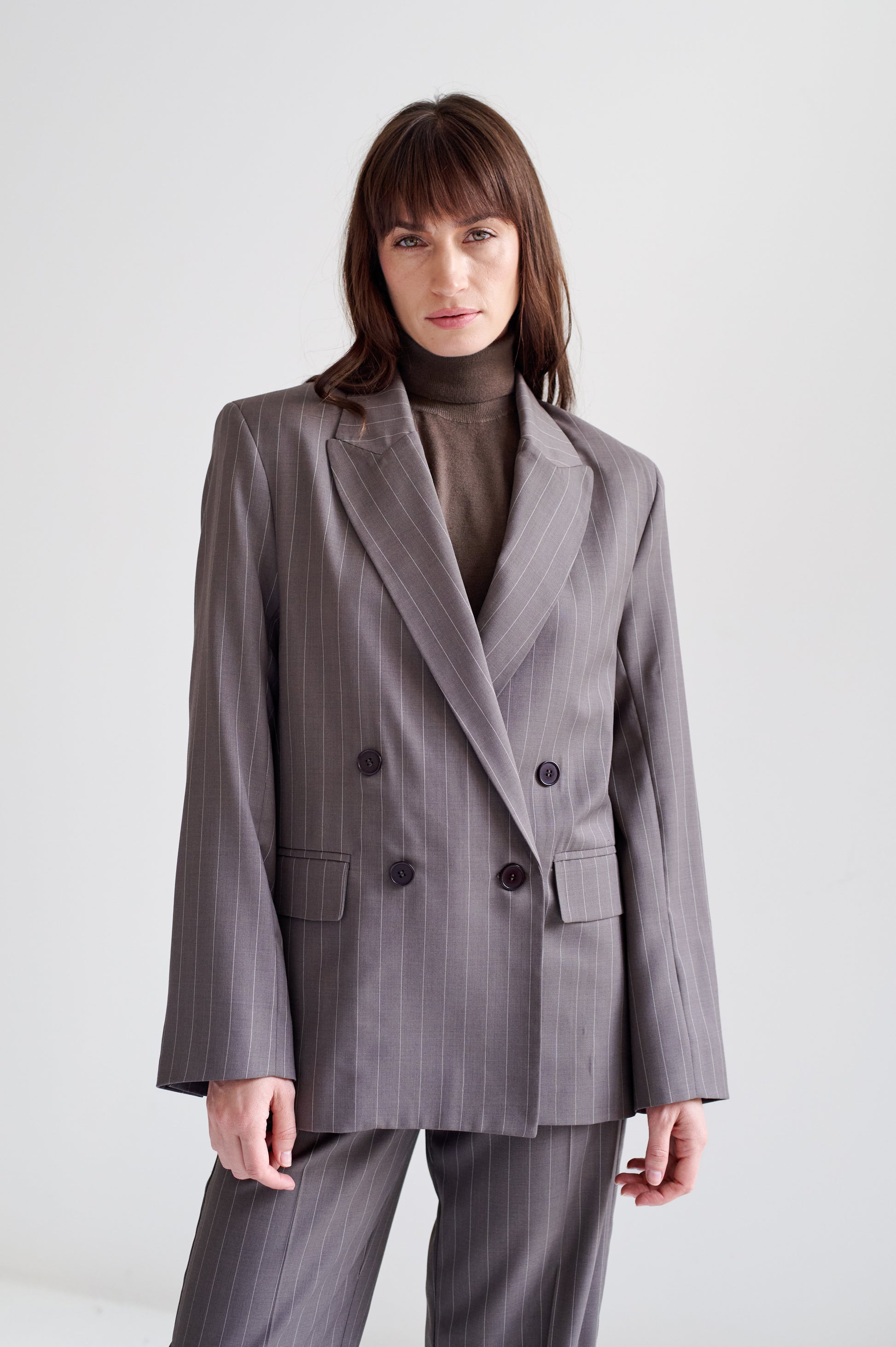 Saco de silueta recta, confeccionado en tela de sastrería con patrón de raya diplomática. Diseño de cruce doble con solapas clásicas, cierre de botones al frente
