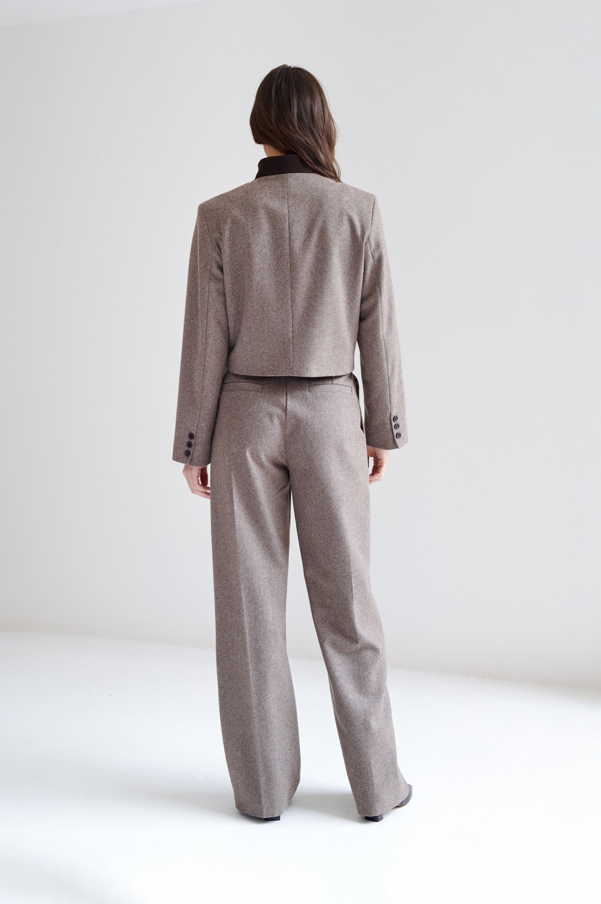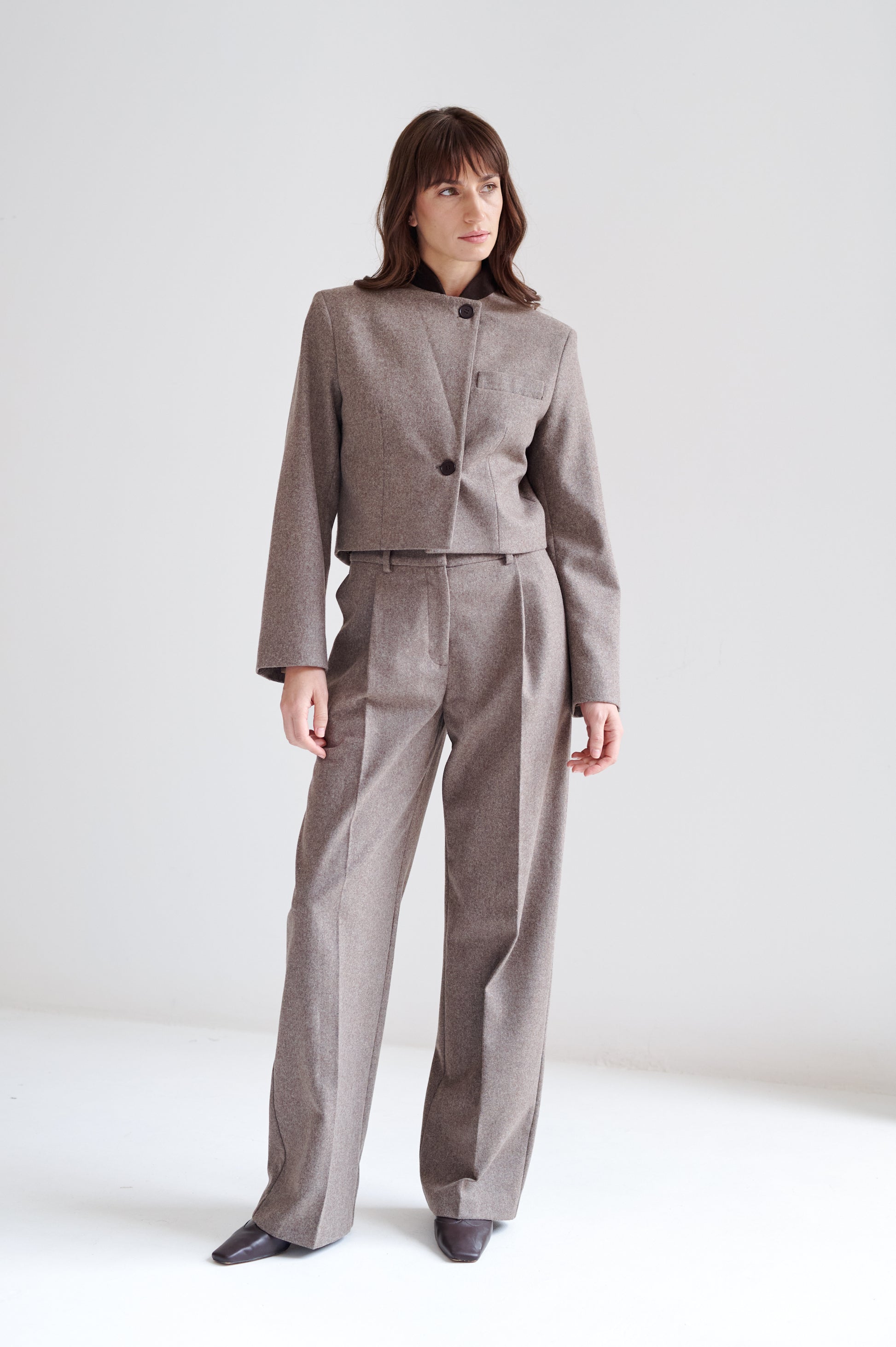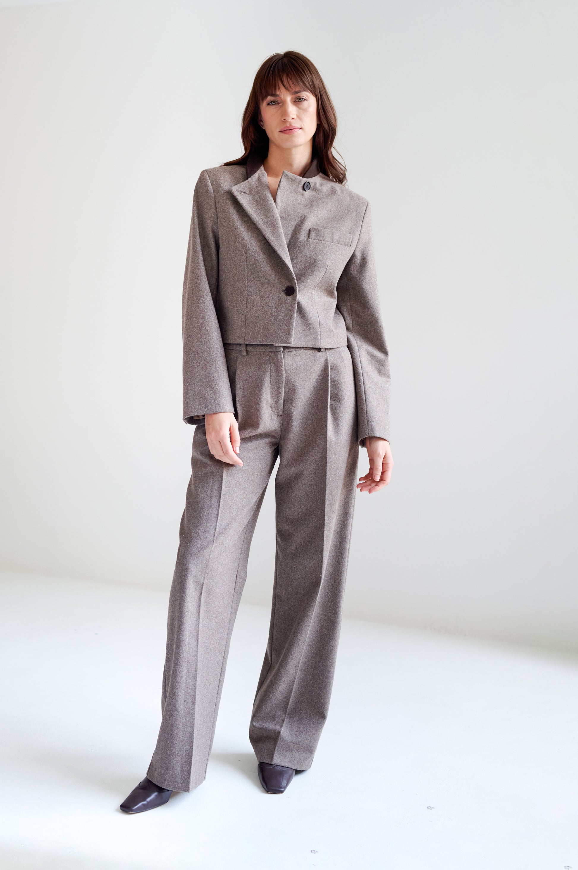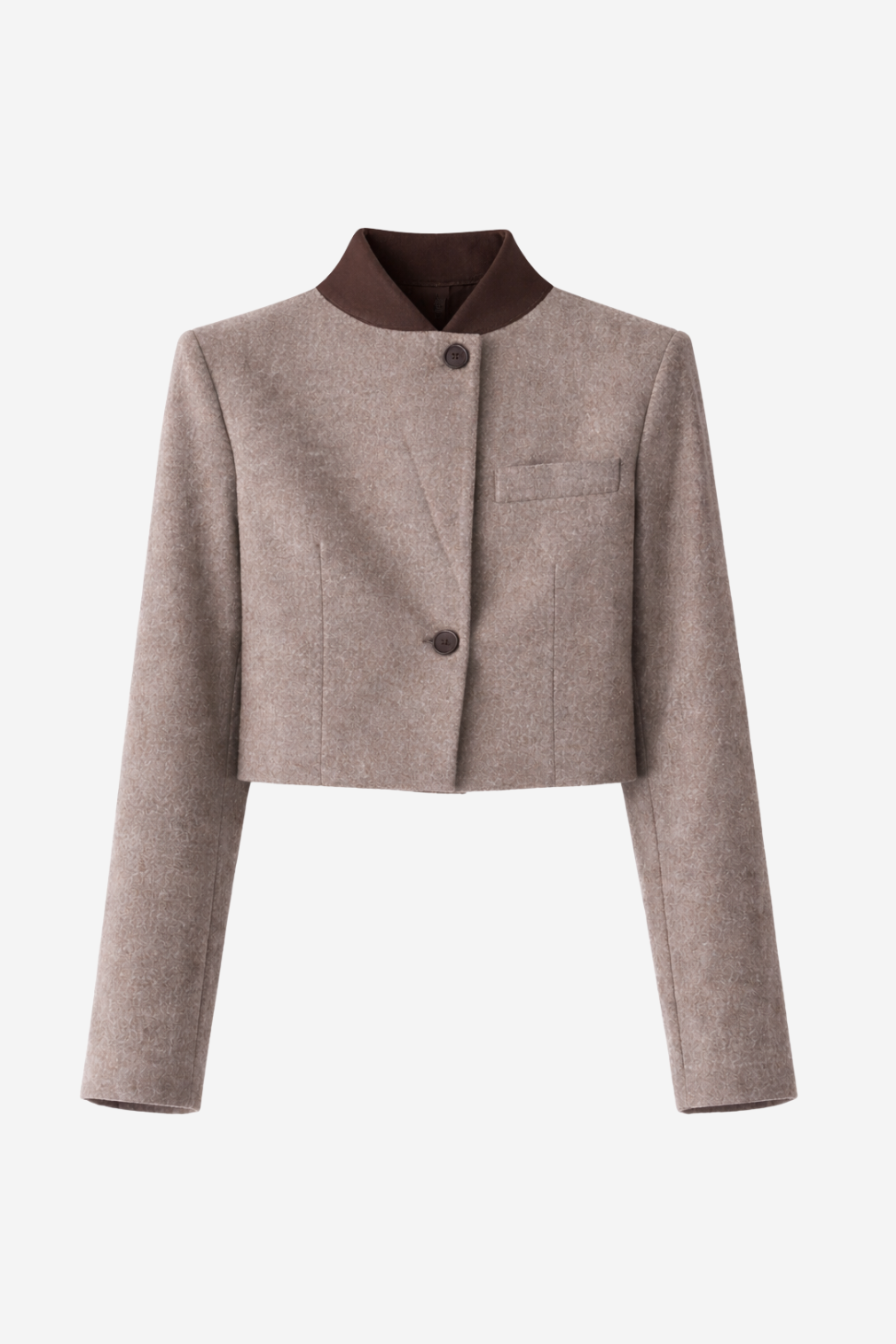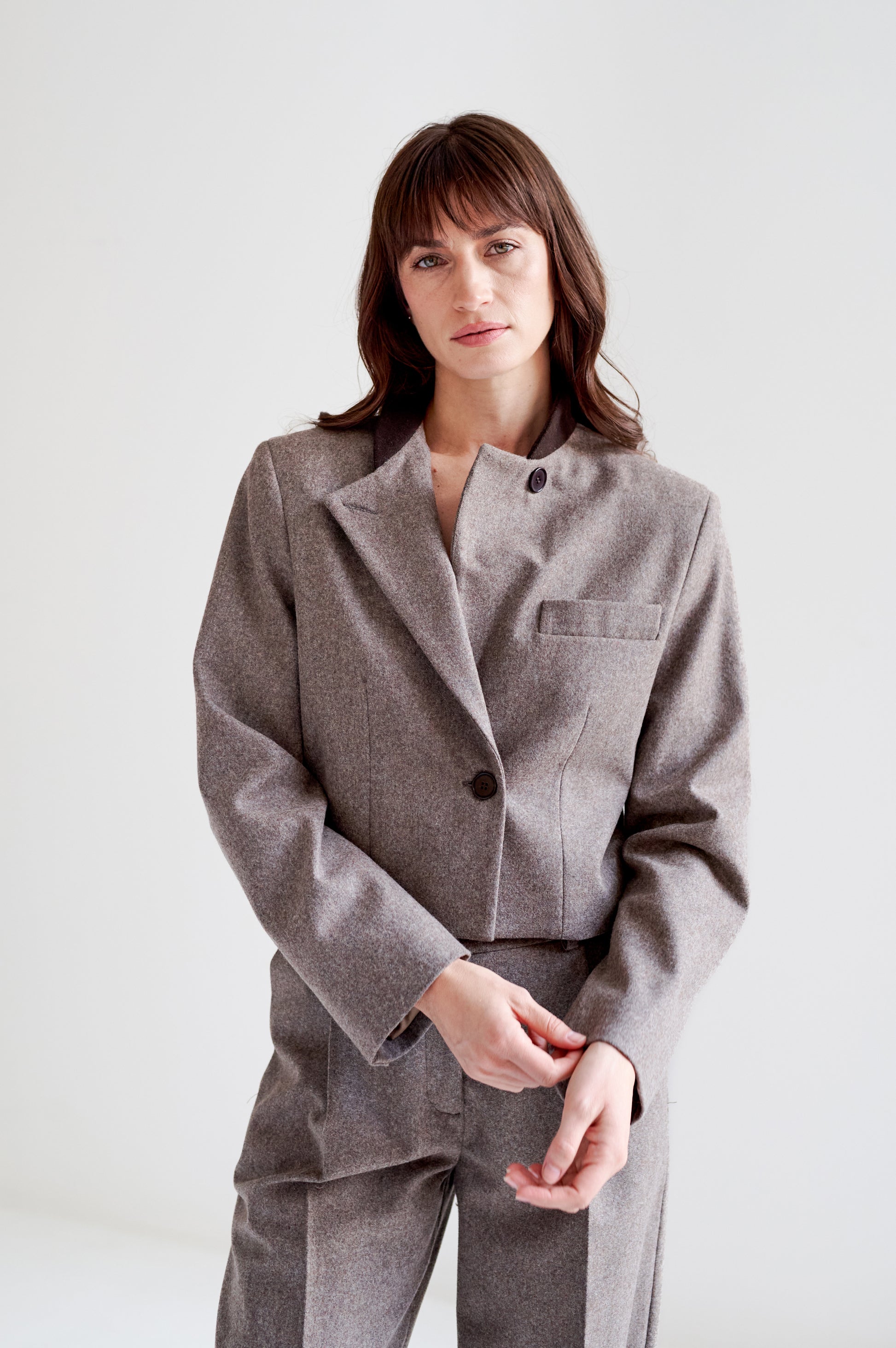 Saco corto de lana con botones frontales y fit recto. Puede llevarse cerrado al frente o con la solapa abierta