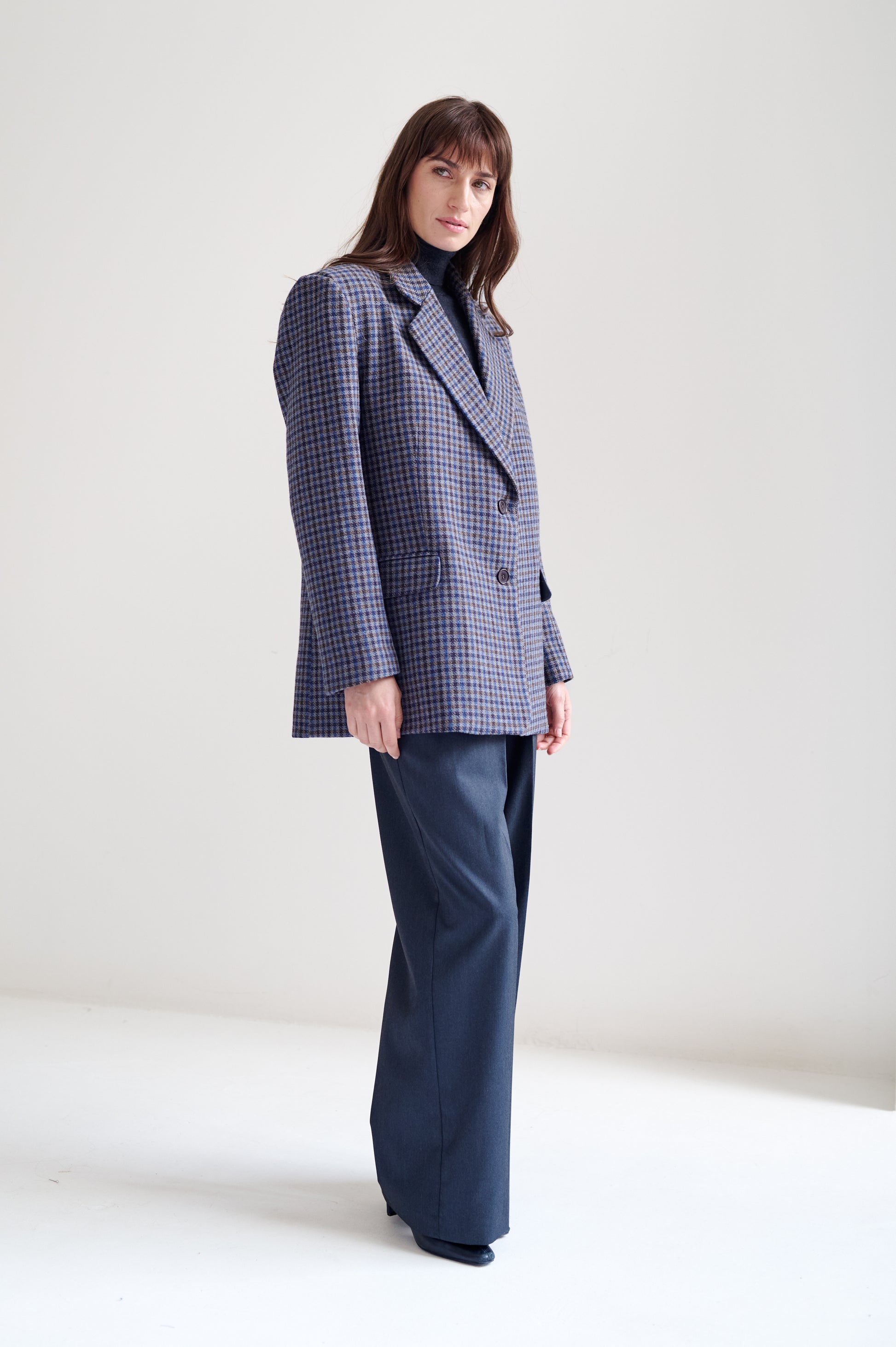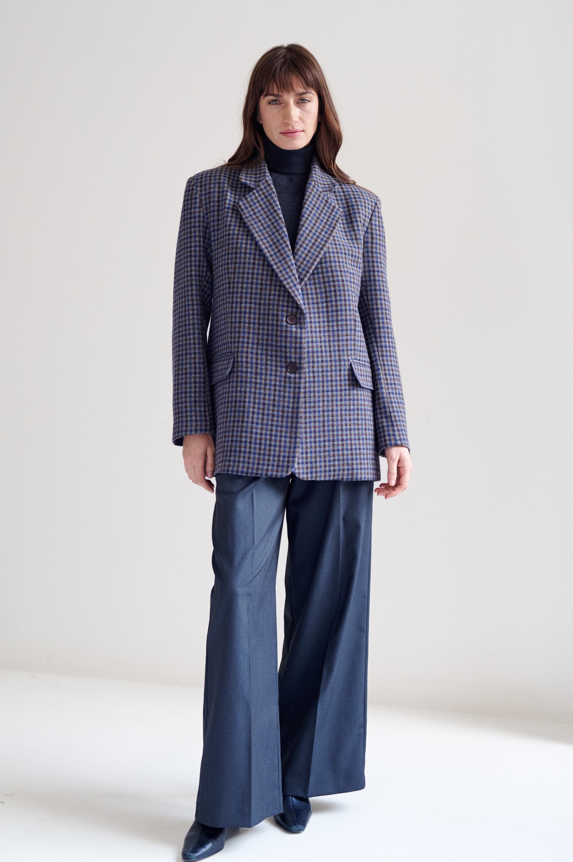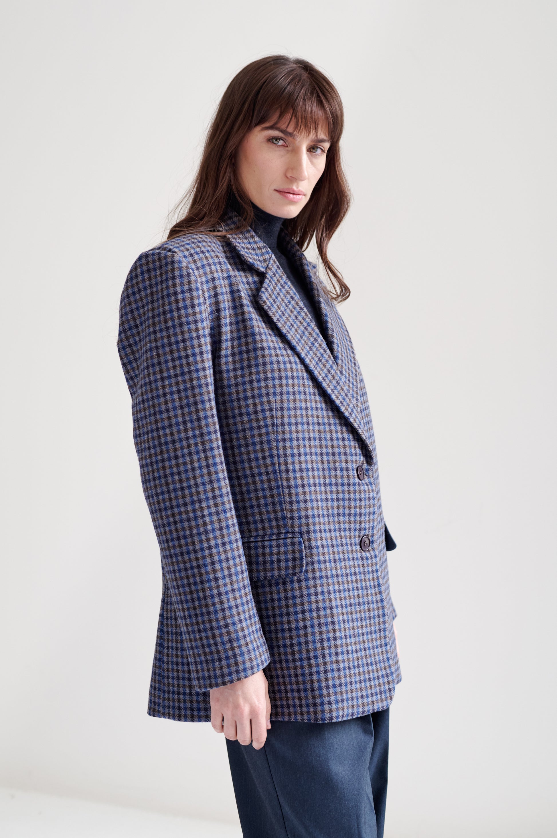 Saco de lana con patrón pata de gallo. Fit recto y ligeramente oversized. Diseño de largo medio, con cierre de botones al frente y solapas tradicionales.