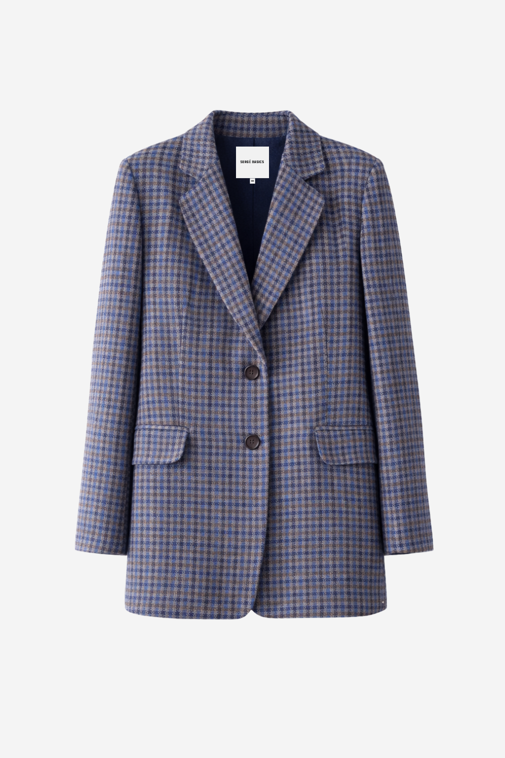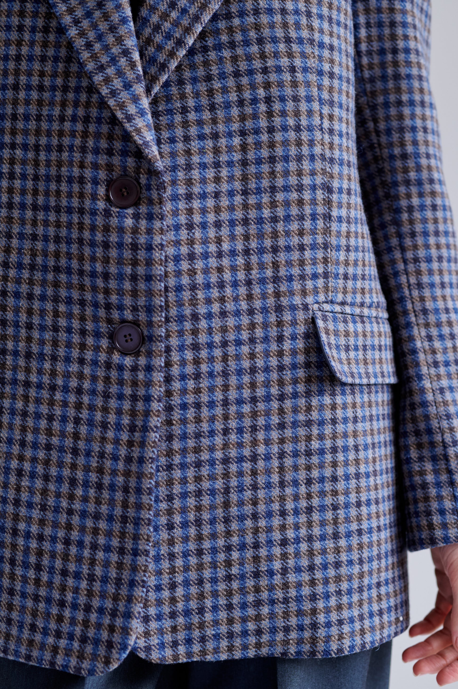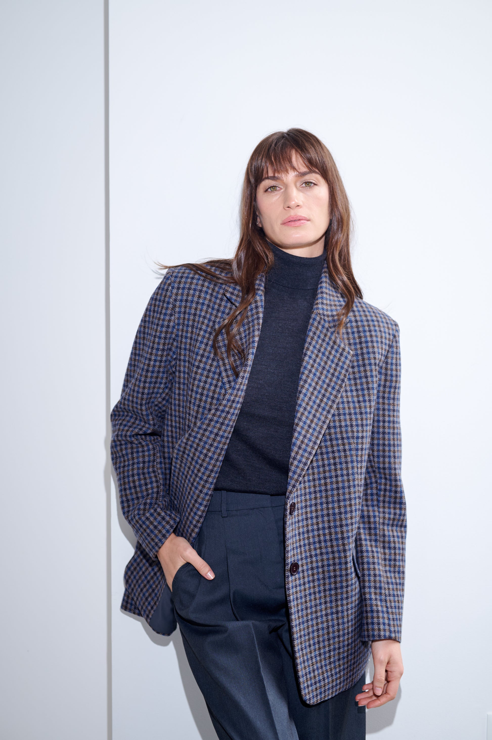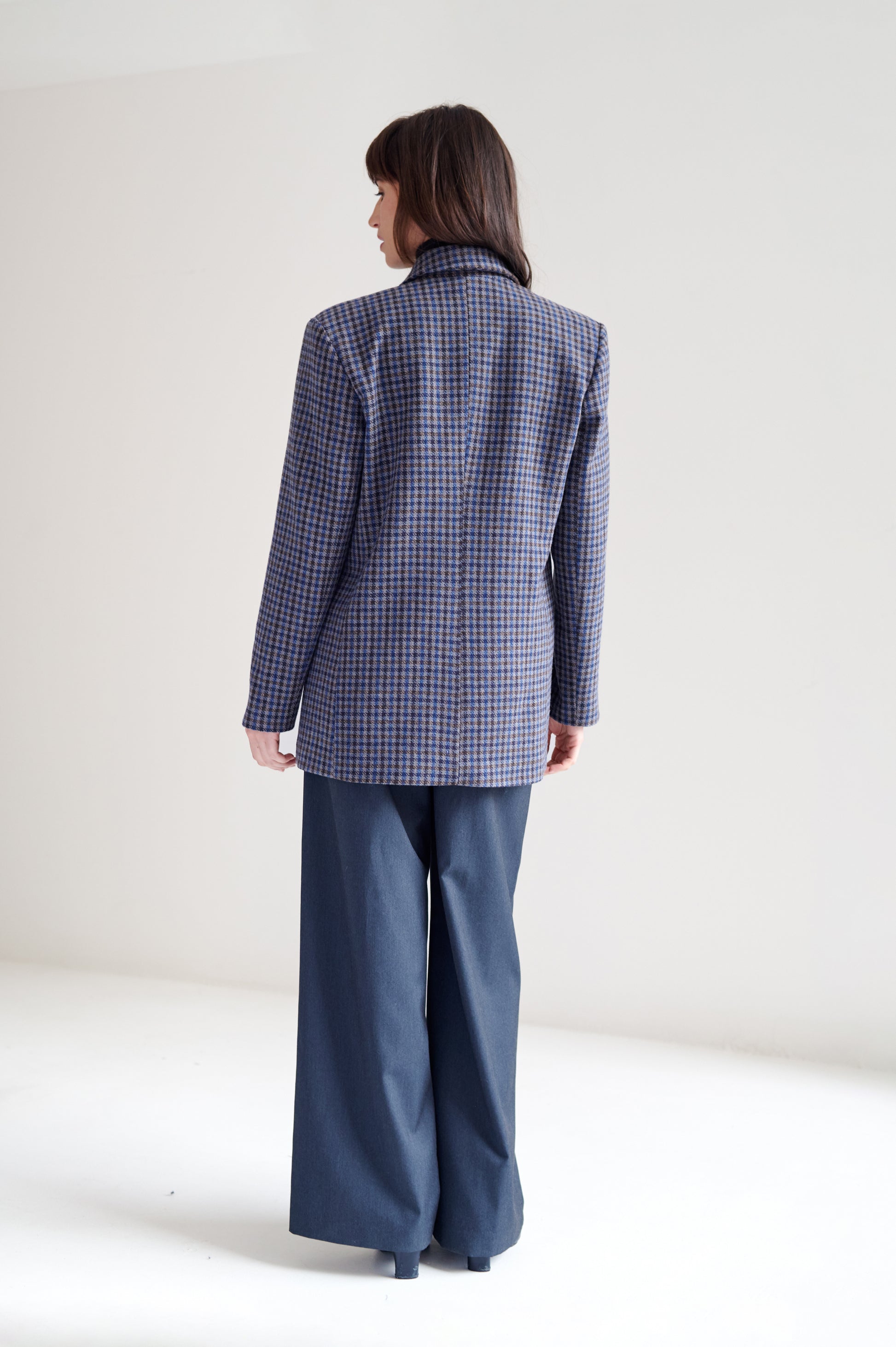 Saco de lana con patrón pata de gallo. Fit recto y ligeramente oversized. Diseño de largo medio, con cierre de botones al frente y solapas tradicionales.